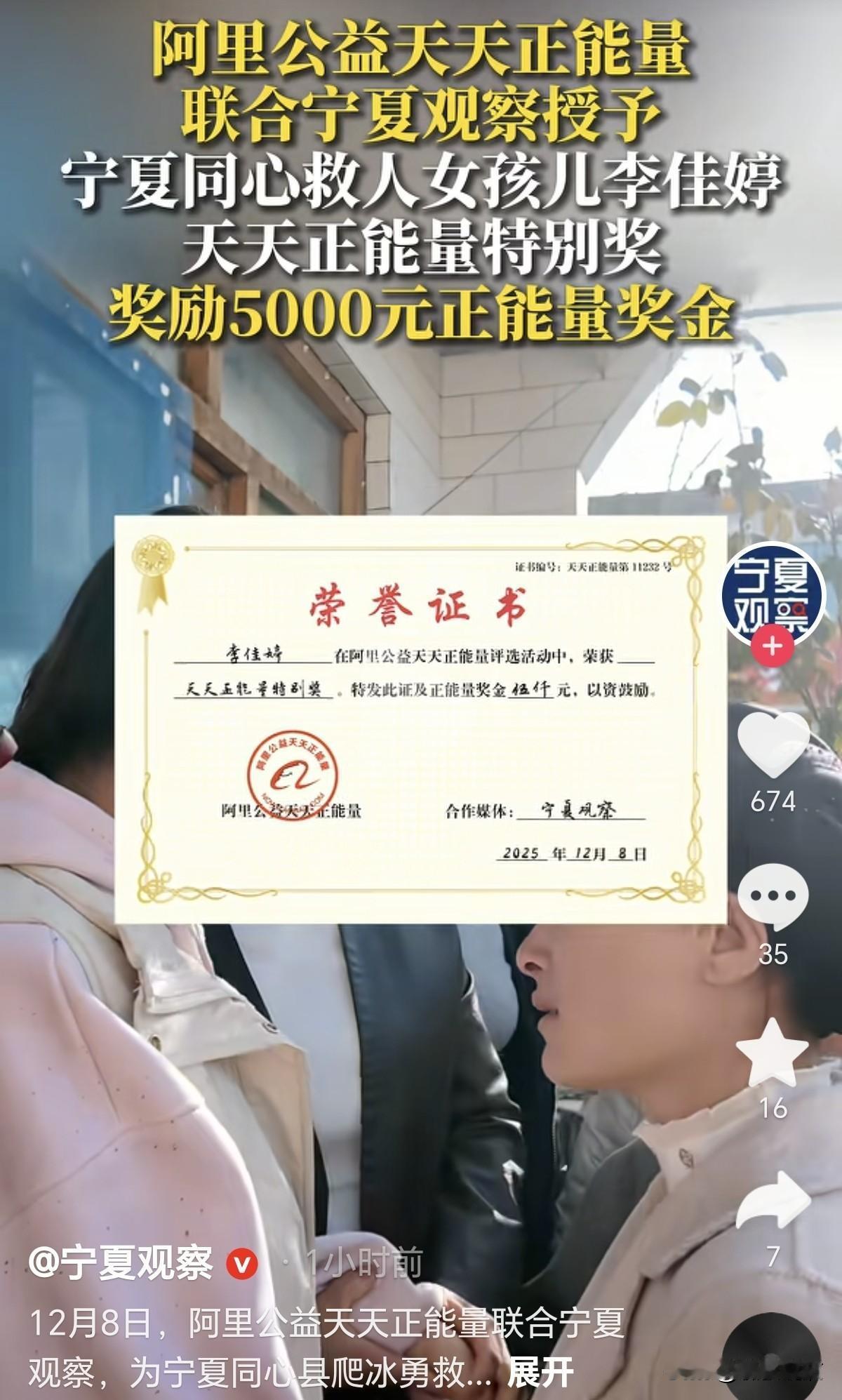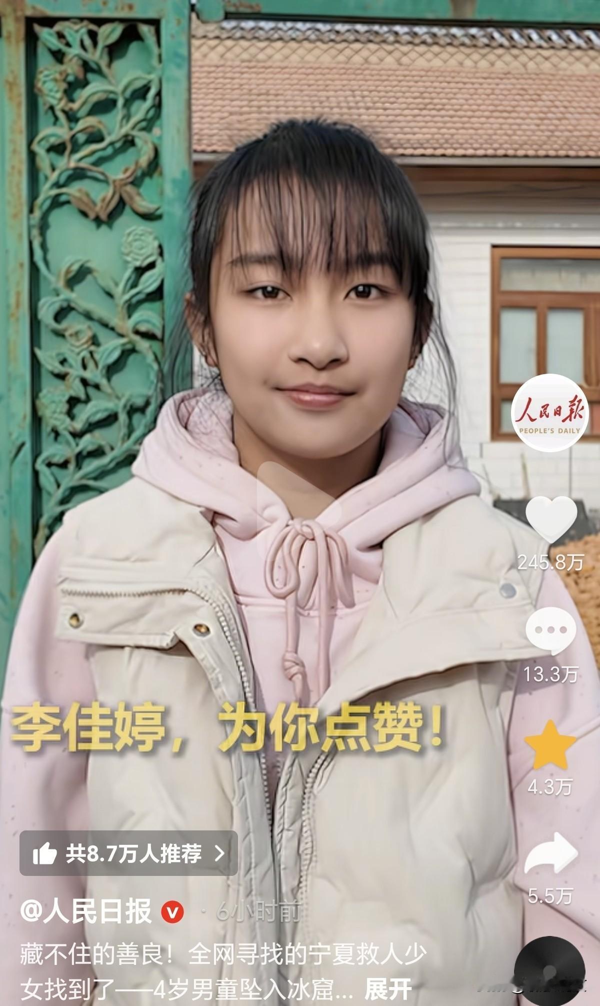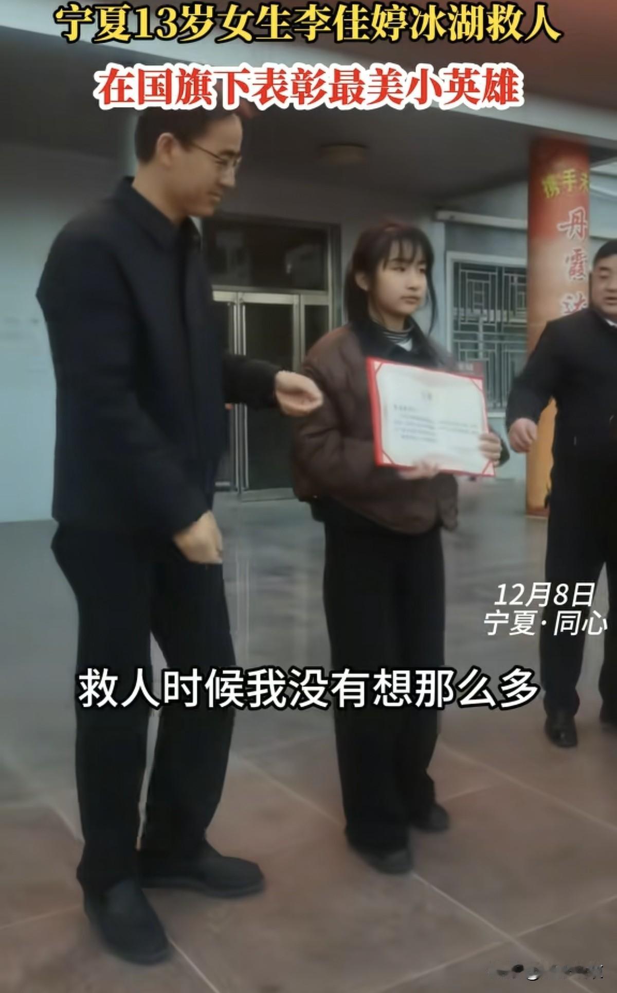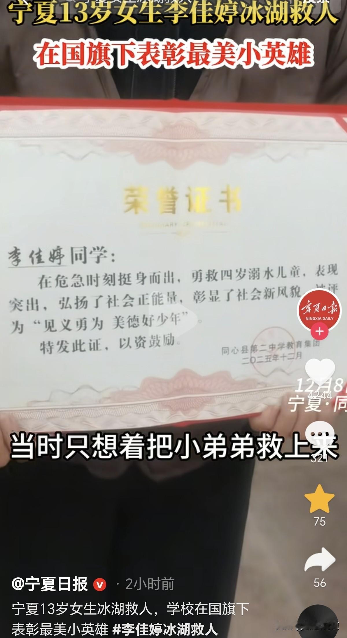 人民日报点赞!冰窟救人女孩后续:国旗下表彰,阿里奖励5000元![嘘] 近日,网上“宁夏4岁男童掉入冰窟,13岁女孩参与救人后默默离开”的事件,引发了网友的关注。 女孩回家后怕父母担心,并未说出实情,谎称“衣服被洒水车淋湿”。 最近在宁夏,一个13岁女孩做的事让很多人竖起了大拇指,她叫李佳婷,是个初一学生。那天她路过一个湖边,看到冰面上有个小男孩掉进水里了。 当时岸边站着不少人,大家都着急,可冰太薄,成年人不敢轻易下去,小男孩在水里挣扎,情况很危险,李佳婷这时候站了出来,她对男孩家长说:“阿姨,我比较轻,让我试试吧。” 她接过别人递来的塑料管,小心翼翼地踩着薄冰往湖中间走,靠近落水点后,她直接跳进了冰冷的水里,一手抓着管子,一手用力托起小男孩。 整个过程看着都让人揪心,好在消防员很快赶到,用专业工具把两个孩子都救了上来,上岸后,李佳婷全身湿透,冷得直哆嗦,但她没跟任何人说话,骑上车就回家了。 回到家爸爸问她衣服怎么湿了,她只是说被洒水车溅到了,没提救人这件事,在她看来,这没什么好说的,做了该做的事而已。 直到被救男孩的家人发寻人消息,想找到这位不留名的好心人,李佳婷的姑姑看到视频才认出来,家里人这才知道,平时文文静静的女儿做了这么勇敢的事。 男孩家长后来带着孩子上门感谢,李佳婷反而有点不好意思,她说当时没想那么多,看到有人需要帮助,自然就过去了。 有企业知道后要给她发奖金,学校也在全校表扬了她,但最打动人的,还是她救完人默默离开的那种朴实,不张扬,不觉得自己做了什么了不起的事,这种态度比救人本身更难得。 现在很多大人遇到事都要先想想利弊,可这个13岁女孩凭着一股本能就冲上去了,问她为什么敢,她说看到小朋友在水里,顾不上害怕。 她爸爸说,女儿一直很佩服消防员,可能这种敬佩在心里生了根,关键时刻就化成了行动,这让我们看到,榜样的力量真的会影响人,哪怕只是个孩子。 “宁夏13岁女孩冰窟救人”的故事,这两天在网上传开了,一个初中女生,在零下十几度的天气里,毫不犹豫地跳进冰水,救起一个4岁的男孩,之后还悄悄离开,没跟任何人提起,这事儿听得人心里一热,鼻子一酸,评论区更是瞬间“炸锅”。 “13岁,自己还是个孩子啊!看到别人有危险,想都没想就冲上去了,这份善良和勇气,真是骨子里的,再看看她救人后悄悄离开,回家还怕爸妈担心撒谎,这孩子的心思得有多纯、多善良啊!” “必须给小姑娘点赞,但说实话,看得我手心直冒汗,冰面救援太危险了,专业消防员都要全副武装,万一冰面再塌一点,两个孩子都危险,这次是万幸,但真的不鼓励未成年人贸然下水救人,太危险了!” “救人一命,这么大的事,她回家还能那么平静地说‘衣服洒湿了’,这份平常心,比她的勇敢更难得,她根本没觉得这是什么了不起的壮举,就是单纯地觉得该去做,做完就完了,这种品质,现在太稀缺了。” “这钱和荣誉她绝对配得上!这不是钱多少的问题,是社会对她这种行为的高度肯定,就是要大张旗鼓地表扬,让好人有好报,让这种精神被看见、被传播。” “孩子能做出这个举动,绝对不是偶然,她爸爸说话很朴实,但能看出家庭教育的底色——教孩子敬佩英雄、心怀善意,这种潜移默化的影响,在关键时刻就会爆发出来。” “看到孩子妈妈哭成那样,就知道这份恩情有多重,他们带着东西上门感谢,是懂得感恩的人,善良遇到感恩,这事就圆满了。” 最后想问问大家,看完这个故事,最打动你的是哪个瞬间?是女孩跳入冰水的那一刻,是她默默离开的背影,还是事后两家人相拥的场面?如果你是家长,你会如何教育自己的孩子,在保护好自己的前提下,去帮助他人? 信息来源:人民日报