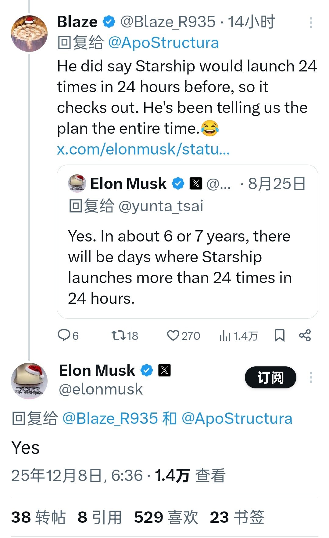 有网友推文下评论说;马斯克之前说过“星舰”会在24小时内发射24次,马斯克回复表示;Yes。