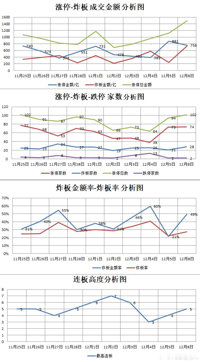 【12.8星期一】 湖南人涨停复盘 "涨停金额:756亿 炸板金额:739亿首板金额:440亿 连板金额:316亿涨停74家 炸板28家 跌停2家首板48家 连板26家" 【市场连板股】26只 316亿 代码 名称 末次时间 连板数 原因603696 安记食品 9:25 5 福建002682 龙洲股份 9:25 4 福建002589 瑞康医药 14:53 4 医药医疗603386 骏亚科技 14:54 4 机器人002585 双星新材 9:25 3 光伏605299 舒华体育 9:30 3 福建002961 瑞达期货 9:25 2 福建002149 西部材料 9:25 2 商业航天002679 福建金森 9:30 2 福建000901 航天科技 9:30 2 商业航天603122 合富中国 9:30 2 福建002752 昇兴股份 9:32 2 福建300427 红相股份 9:37 2 福建600693 东百集团 9:48 2 福建601106 中国一重 9:56 2 核聚变002977 天箭科技 10:17 2 商业航天001360 南矿集团 10:32 2 有色金属000905 厦门港务 13:38 2 福建002565 顺灏股份 14:16 2 商业航天600343 航天动力 14:21 2 商业航天301486 致尚科技 14:21 2 AI硬件000811 冰轮环境 14:29 2 AI硬件002295 精艺股份 14:36 2 有色金属002578 闽发铝业 14:40 2 福建600973 宝胜股份 14:52 2 AI硬件600734 实达集团 14:55 2 福建【福建】20只 213亿 消息面:《中共厦门市委关于制定厦门市国民经济和社会发展第十五个五年规划的建议》发布 603696 安记食品 9:25 5 福建+调味品002682 龙洲股份 9:25 4 福建+商业航天 605299 舒华体育 9:30 3 福建+体育产业 002961 瑞达期货 9:25 2 福建+期货 002679 福建金森 9:30 2 福建+林业碳汇 603122 合富中国 9:30 2/30天16板 海峡两岸双上市002752 昇兴股份 9:32 2 福建+客户旺旺集团300427 红相股份 9:37 2 福建+军用通信600693 东百集团 9:48 2 福建+商业百货000905 厦门港务 13:38 2 福建+物流002578 闽发铝业 14:40 2/6天3板 福建+铝材600734 实达集团 14:55 2/13天8板 福建+AI教育002512 达华智能 9:32 1/3天2板 福建+卫星通信603686 福龙马 10:42 1 福建+合作华为002029 七匹狼 10:51 1 福建+男装 600493 凤竹纺织 11:09 1 福建+纺织600897 厦门空港 13:21 1 厦门国资002474 榕基软件 13:26 1/16天8板 福建+AI政务 601933 永辉超市 14:13 1 福建+连锁超市000701 厦门信达 14:53 1 福建+互联网金融【AI硬件】14只 188亿 消息面:美股光芯片龙头集体创历史新高;机构称隔离器成光模块“卡脖子”环节 301486 致尚科技 14:21 2 CPO+阿里000811 冰轮环境 14:29 2 数据中心(液冷)600973 宝胜股份 14:52 2 数据中心高速线缆003031 中瓷电子 9:25 1 光模块(陶瓷外壳)002222 福晶科技 9:49 1 钒酸钇晶体(OCS)001267 汇绿生态 9:52 1 光模块301183 东田微 10:05 1 光隔离器300290 荣科科技 10:31 1 超聚变603256 宏和科技 10:42 1 Low-CTE+电子玻纤布688800 瑞可达 10:46 1 高速铜缆603042 华脉科技 11:03 1 光模块+数据中心铜缆603228 景旺电子 14:22 1 光模块+HDI601231 环旭电子 14:51 1 新一代1.6T光模组产品605168 三人行 14:52 1 算力【商业航天】12只 125亿 消息面:消息称Spacex估值推高到8000亿美元;OpenAI创始人表示有意在太空建设数据中心 002149 西部材料 9:25 2 网传SpaceX铌合金供应商000901 航天科技 9:30 2 航天应用002977 天箭科技 10:17 2 卫星通信002565 顺灏股份 14:16 2/7天6板 太空算力600343 航天动力 14:21 2 液体火箭发动机603601 再升科技 9:25 1 SpaceX供应商002792 通宇通讯 9:35 1/8天5板 SpaceX603738 泰晶科技 9:38 1 商业航天603698 航天工程 9:40 1 航天一院300337 银邦股份 9:47 1 商业航天000571 新大洲A 13:11 1/4天2板 海南+大飞机603680 今创集团 13:46 1 布局航空航天【机器人】6只 62亿 消息面:美称考虑明年发机器人行政令 603386 骏亚科技 14:54 4 机器人603528 多伦科技 9:32 1 机器人000020 深华发A 10:18 1 机器人603278 大业股份 10:39 1 人形机器人灵巧手603667 五洲新春 14:02 1 机器人零部件002164 宁波东力 14:45 1 机器人减速器【消费】6只 27亿 600337 美克家居 9:39 1 AI智家智能体001330 博纳影业 10:43 1 阿凡达3603898 好莱客 11:25 1 智能家居605136 丽人丽妆 11:29 1 电商AI(合作阿里)600250 南京商旅 13:01 1 南京旅游002853 皮阿诺 14:40 1 定制家居【光伏】3只 14亿 002585 双星新材 9:25 3 BOPET002506 协鑫集成 10:19 1 钙钛矿叠层电池002943 宇晶股份 13:00 1 光伏设备(钙钛矿电池)【其他热点】 603316 诚邦股份 10:11 1 存储芯片001309 德明利 11:04 1 存储芯片601106 中国一重 9:56 2 核聚变688719 爱科赛博 11:23 1 核聚变001360 南矿集团 10:32 2 有色金属002295 精艺股份 14:36 2 有色金属【其他个股】 002235 安妮股份 9:25 1 股权转让003029 吉大正元 9:32 1 量子科技002163 海南发展 10:07 1 海南001203 大中矿业 13:12 1 锂电池002492 恒基达鑫 13:59 1 石化物流603023 威帝股份 14:35 1 辅助驾驶002589 瑞康医药 14:53 4/9天5板 医药医疗【涨停炸板】28只 739亿 代码 名称 首次时间 涨跌幅 原因300394 天孚通信 10:43 19.19% AI硬件688325 赛微微电 13:09 18.82% 其他688499 利元亨 13:45 17.81% 其他300751 迈为股份 10:29 17.47% 太空算力301232 飞沃科技 11:19 15.68% 商业航天301218 华是科技 9:33 12.64% 航天002348 高乐股份 9:59 9.19% AI硬件603090 宏盛股份 11:08 8.63% AI硬件600246 万通发展 9:33 8.22% AI硬件000547 航天发展 10:38 6.95% 商业航天603301 振德医疗 9:50 6.95% 医药601377 兴业证券 9:33 6.94% 福建002702 海欣食品 13:53 6.81% 福建603327 福蓉科技 10:29 6.51% 消费600067 冠城新材 9:51 6.46% 福建603212 赛伍技术 10:25 6.40% 固态电池603668 天马科技 9:57 6.38% 福建002264 新华都 13:48 6.13% 福建600743 华远控股 9:31 5.69% 其他600879 航天电子 10:11 5.67% 太空算力605178 时空科技 13:30 5.43% 存储芯片601996 丰林集团 9:32 4.72% 其他688051 佳华科技 9:25 3.79% 公告003016 欣贺股