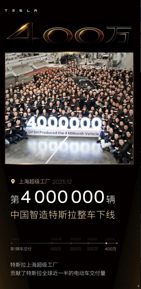 即便高手如云,特斯拉的销量还是稳如老狗。日前,特斯拉第400万辆中国智造特斯拉在上海超级工厂正式下线,第400万辆下线的车辆是星光金配色的Model Y L。还有一个比较震惊的数据,从2019年12月上海超级工厂开启交付到如今的6年间,上海超级工厂贡献了特斯拉全球近一半的电动车交付量,从300万辆到400万辆的交付,上海超级工厂也只用了不到14个月。对于特斯拉,有位网友曾说过“特斯拉之所以那么受欢迎,是因为它是不喜欢国产电动品牌的人的唯一选择”,大家觉得这个说法合理吗?你们买车会选择特斯拉吗?欢迎在评论区讨论交流。特斯拉第400万辆中国智造正式下线