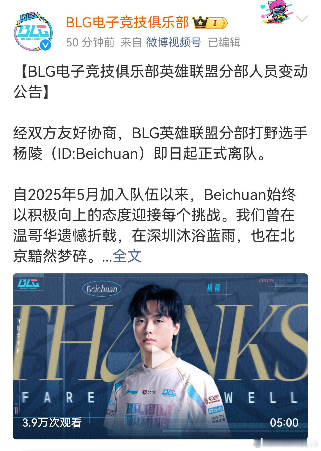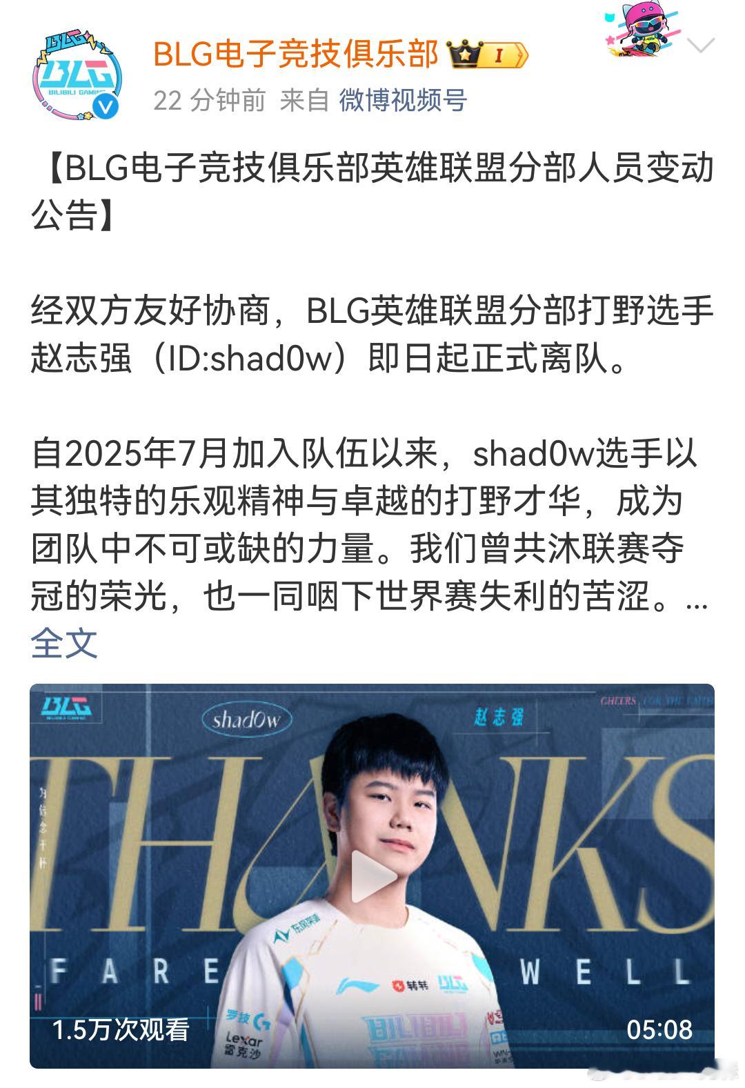 BLG宣布北川和shad0w离队,这样打野位只剩Xun,替补位置似乎是给了辅助位