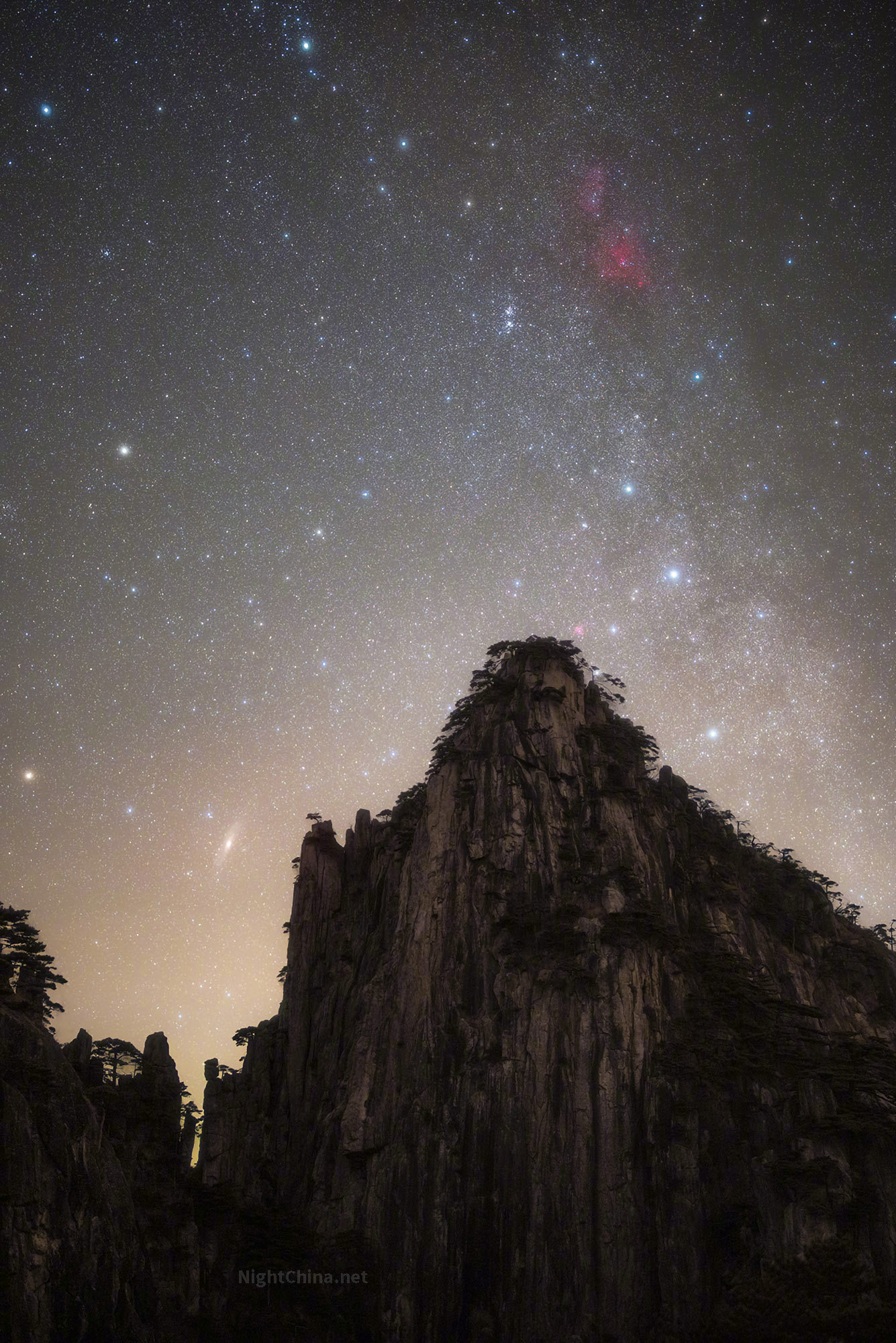 黎明前的静谧时刻,西北天际的仙女座与仙后座正缓缓西沉。仙女座的星光璀璨如梦,仙后座以标志性的“W”形在夜空中闪烁。晨曦微露,星辉与嶙峋山影交织,天地间弥漫着宁静而神秘的气息。摄影师:戴斯哲,2025年11月21日摄于 安徽 黄山。尼康D750(天文改机)+ 腾龙35 1.4 sp,天空部分:ISO 1600,f/1.4,单张曝光30秒,5张堆栈;地面部分:ISO 400,f/1.4单张曝光120秒,3张堆栈。关注Steed的星空 ,每日推送星空佳作。更多图片请见 夜空中国 :NightChina.net