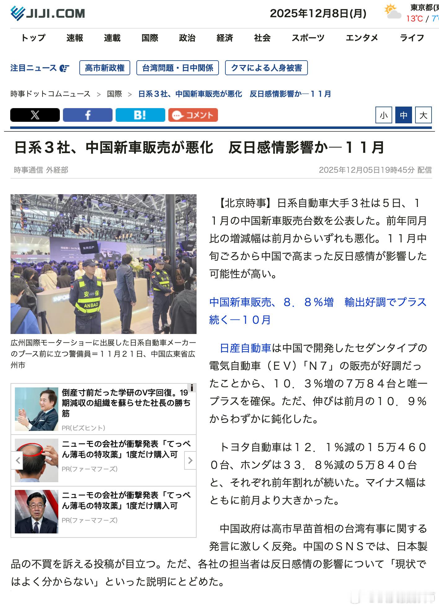 日本又想发动舆论战了 日媒时事通讯社将日系品牌 11 月份中国销量下跌归咎于因高市早苗的涉台言论造成中日关系紧张的原因。但其实日产凭借 N7 的良好势头是实现增长的,另外广丰的铂智 3X 也继续保持月交付破万,这些都是由中国团队主导并且迎合中国市场的价格体系的中国车型。说到底,产品力还是可以抵消一部分其他因素的影响,但总体而言,依然油车占比最大的日系品牌,其实何止 11 月份下滑,这几年都是持续在下滑的过程。汽车销量高市早苗让日本国家承担代价 大v聊车 新能源大牛说