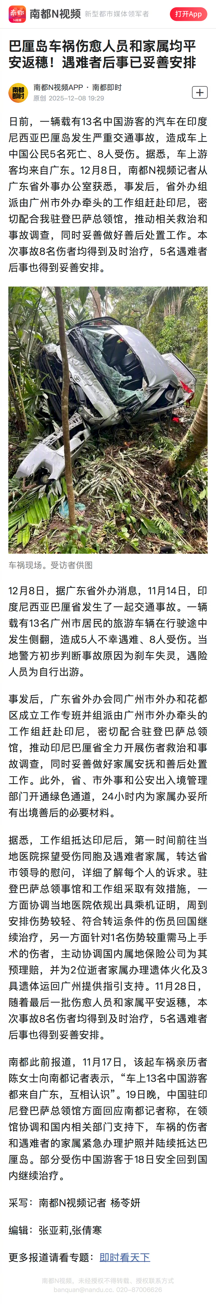 #巴厘岛车祸伤愈人员及家属平安返穗#【巴厘岛车祸伤愈人员和家属均平安返穗!遇难者后事已妥善安排】日前,一辆载有13名中国游客的汽车在印度尼西亚巴厘岛发生严重交通事故,造成车上中国公民5名死亡、8人受伤。据悉,车上游客均来自广东。12月8日,南都N视频记者从广东省外事办公室获悉,事发后,省外办组派由广州市外办牵头的工作组赶赴印尼,密切配合我驻登巴萨总领馆,推动相关救治和事故调查,同时妥善做好善后处置工作。本次事故8名伤者均得到及时治疗,5名遇难者后事也得到妥善安排南都N视频记者 杨苓妍