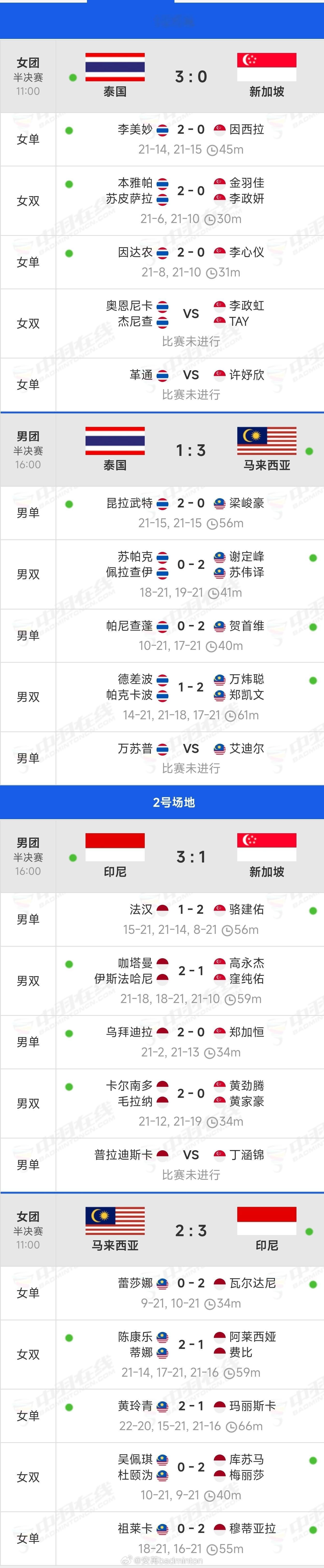 2025年东南亚运动会羽毛球🏸男女团半决赛赛况如下图12月10日将进行决赛的争夺!女团决赛:泰国🇹🇭 🆚 印尼🇮🇩(11:00)男团决赛:印尼🇮🇩 🆚 马来西亚🇲🇾(16: 00)羽毛球
