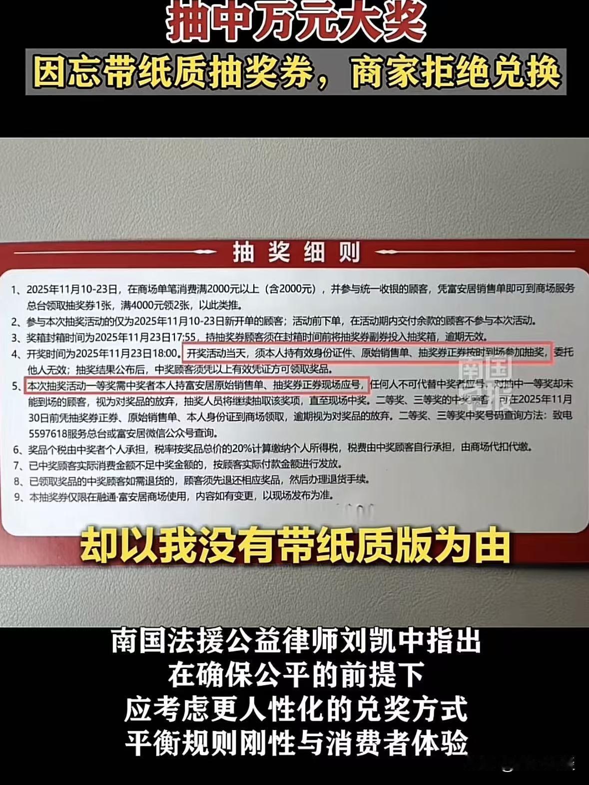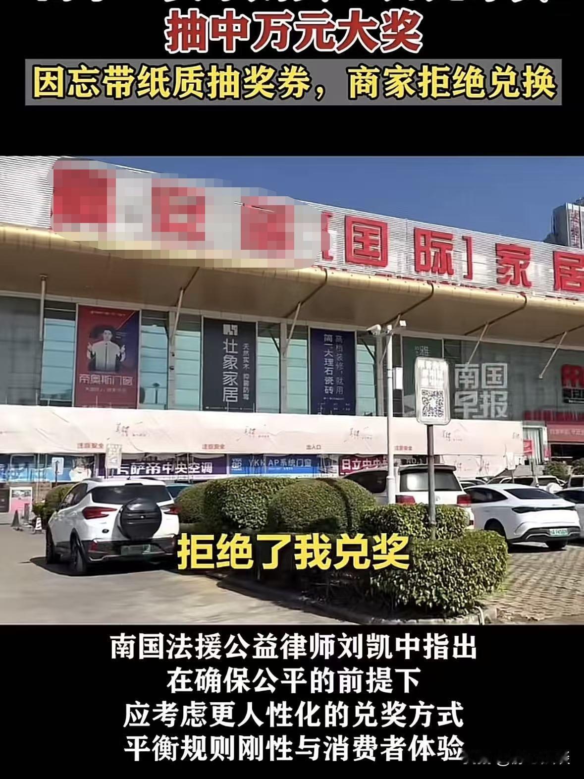 广西南宁,女子买了13万的家具,商家赠送其50多张抽奖卷,没想到,第一轮抽奖的时候就中了1万块钱,女子高兴坏了,兴冲冲就准备上台领奖,结果主持人紧接着来了一句,中奖人员必须1分钟之内凭借纸质抽奖卷领奖,女子一愣,因为她没有拿,但是他拿手机拍了抽奖卷的照片,最后虽然她拿着照片、身份证和销售单,还是被因为没有纸质抽奖卷而拒接给她颁奖,对此女子气愤不已! 李女士家里装修,花13万在建材市场买了一套家具。 而建材市场为了回馈客户,搞活动,直接给了她50多张商场抽奖券。 李女士当时还说,买家具还能顺带抽个奖,别说多,中个小奖也是意外之喜。 因为活动是晚上,她下午没事就先回了家,等吃过饭才回到建材市场。 抽奖活动一开始,现场那叫一个热闹,主持人在台上喊着号,台下的人都竖着耳朵听,生怕错过了自己的号码。 李女士也在人群里,心里还琢磨着,50多张券,总能中一个吧。 万万没想到,刚第一轮抽奖,李女士竟然就中了一个一等奖。 一等奖是1万块钱,李女士高兴的都要跳起来了,喜悦之情溢于言表。 她兴冲冲地就往台上跑,心里想着,这下可赚着了,商家这活动真给力。 结果就在李女士马上要跑到台上领奖的时候,主持人突然来了一句: 中奖者必须在1分钟之内,凭借纸质抽奖券上台领奖。 李女士当时一听这话,直接就愣在原地了,脚步都停住了。 纸质抽奖券?没人告诉她要拿纸质的啊,她以为有号就可以,便把兑奖卷放在一起用手机拍了一张照。 纸质的券压根就没带,这突如其来的要求,让她一下子就懵了,脑子里一片空白。 她赶紧跟人家说,我中了!号码对得上!我没带纸质的,但是我手机里拍了照片。 说着就把手机递过去,想让主持人看看照片里的抽奖券号码。 对方工作人员看了一眼照片,摇了摇头,说不行,规定就是必须要纸质抽奖券,照片不算数。 李女士这时候也急了,从始至终也没人告诉她要带纸质的。 现在要是让她回去拿也行,但是你要求1分钟之内坐飞机也来不及啊。 而且自己还带了身份证和当时买家具的销售单,这些都能证明她就是抽奖券的主人。 结果工作人员那边态度也挺坚决,说这是活动规则,必须凭纸质抽奖券领奖,照片不算,身份证和销售单也不行。 不管李女士怎么解释、怎么沟通,人家就是一句话:没有纸质券,无法领奖。 她不理解,后来她看其他人的纸质兑奖卷上写着:开奖当天本人持身份证、销售单、正券到场。 并没有提到必须要纸质的,自己拍了照片也是一样的啊,应该有凭证就可以。 事后她觉得委屈,明明到手的1万块钱大奖,就因为没拿纸质卷,与自己失之交臂。 第二天她找到商场去要说法,工作人员称活动有公证处全程监督。 本人持纸质正券兑奖是提前定的规则,为保证公平,避免假照片浑水摸鱼,且符合“人证券三合一”的公证要求,不能破例。 但李女士反驳,抽奖宣传单仅写凭券参与,主持人也未强调必须纸质,认为商家未明确公示规则,属暗箱操作。 之后商家道歉并提出礼品、消费券补偿,遭李女士拒绝,她坚持要么兑奖要么退家具。 后来还向市场监管部门投诉,商家表示后续会在奖券上加印醒目提示、活动前广播强调规则。 目前双方仍僵持,李女士在等待相关部门调查结果。 《规范促销行为暂行规定》第十五条:经营者进行有奖销售,不得采用以下谎称有奖的方式: (一)虚构奖项、奖品、奖金金额等; (二)仅在活动范围中的特定区域投放奖品; (三)在活动期间将带有中奖标志的商品、奖券不投放、未全部投放市场; (四)将带有不同奖金金额或者奖品标志的商品、奖券按不同时间投放市场; (五)未按照向消费者明示的信息兑奖; 李女士基于商家明示的规则,履行了 “购买家具获得奖券”“到场参与抽奖” 的义务。 且中奖号码与手机照片记录的券号完全一致,同时持有身份证、销售单证明奖券归属,已满足商家明示的全部条件。 商家临时增加未公示的限制,实质是剥夺了李女士的合法兑奖权利。 《消费者权益保护法》第8条:消费者享有知悉其购买、使用的商品或者接受的服务的真实情况的权利。 李女士作为消费者对与消费行为相关的关键信息享有知情权,商家有义务全面、准确、清晰地告知,不得隐瞒或误导。 若商家认为纸质券是唯一有效凭证,必须在发放奖券时、活动宣传单中或开奖前通过醒目方式明确告知,让消费者有充分时间准备。 商家未履行该告知义务,导致消费者的合理期待落空,肯定需要承担相应责任。 对此,你怎么看待这件兑奖事件? @静心法谈 学法辨是非,慬法不吃亏。