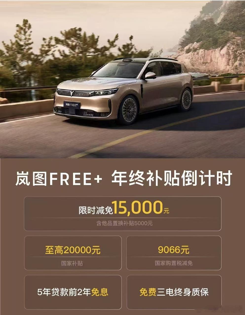 就这也有福利?华为智驾ADS 4+800V超充加身的岚图FREE+,这波性价比直接封顶。现在不仅来个直降1.5万,国补也将迅速退坡,趁机下订就是白捡钱。两年免息、三电终身质保统统安排到位,相当于买车自带“无忧大礼包”。等到国补退坡后要多掏近3万,现在入场等于净赚1.5万再叠加福利,别再摇摆,马上冲! 岚图FREE+电车国补华系旗舰政策补贴国补退坡倒计时
