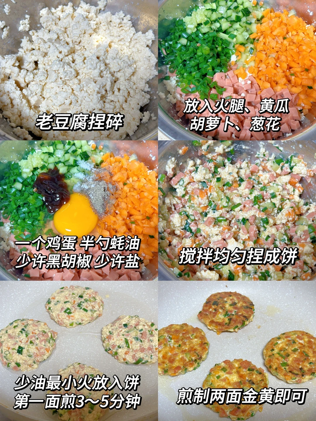1️⃣半块老豆腐捏碎,加入胡萝卜碎、黄瓜、火腿、葱花、鸡蛋➕1个鸡蛋➕半勺蚝油➕少许黑胡椒粉➕少许盐(如果有水姐妹们可以再➕2勺淀粉)搅拌均匀捏成小饼