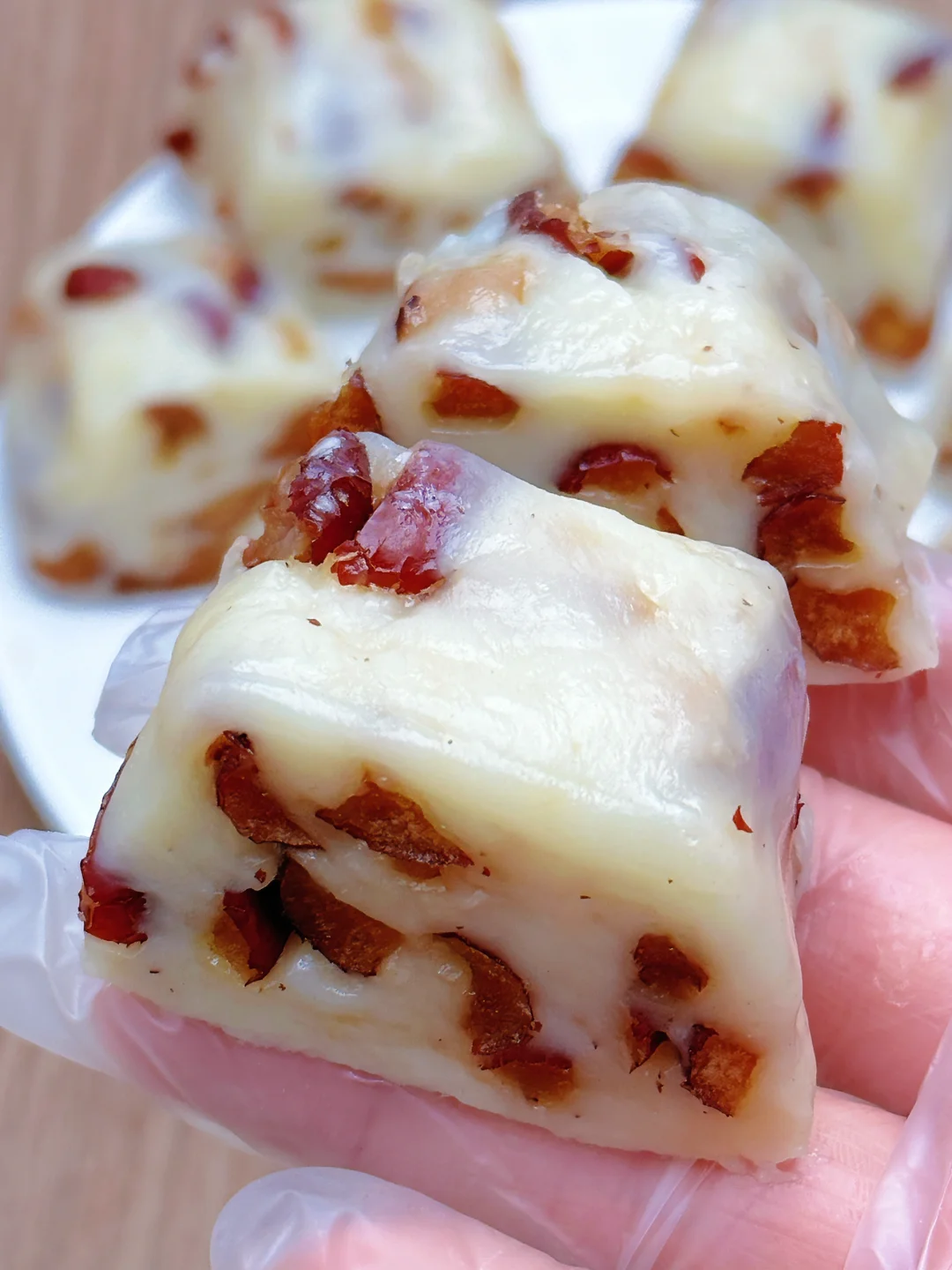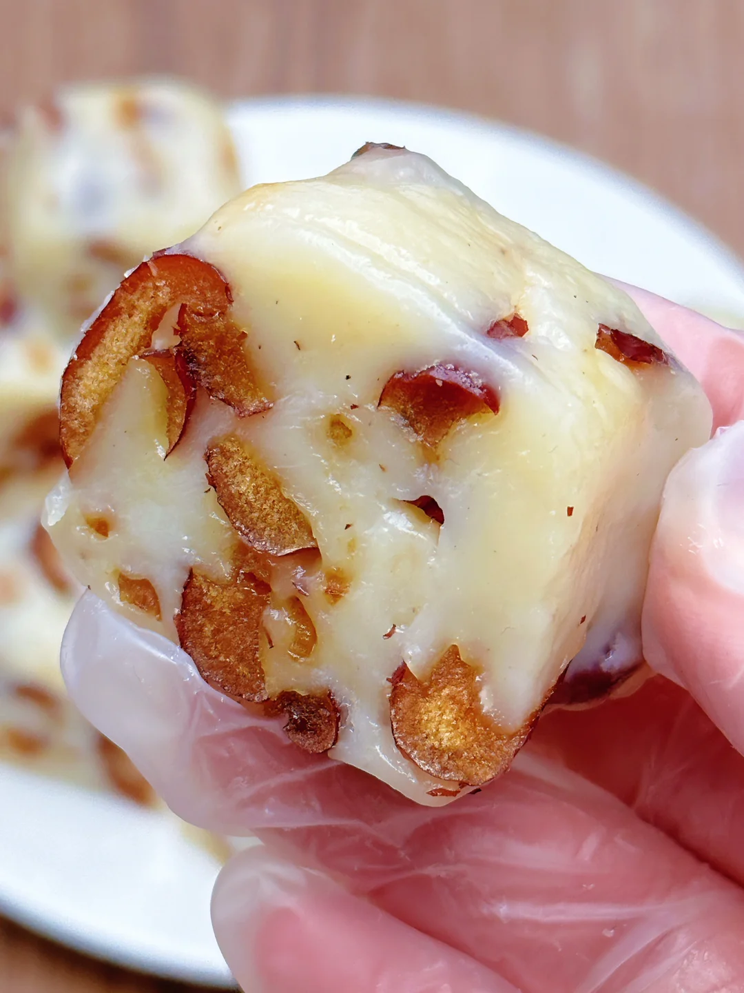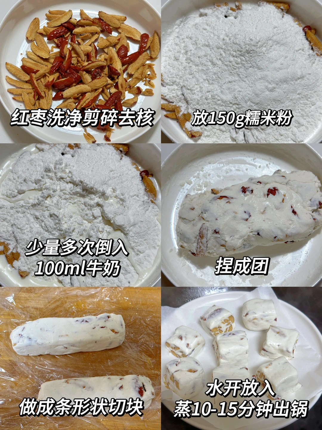 姐妹们,牛奶红枣糯米糕真的泰好吃啦[哭惹R][哭惹R][哭惹R]全都是常见的食材,没尝试之前以为味道就一般,试过之后真的有被惊艳到了[哇R][哇R][哇R]拒绝不了这种Q弹的糯米混着浓浓的奶香的东西,红枣的甜味醇而不腻,而且自己做的真材实料比外面买的要好吃太多,姐妹们快去试试~ 🥗食材:糯米粉、牛奶、红枣 🥘做法:如图所示哦~ 当零食或者早餐都是不错的,姐妹们牛奶一定要少量多次倒哟,不要弄太湿了,不然蒸出来会塌不好看,吃还是好吃的[萌萌哒R]