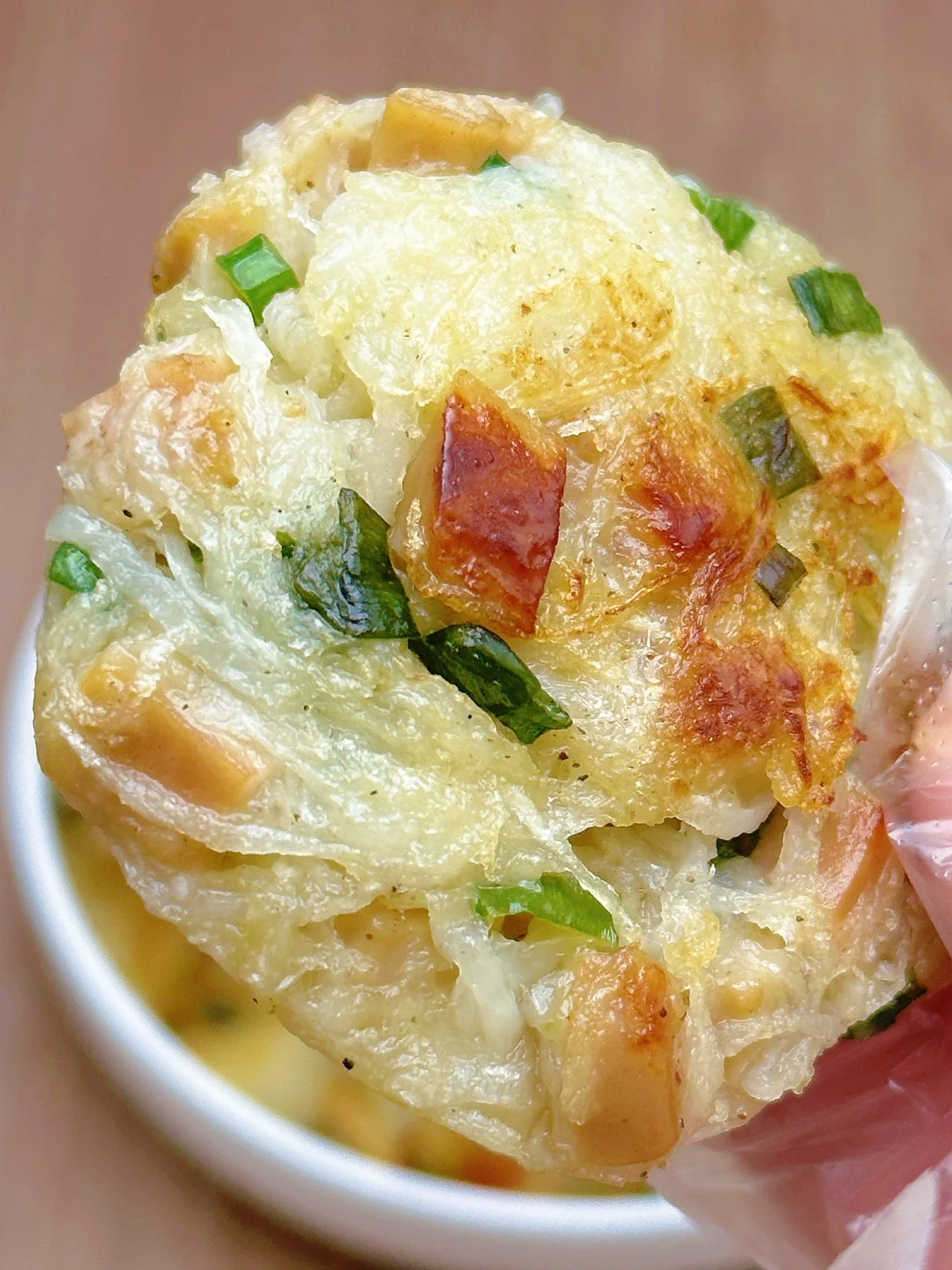 4⃣️锅里少油最小火放入饼,煎制两面金黄即可开吃(第一面煎2~3分钟再翻面哟,不然容易不成型)