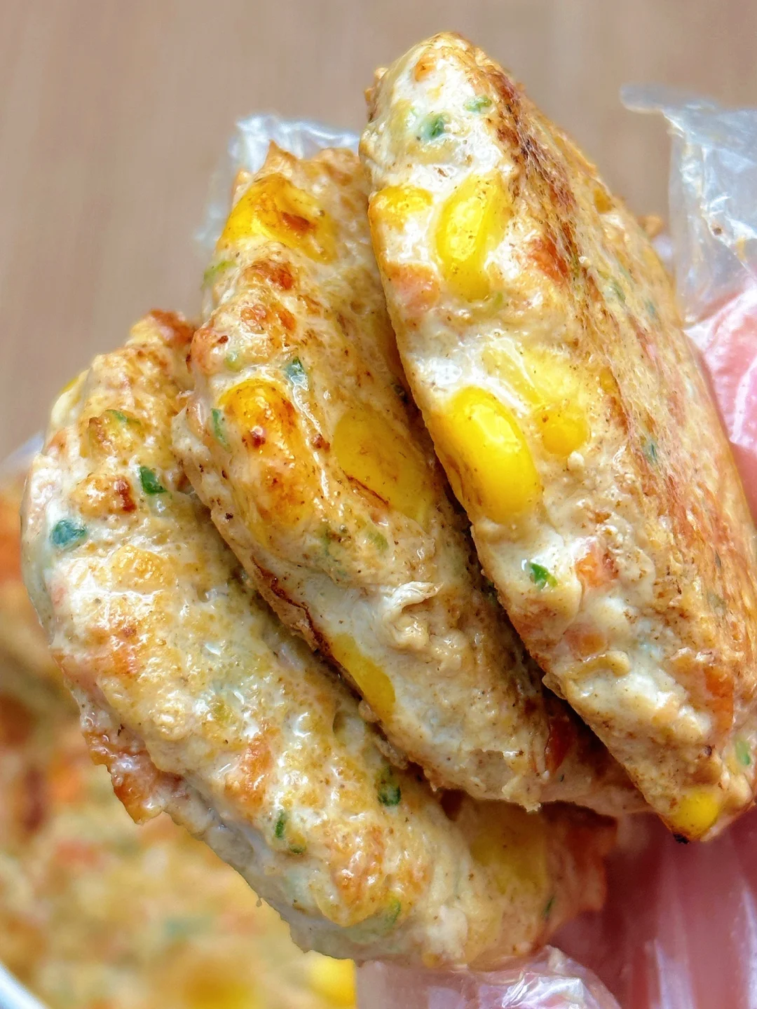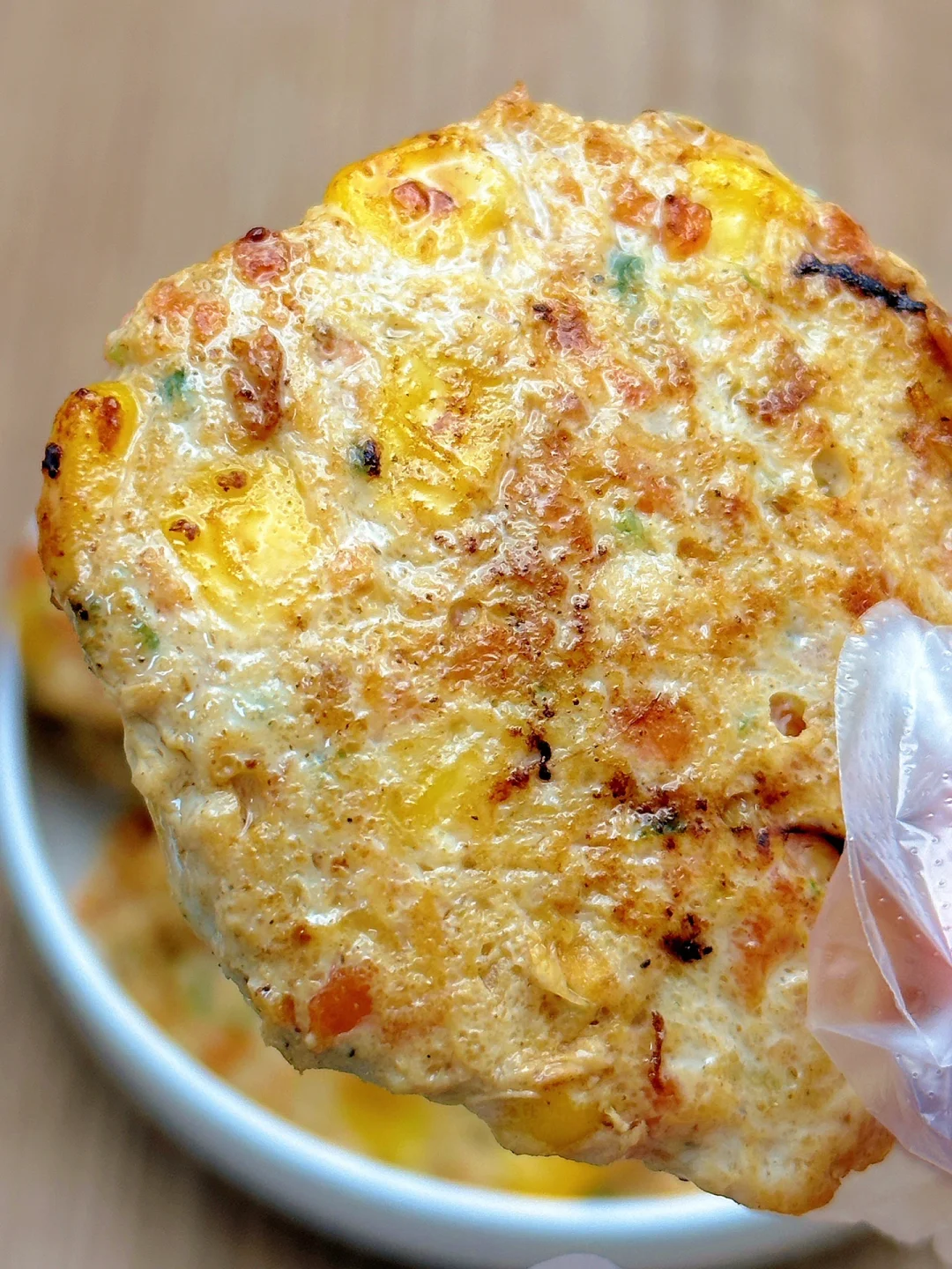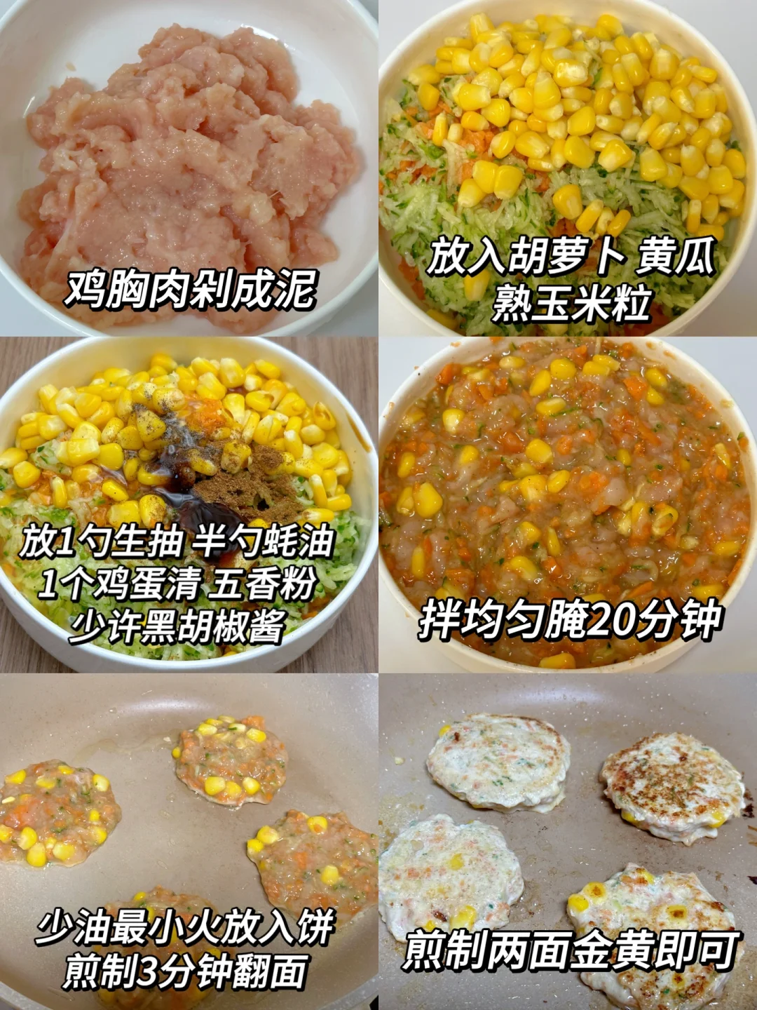 🥗食材:鸡胸肉、胡萝卜、青瓜、玉米粒(做了12个饼)
