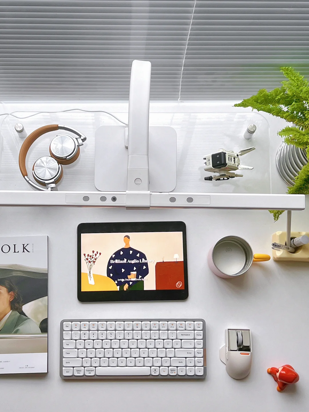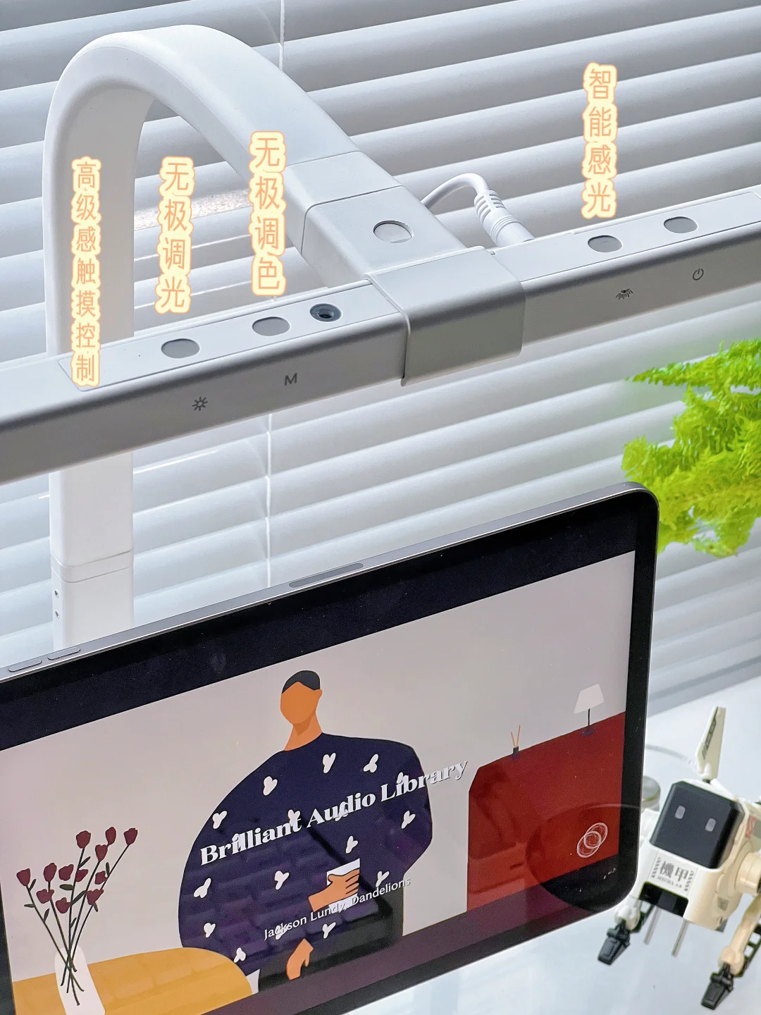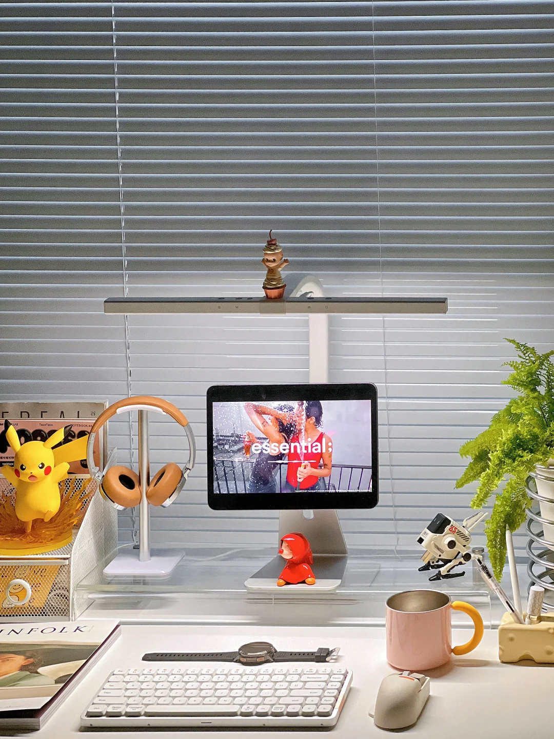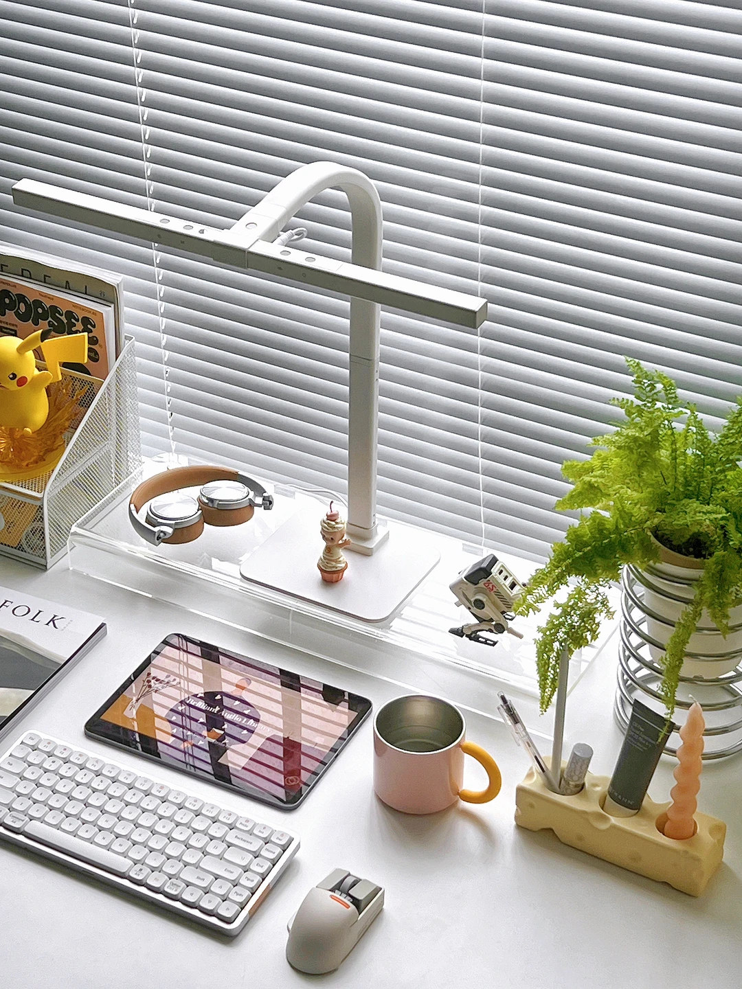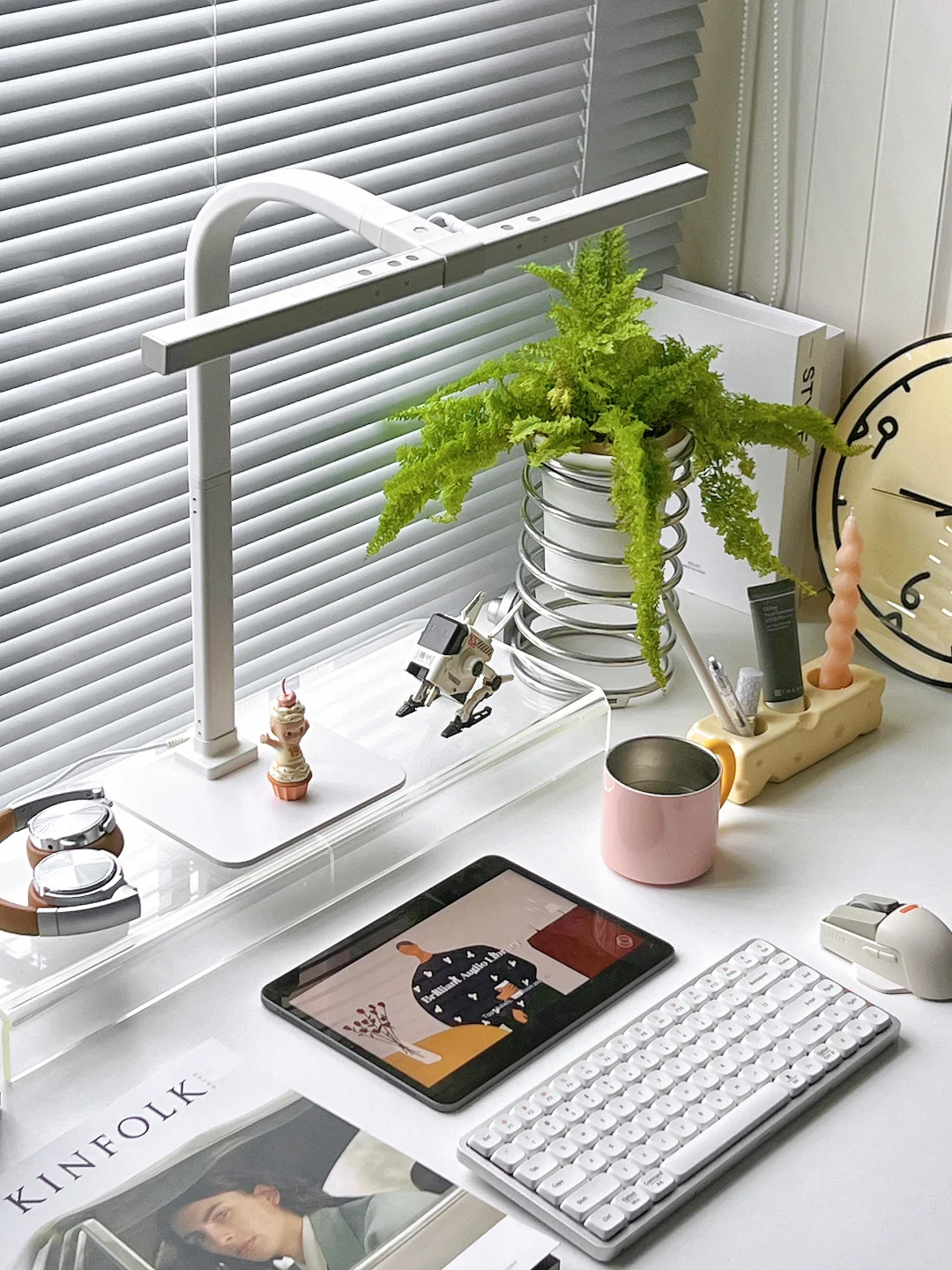 分享今日份书桌布置 白色系的桌搭我真的会爱呀! ipadpro+透明增高架+台灯组合 一整个ins风有木有 . 下午一般有1-2小时是我的书桌时间 最近一到午后就暴雨 放下窗帘 打开台灯 开启沉浸式宅家学习工作 我的书桌是140*70尺寸 算是大尺寸啦 不过灯光都能覆盖到很柔和✌ 新的盆栽可可爱爱蕾丝蕨 每天都爱上书桌一秒钟