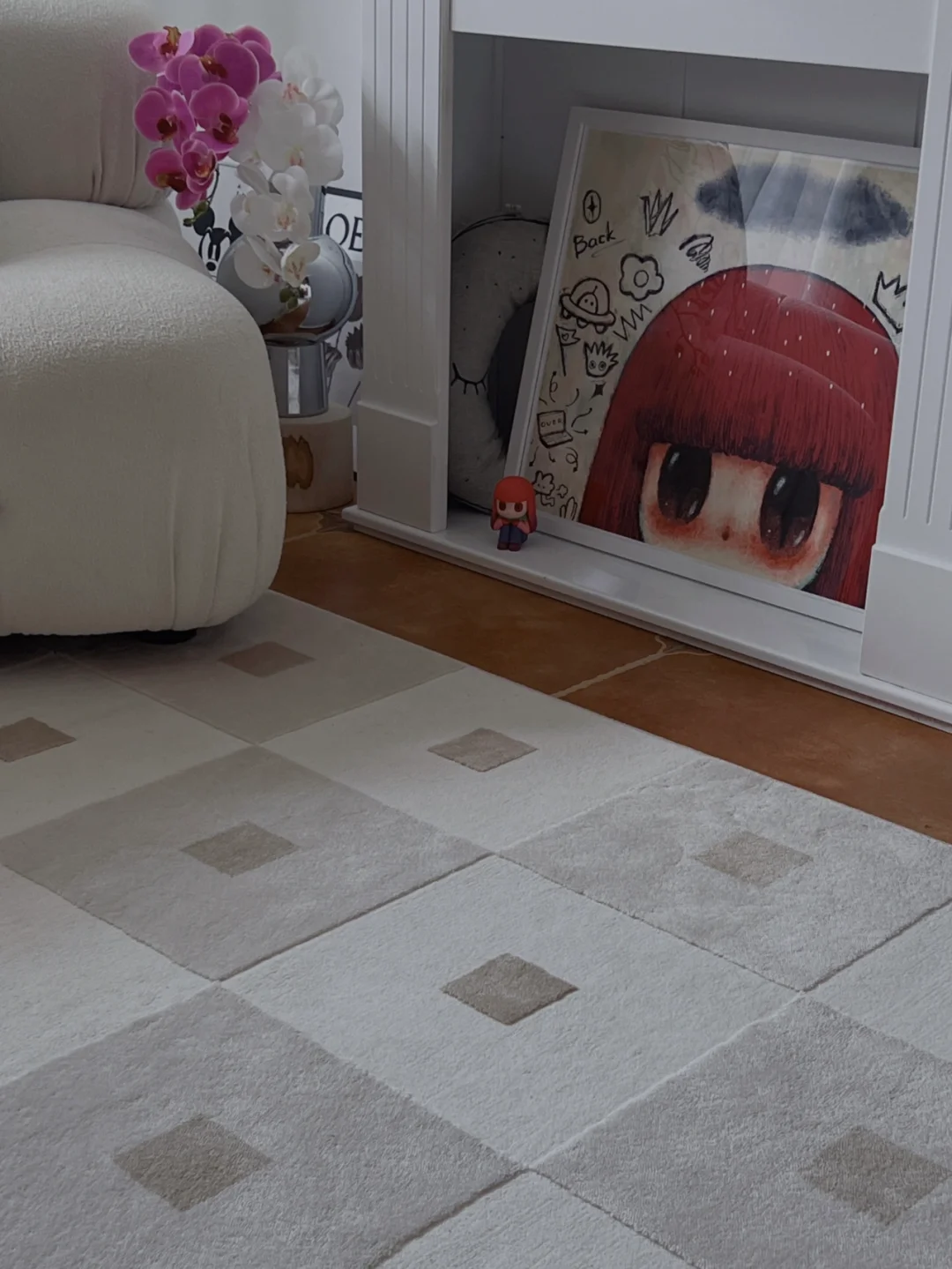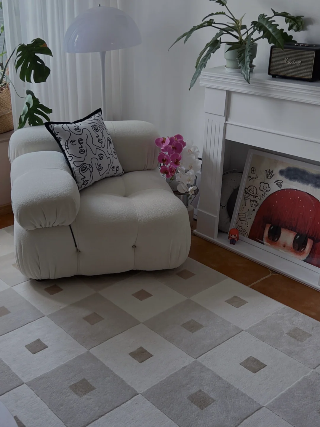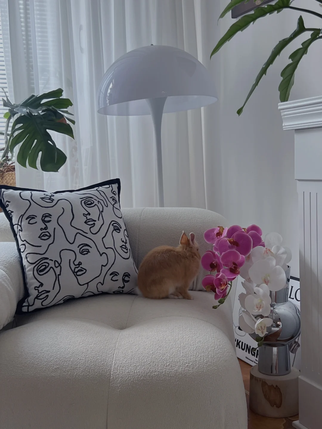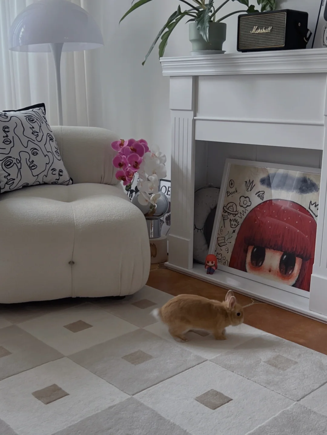独居的家,有兔子妹妹🐰陪伴。 侏儒兔是超级爱干净的小动物,潜移默化我也养成了勤打扫的好习惯。持续一周的雨终于停了,把绿植搬到飘窗通风晒晒太阳☀~ 客厅换上新的格子地毯,很喜欢的方块配色,丰富了视觉上的立体感,手感柔顺。兔子因为脚底不像猫狗那样有肉垫,所以一定要铺地毯来保护,它最喜欢在客厅地毯和单人沙发上玩耍。 单人沙发是它的地盘,我的活动区域移动到皮沙发上,茶几是自己diy。下午阳光洒进客厅那一刻是最美好时光。 🏷 地毯:碧兰旗舰店 🏷 抱枕:TEXDREAM态度