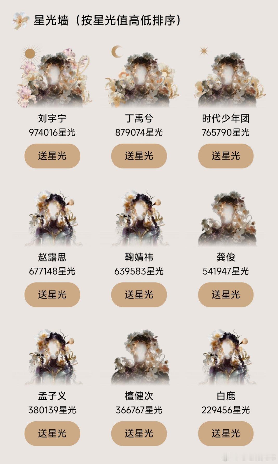目前星光大赏花墙前九名刘宇宁、丁禹兮、时代少年团、赵露思、鞠婧祎、龚俊、孟子义、檀健次、白鹿星光大赏阵容官宣