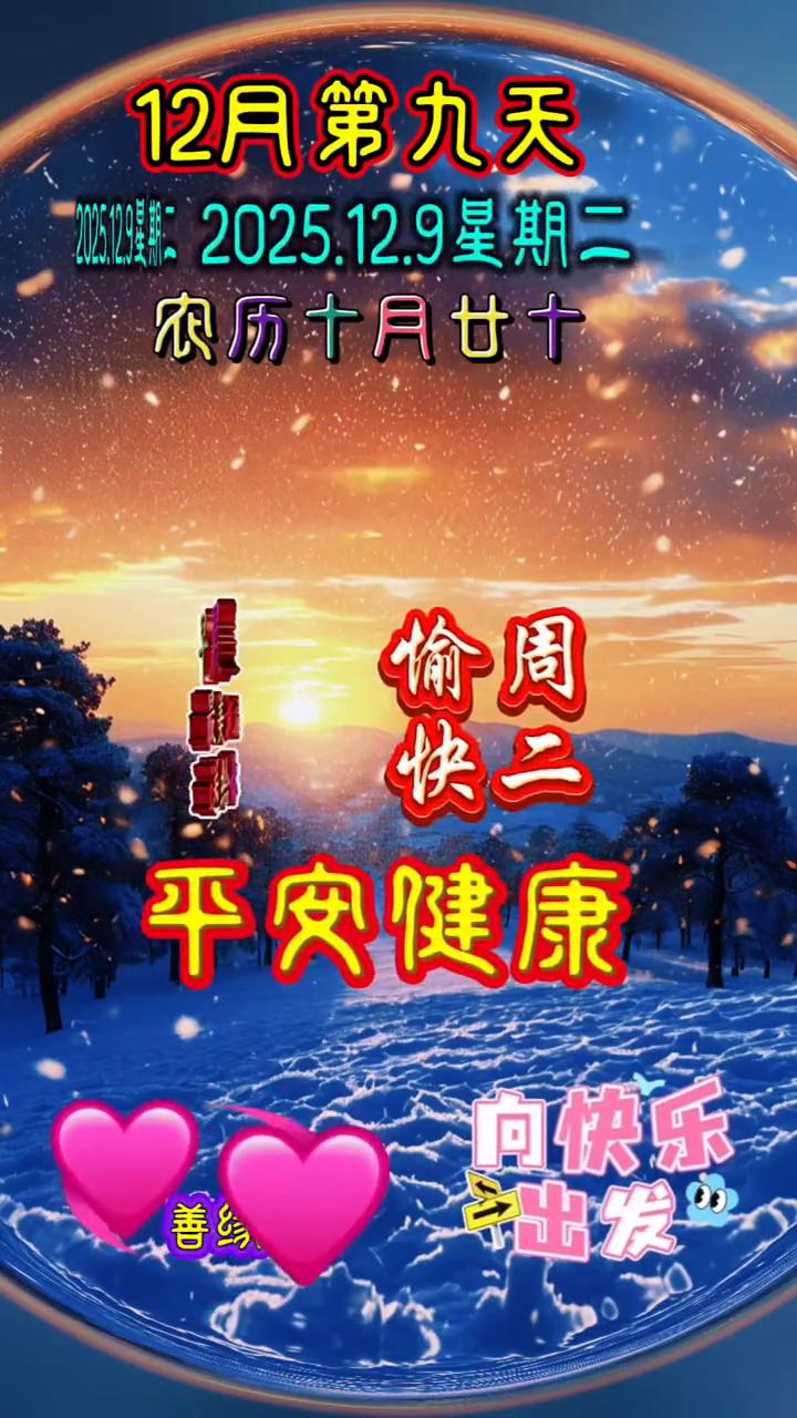 早晨最美祝福:平安健康,向快乐出发。 今天是十二月九日,星期二,农历十月二十。早安!把平安送给最善良的人,把思念送给最知心的人,把祝福送给最珍惜的人,把一切好运送给我最想问候的人。愿你健康平安,富贵吉祥,日子红红火火。