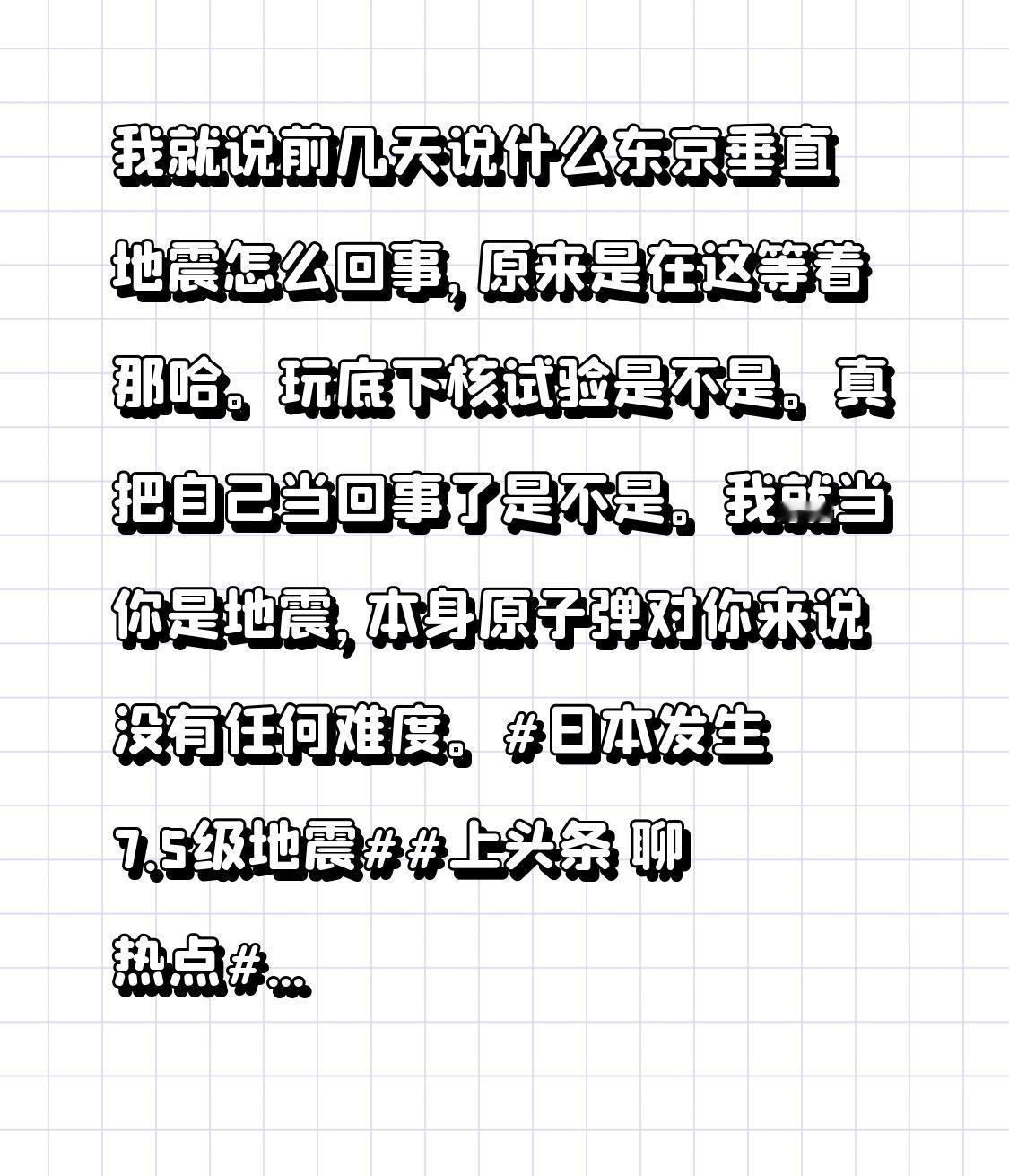 我就说前几天说什么东京垂直地震怎么回事,原来是在这等着那哈。玩底下核试验是不是。真不把自己人当回事了是是吧。我就当你是地震,本身原子弹对你来说没有任何难度。期待你后面集采的表演。