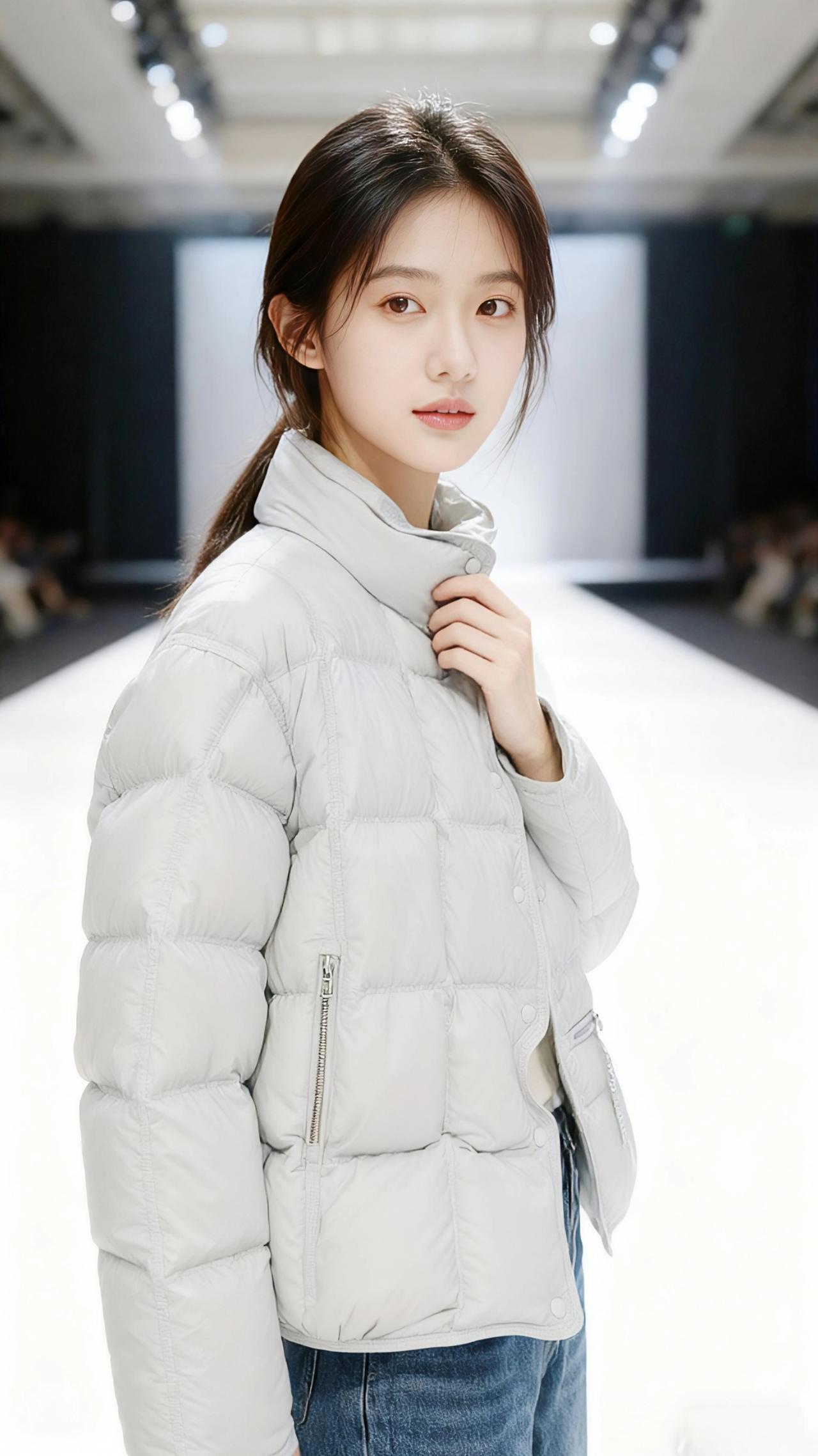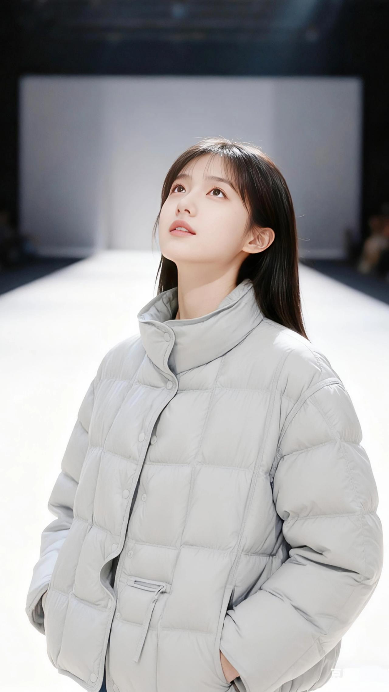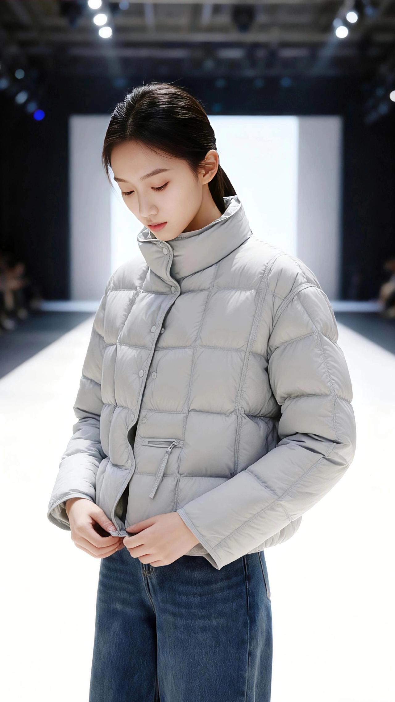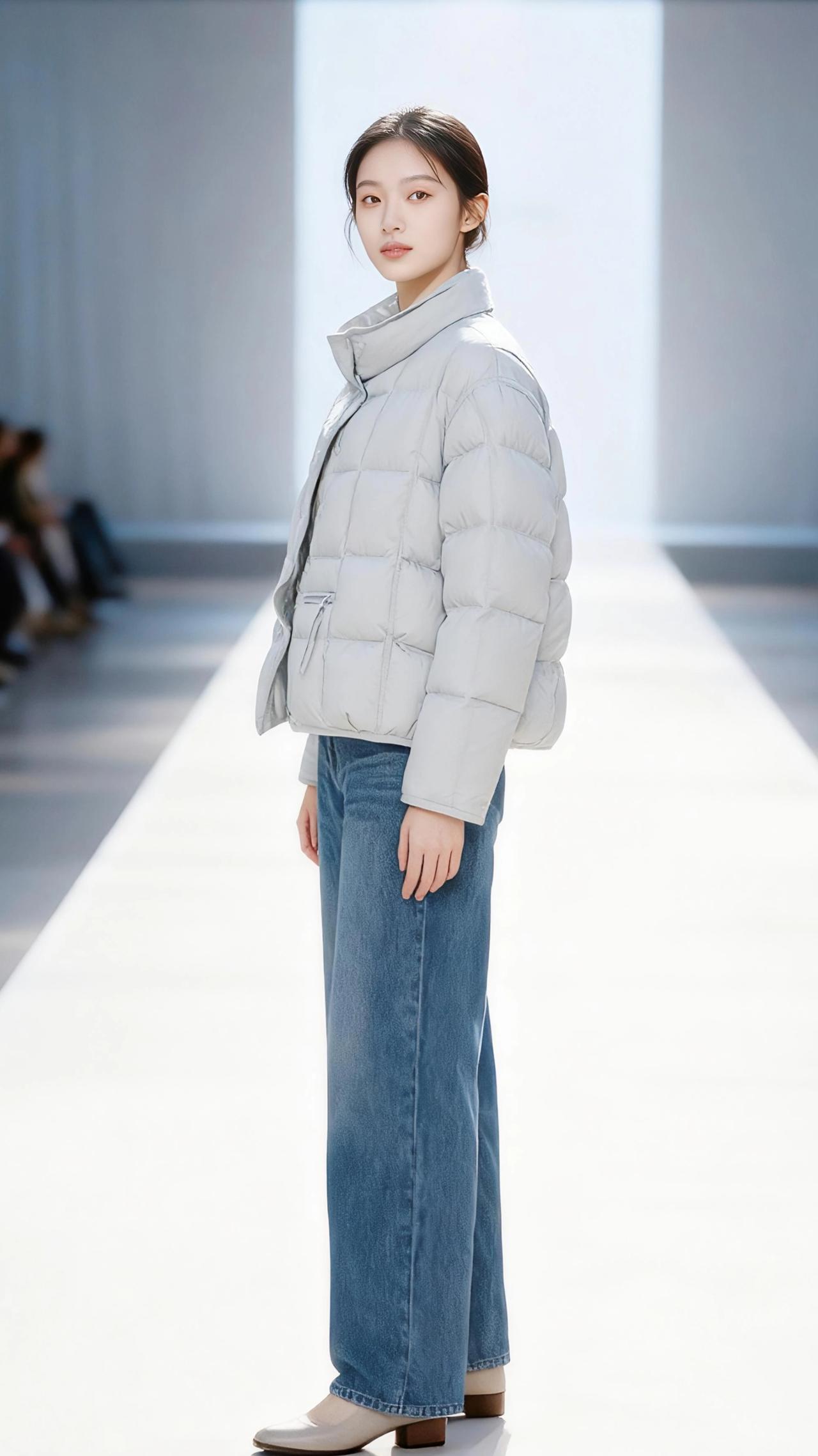 她立在T台的光里,像一捧被柔雾裹住的云。浅灰棉服的菱格纹里,盛着松松软软的暖,领口半掩着,露出一点颈线,是冷调里浸着的温。 她抬眼时,睫毛颤得轻,像把顶光揉成了碎银;垂眸时,指尖碰着纽扣,风从衣摆溜过,把松弛的褶皱吹成安静的诗。牛仔裤的蓝是旧的,裹着漫不经心的舒展,鞋跟敲在白台上,声音轻得像没落在纸上的墨。 后台的暗与台前的亮,在她肩线处裁出一道软边——没有喧嚣的,是衣服裹着的温度,是她眼里没说尽的,恰好的轻。 高级感穿搭 小个子穿搭 冬季穿搭