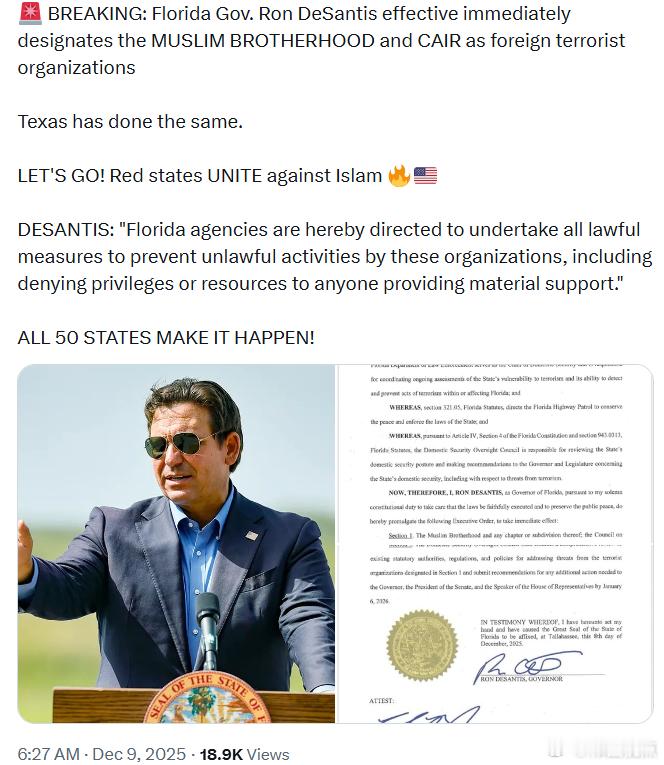 佛罗里达州州长罗恩·德桑蒂斯宣布,即日起将穆斯林兄弟会和美国伊斯兰关系委员会(CAIR)列为外国恐布组织。德桑蒂斯声明:“佛罗里达州各机构须立即采取一切合法措施,阻止这些组织从事非法活动,包括拒绝向任何向其提供物质支持的人提供特权或资源。”全美50个州都应该行动起来!