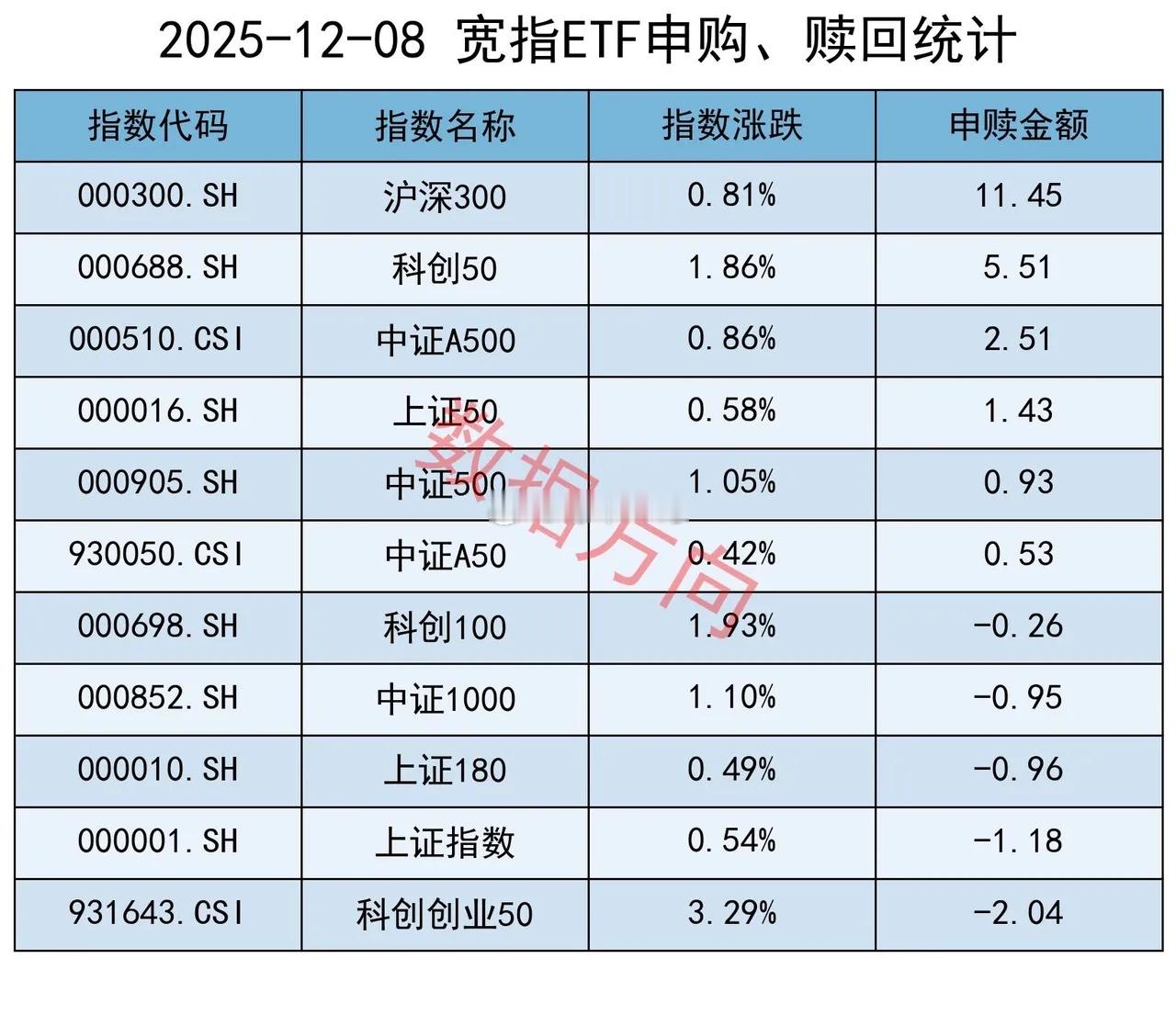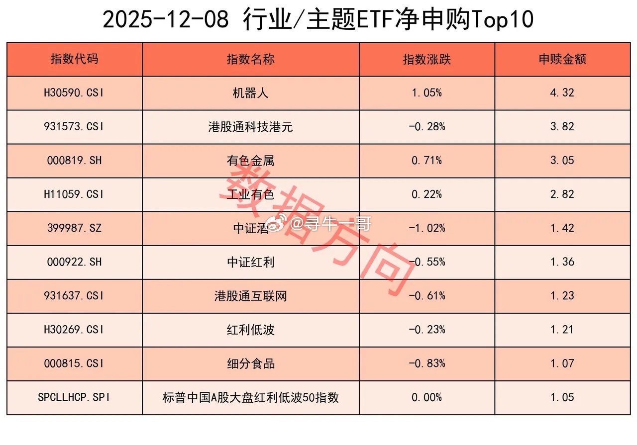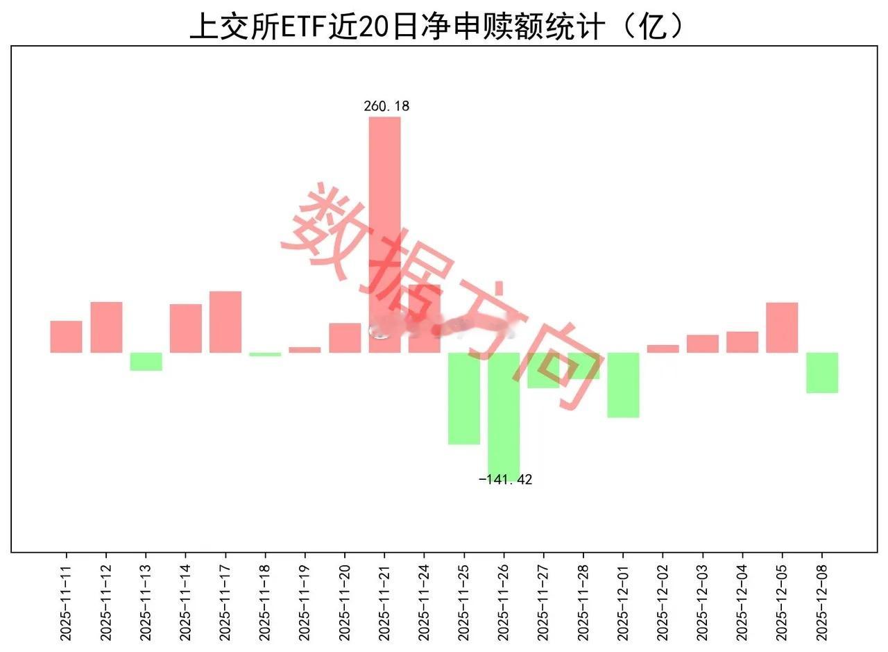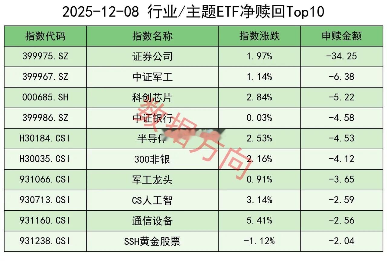 证券ETF被赎回!12月8日星期一,大盘全天放量上涨,算力硬件带领科技股涨幅居前。上证指数涨幅0.54%,上交所ETF合计净赎回43.87亿元。除了ETF被赎回以外,昨天期指净空单增加了8200多手。宽指沪深300指数(11.45亿),净申购超过10亿。科创50指数(5.51亿),净申购超过5亿。中证A500指数(2.51亿)、上证50指数(1.43亿)、中证500指数(0.93亿)、中证A50指数(0.53亿),分别获小幅净申购。科创创业50指数(-2.04亿)、上证指数(-1.18亿)、上证180指数(-0.96亿)、中证1000指数(-0.95亿)、科创100指数(-0.26亿),分别被小幅净赎回。行业和主题 港股通科技港元指数(3.82亿)、港股通互联网指数(1.23亿),一起进入申购榜。有色金属指数(3.05亿)、工业有色指数(2.82亿),一起进入申购榜。中证红利指数(1.36亿)、红利低波指数(1.21亿)、标普中国A股大盘红利低波50指数(1.05亿),一起进入申购榜。其他进入申购榜的还有:机器人指数(4.32亿)、中证酒指数(1.42亿)、细分食品指数(1.07亿)。证券公司指数(-34.25亿)、300非银指数(-4.12亿),一起进入赎回榜。中证军工指数(-6.38亿)、军工龙头指数(-3.65亿),一起进入赎回榜。科创芯片指数(-5.22亿)、半导体指数(-4.53亿),一起进入赎回榜。CS人工智指数(-2.59亿)、通信设备指数(-2.56亿),一起进入赎回榜。其他进入赎回榜的还有:中证银行指数(-4.58亿)、SSH黄金股票指数(-2.04亿)。ETF