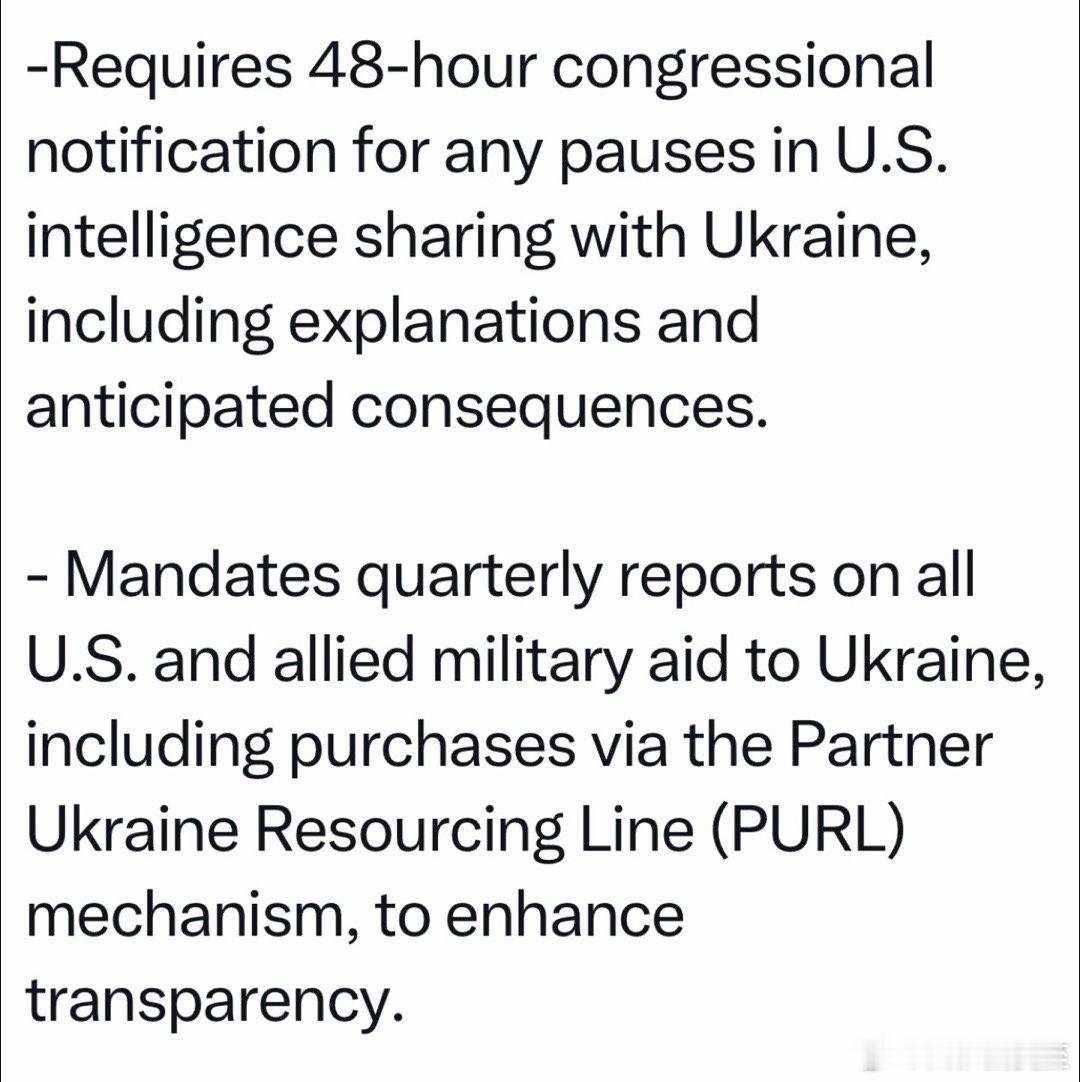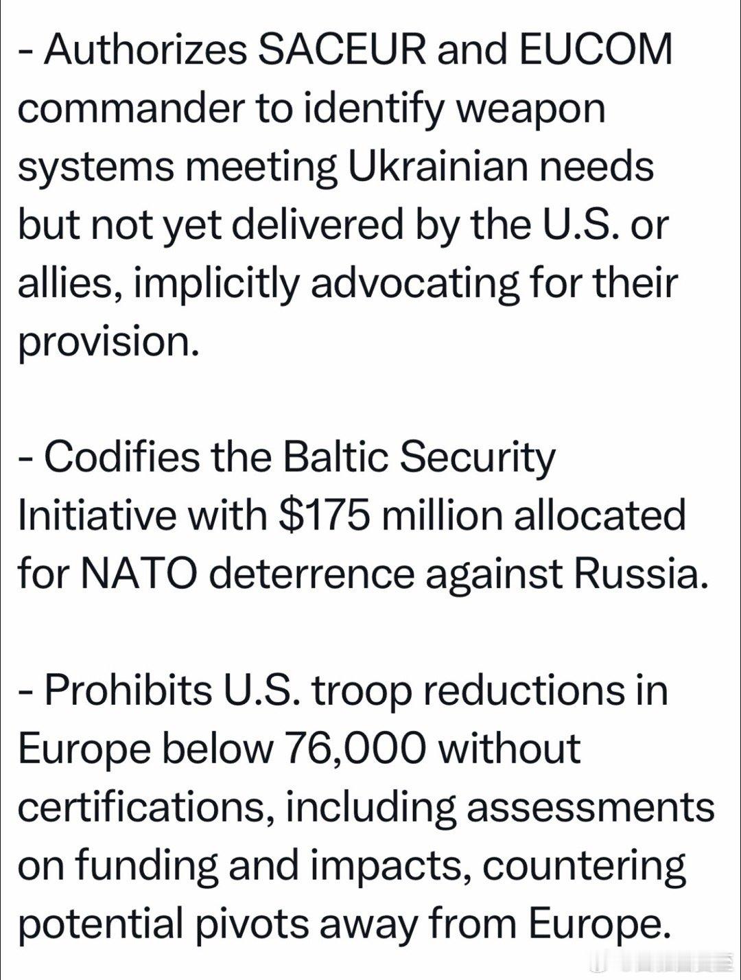 国会的国防授权法案,与联邦的国家安全战略,对待欧洲,有重大区别,例如:- 禁止在欧驻军低于7.6万人- 暂停与乌克兰分享情报,需提前48小时告知国会- 每季度汇报军援情况- 授权中央司令部寻找适合提供给乌克兰的武器系统- 向波罗的海国家提供援助、以抵御俄