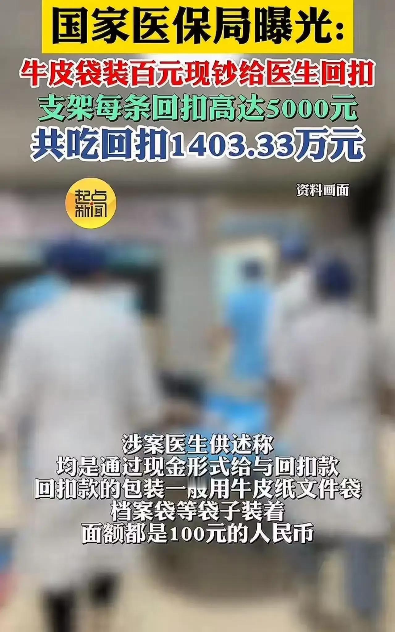 令人瞠目结舌!医保局曝光,上海某医疗器材商,为了让医生在手术时多往患者身体里放他们的心脏支架,用牛皮纸袋装着现金,在七年时间给河北一家医院的多名医生送了1400多万,单条支架回扣能5000元,球囊每条1000元左右!网友:这哪有一点医者仁心,这眼里全是生意和利益…… 这样的事情一经曝光,瞬间点燃了公众的愤怒,也让我们不得不反思:在医疗行业,利益的天平究竟偏向了谁?当“医者仁心”变成了“利益链”,患者的生命安全又该何去何从?我们习惯了把医生视作救死扶伤的天使,却没想到,他们中的一些人竟然沦为了利益的奴隶。 细想一下,这背后隐藏的究竟是什么?难道在这个金钱至上的社会里,医生的职业道德还能坚守多久?在那些“利益输送”的暗流中,患者的健康和生命,似乎变成了可以交易的商品。这样的现象,不仅令人心碎,更让人深思:我们该如何守护那些真正为患者服务的医者?又该如何杜绝“利益驱动”的黑幕? 当然,也有人会说:“这是个别现象,不代表整个行业。”但你知道吗?每一个“个别”背后,都是潜藏的制度漏洞和监管盲区。没有严格的监管,没有透明的流程,就像一只看不见的手,操控着整个医疗生态,让一些人利用制度的空隙谋取私利。 更令人担忧的是,这样的事件一旦被曝光,公众的信任会受到多大的打击?患者会变得更加焦虑和不安,医患关系也会变得更加紧张。我们不禁要问:在这个充满利益冲突的环境中,如何才能让“医者仁心”真正成为行业的底色?如何让医疗不再是利益的角斗场,而是真正的生命守护者? 这不仅仅是一起医疗腐败案件,更是对整个社会价值观的一次拷问。我们期待,监管部门能够严查到底,净化医疗环境;期待那些真正为患者着想的医者,能坚守初心,重拾“仁心”;更希望每一个人都能清醒地看到:只有制度的完善和道德的坚守,才能让医疗行业回归本源,让生命的尊严得到真正的尊重。 这场“医界风暴”告诉我们:利益可以腐蚀人心,但只要我们不放弃对正义的追求,就一定能迎来更清明的明天。因为,生命没有价格,医者的良知,永远比金钱更珍贵。心脏介入支架 心脏支架手术