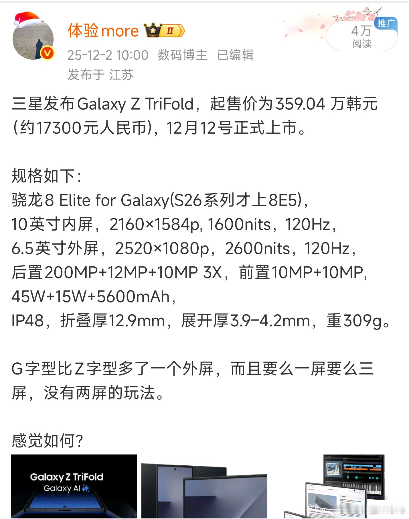 三星Galaxy Z TriFold开启预售,16GB+512GB,1999916GB+1TB,21999比韩版价格高,与国内市场华为Mate XTs 非凡大师价格一致,感觉如何?