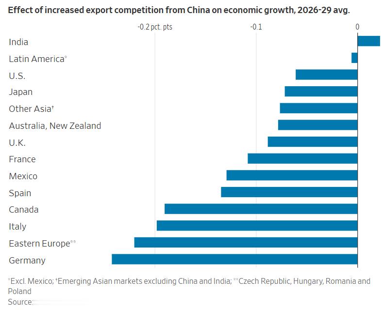 WSJ:中国的增长是以牺牲世界其他国家为代价的这事是高盛发了个报告,说中国增长会使其它国家增长率下降。WSJ这些机构也来宣传,是换了个手法攻击。以前是说中国要崩要完,现在也还在说,但效果不佳,还是老问题,说不圆。另一边,中国前11月顺差超万亿美元,就成了不错的攻击目标。高盛估计,中国经常账户顺差2029年将占全球GDP的1%,二战后任何国家都没这么大。以前中国产量增加1%,全球其他国家的产量将增加0.2%,因为中国带来了进口,这是真的,全球商品期货牛市就是这么出来的。但现在高盛得出结论,双方关系已转为负面。中国商品更便宜会提升外国购买力,但中国竞争对别国制造业的冲击更大。高盛预计未来几年中国出口优势让年增长率提升约0.6个百分点,但这使全球其他国家的增长率下降0.1个百分点。图为各国受损的数值,除了印度受益,其它国家都受影响。这个理论是承认中国制造无敌了,外国确实不知道怎么竞争,中国优势太大了。但是说中国增长让世界其它国家受害,这就是恶毒攻击。交易是自由的,别国都是比较选择后,自愿买中国商品,不买西方质次价高的劣质商品。至于说别国增长率受损,这种所谓的估算就是这些歪嘴报告的拿手好戏,系数怎么定一下,想要什么结论都能弄出来。中国拉动别国经济增长的事,多得是,已经有些合作典范。例如中南半岛,就搞得不错,几个国家都受益,局面也稳定了。至于说发达国家公司竞争搞不过,增长率下来了,这是替天行道!难道让这些开高价剥削第三世界穷国的黑心公司继续为所欲为?全球用上中国优质商品的,如果能把这些公司干死,那是喜大普奔!虽然西媒这波是攻击,但客观上可能还算是正面宣传。中国强大无敌的形象起来了,各国自有利益各自盘算,但都会知道有困难要找中国,也许能得到帮助,不能无视了。强大的中国对世界是好事,这很容易证明,只要看西方人干了多少坏事就知道了。