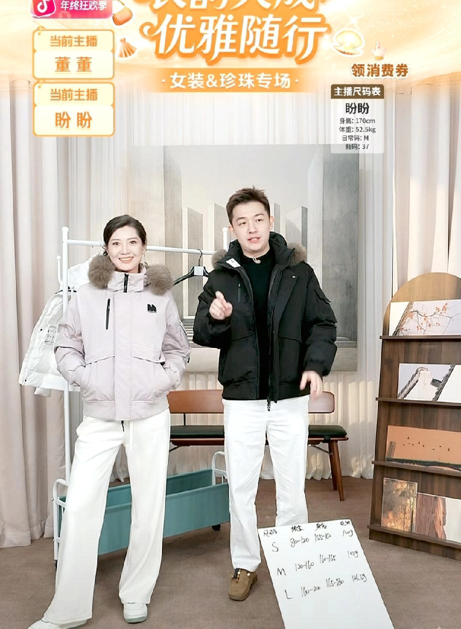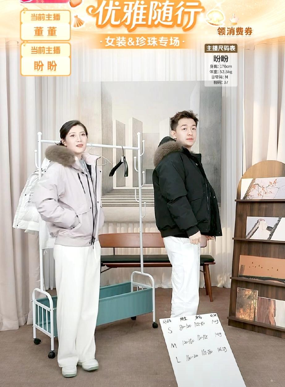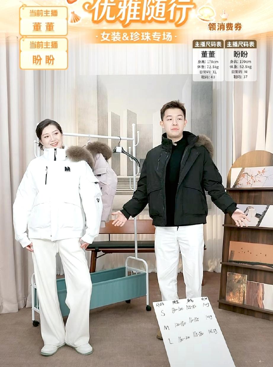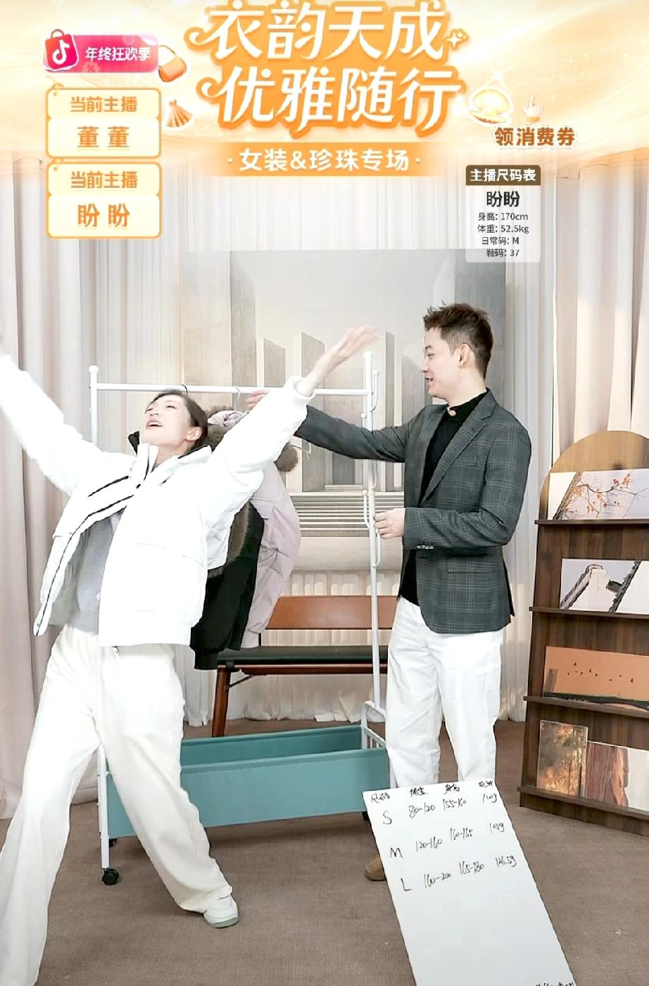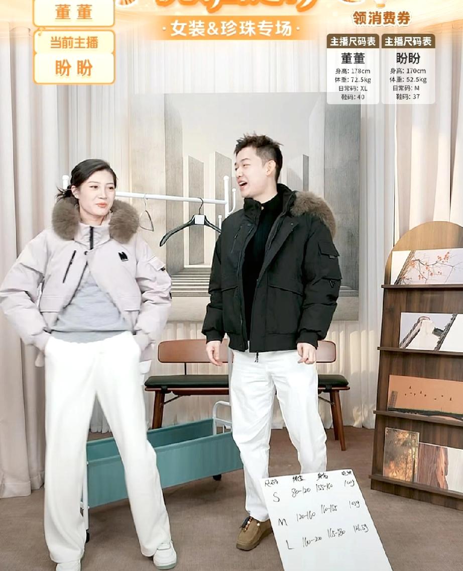 董董、盼盼交接班又给大家带来今天的一波快乐!董董来时,盼盼正在讲一款派克羽绒服。 盼盼说衣服上面一个小兜里面可以装身份证、银行卡。董董说对于许盼来说还可以装吃的,喝的。 当有网友让盼盼试一下紫色的时候,有朋友说这是藕荷色。盼盼说我喜欢吃藕盒,还喜欢吃茄盒呢。董董说,你啥盒不喜欢吃,给你来个鞋盒得了。天呐,连鞋盒都出来了。 没想到春旭也变幽默了,在试衣服的防泼水时,董董给徐盼衣服上面倒带颜色的水。董董说这活我还是第一次亲自干,春旭却在旁边来了一句一语双关,“你在给同事泼脏水。”董董说春旭变坏了,把自己写在日记里的第一句话都说出来了。说说笑笑中,羽绒服已卖断货。 董宇辉 与辉同行 兰知春序 盼盼