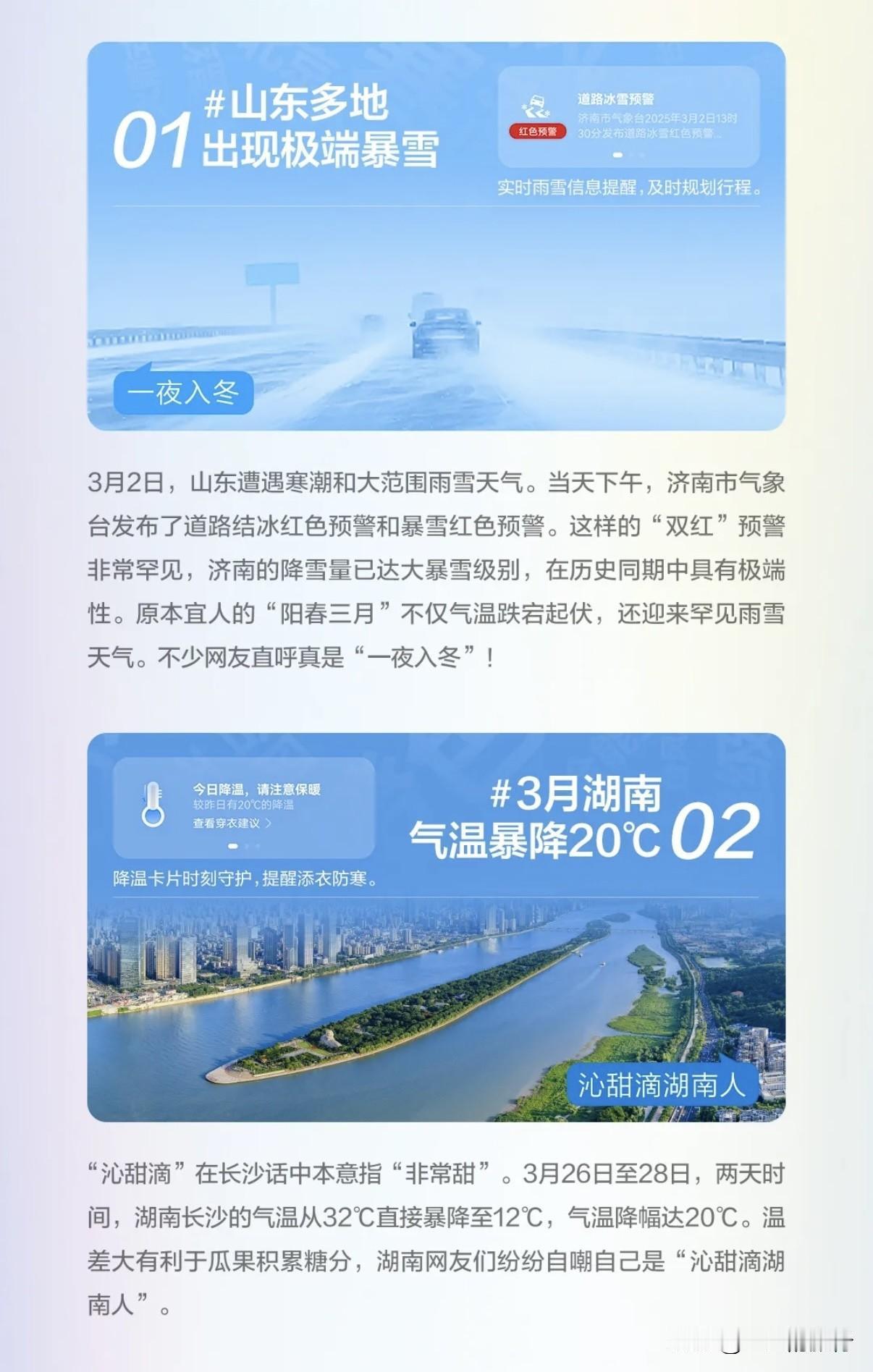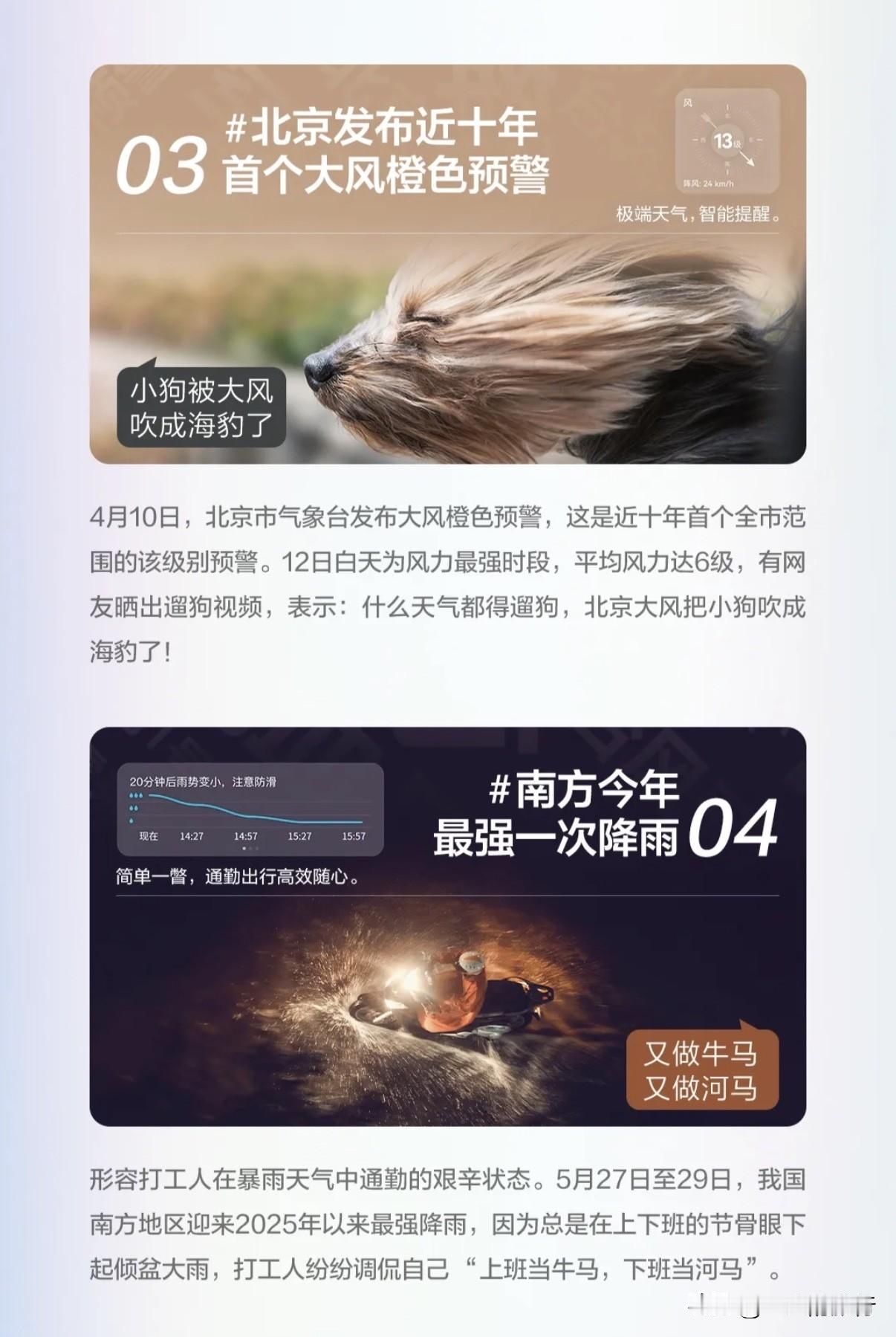 华为天气年度榜单出炉?不不不,这是我的年度“渡劫”实录 今年天气主打一个“优雅发疯”,冻得瑟瑟发抖的时候,真的有种改名“夏冬春”的冲动,因为秋天已经被“一剪梅”了! 乙巳蛇年开始的时候,谁也没想到,天气直接变成了开盲盒模式。最近华为天气年度榜单新鲜出炉,详细盘点了年度十大天气事件,死去的记忆突然开始攻击我。 尤其是今年的南方最强一次降雨,那一天,暴雨跟依萍找她爸要钱那天一样大。 不巧,我们一家人正在海边享受美妙假期,景区直接变成了水帘洞。 多亏华为天气首页智能卡——我的电子孔明赛博丞相。大风、暴雨一条条异常气天气预警争先恐后地蹦出来。降雨提醒更是能精确到每分钟,让我直接预判了老天爷的预判。瞬间我心不慌了,一家人从从容容的上演了一场人在雨途,趁着雨变小的间隙赶回了酒店。 抱着热茶再次点开华为天气,上面显示未来几天预报都有狂风暴雨。好在,未来15日的降水概率,风力云量等数据都应有尽有,让我能游刃有余的安排接下来的旅程,改签酒店和机票。 最终大雨没有让旅行泡汤,反而增添了一抹别样的色彩。一家人开开心心平平安安的结束了旅行。 如今,“断崖式”降温 又来了,回头再看华为盘点的年度天气榜单,我忍不住有点小惆怅,这明明是我的 2025 “渡劫”实录哇! 大家也来八一八,华为天气 年度榜单,你们最难忘的是什么? 是被台风毒打,差点和太阳肩并肩;还是被热浪融化,变成新鲜出炉的“热狗”? 快来一起盘点你的天气记忆吧! 鸿蒙2025年度先锋榜揭晓