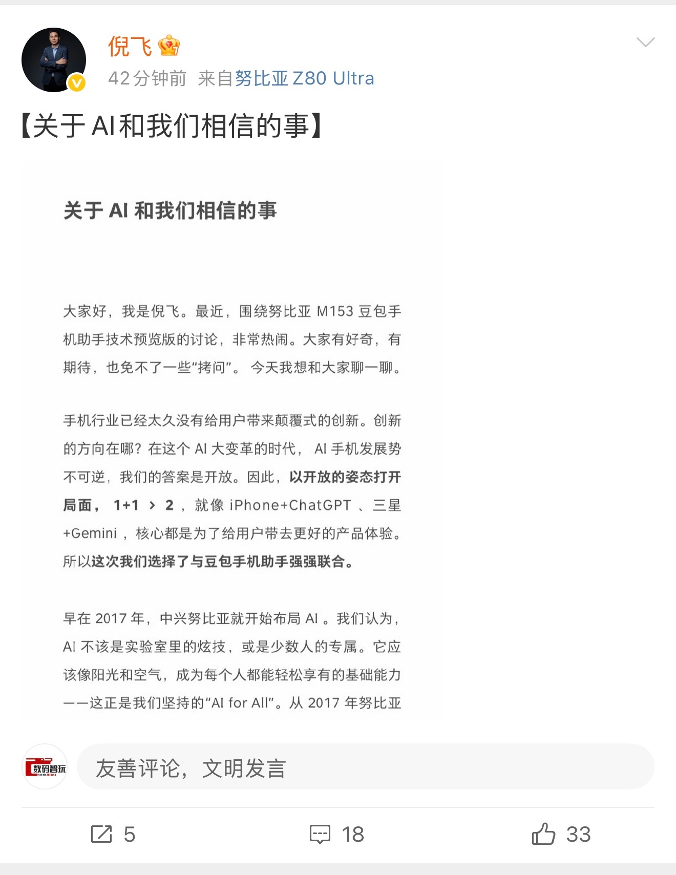 努比亚总裁倪飞回应豆包手机中兴努比亚从2017年开始布局Al,到今天与豆包共同打造的“努比亚M153豆包手机助手技术预览版”,十年来的坚持,在这一刻厚积薄发,实现了1+1>2的使用体验。手机行业真的需要创新,更需要努比亚这样的技术实力派,希望未来看到Al体验更完美的“努比豆”手机。