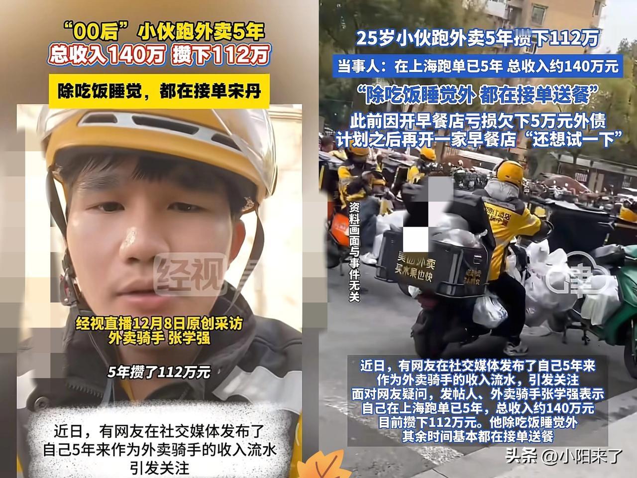 上海一00后小伙为了还5万外债,竟然选择跑外卖,不到1年就还清了债务,5年时间赚了140万,刨开花销,攒下了112万存款 每天清晨10点扎进站点,凌晨1点才拖着疲惫回隔间,雨天溅满泥的裤脚、小跑不停的脚步,是他的日常标配! 10块钱的两素一荤、3块钱的肉包,加个蛋的泡面就算“改善伙食”,5年没逛过街、没聚过餐,把“能拼”和“会省”做到了极致,最后硬生生攒下112万! 这哪是“运气好”,分明是普通人破局的最笨也最管用的办法!我们总喊着“卷不动”“赚不到”,却忘了:不是赛道不行,而是我们既没勇气像他那样咬牙硬扛,也没耐心沉下心来深耕! 他的坚持从不是让所有人都透支身体去换钱,而是戳破了一个真相:普通人的底气,从来都是熬出来、拼出来的,不是等出来、怨出来的! 那些看似遥不可及的数字,拆开了,不过是日复一日的坚持和精打细算!