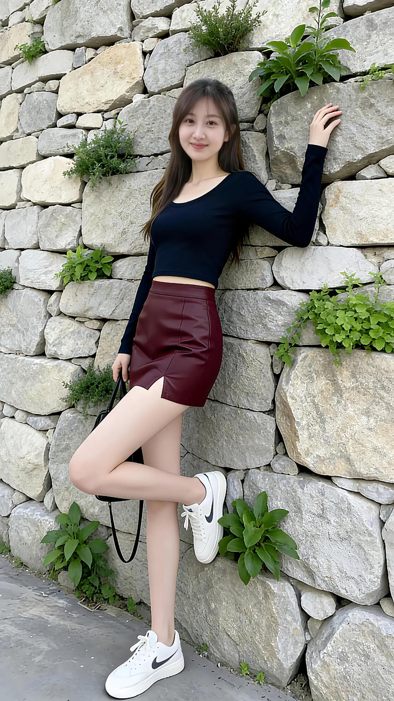 怎样穿搭知性又显身材? 都市时尚穿搭指南:黑色长袖上衣+酒红色皮裙+白色运动鞋,轻松凹造型!👗👠👟
