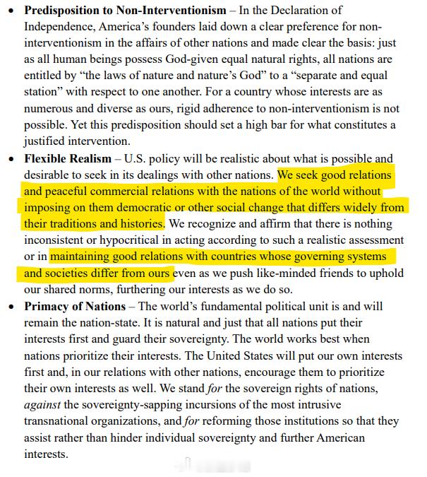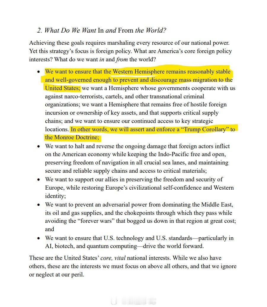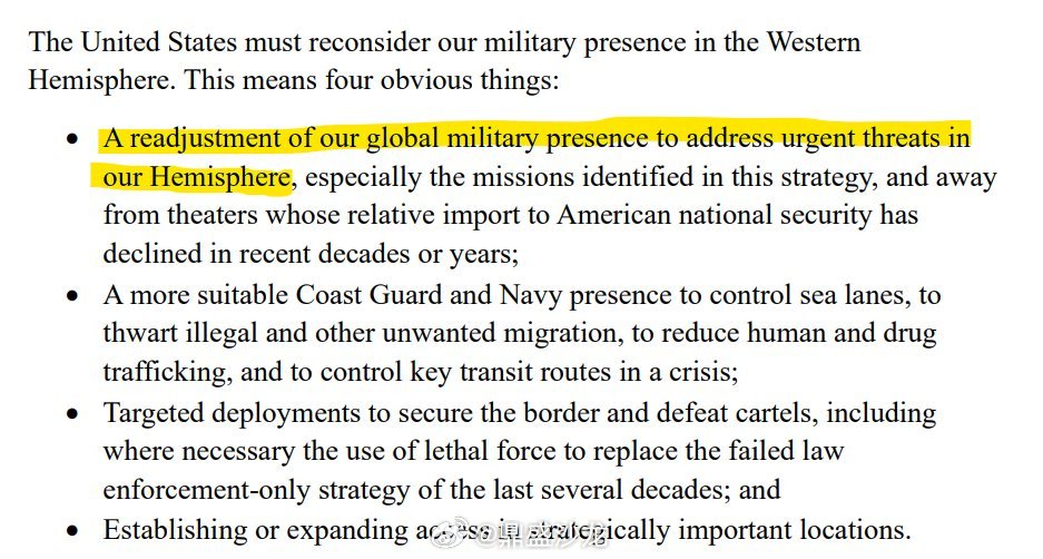 烽火问鼎计划 外国人如何看美国最新发布的国家安全战略该文件明确将此确立为美国的头等优先事项,称美国现在将“维护和执行‘门罗主义特朗普推论’”。就军事存在而言,他们写道这意味着“调整我们的全球军事存在,以应对我们半球内的紧急威胁,并远离相对重要性近年来或数年前对美国国家安全有所下降的领域。”关于中国,有两点。对我而言,最引人注目的方面是,中国不再被定义为“主要威胁”、“最重要挑战”、“领跑式威胁”或类似以往此类文件中使用的表述。它显然被降为了优先事项。根据文档的结构和重点,美国的首要优先事项可以概括为:1) 国土安全与边境(移民、贩毒集团等)2) 西半球(门罗主义恢复)3) 经济安全(再工业化、供应链)4) 中国与印太地区要明确的是,他们并未将中国定义为任何形式的盟友或伙伴,而主要将其视为:1) 经济竞争者,2) 供应链脆弱性的来源(但也是贸易伙伴),3) 一个其区域主导地位应被“理想上”否认的参与者,因为“这对美国经济有重大影响。”有趣的是,我认为这是他们首次提到有可能在军事上被中国超越:- 他们写道“通过保持军事优势来威慑台海冲突是优先事项”:这里的“理想上”显然意味着这是理想状态,但并非必然。他们仅将威慑台海冲突称为“优先事项”,这也暗示,从定义上讲,它并非最高战略优先事项,或核心利益。- 在台湾,他们还明确暗示,如果美国的“第一岛链盟友”不“挺身而出并花费——更重要的是实际做到——更多以集体防御”,那么可能会出现“对我们极为不利的力量平衡,以至于使保卫那座岛屿变得不可能”的情况。他们仍然坚持“美国不支持任何单方面改变台海现状”,但显然,美国声称反对的事情与它实际上愿意为此采取的行动之间存在着日益扩大的差距。有趣的是,与之前的此类文件不同,当涉及到中国时,该文件中没有任何意识形态维度。没有“民主与专制”的框架,没有“基于规则的国际秩序”需要捍卫,也没有基于价值观的十字军东征。中国被视为一个需要管理的实际问题,而不是一个需要击败的意识形态对手。事实上,该文件明确提到,我认为这是有史以来第一次,美国政策现在是这样的:- "并非基于传统政治意识形态" - 他们"寻求与世界各国建立良好关系和和平的贸易关系,而不强加给他们与他们的传统和历史差异巨大的民主或其他社会变革"- 并且他们寻求"与那些治理体系与我们不同的国家建立良好关系"这完全背离了过去几十年的言论。我们都知道这一点,但现在充分表明,美国外交政策中传教士式的自由国际主义时代已经结束。与中国之间的竞争主要从经济角度描述,而且非常明确:他们写道竞争是关于“赢得经济未来”,并称经济是“最终的赌注”。值得注意的是,他们承认从 2017 年开始的对华关税策略基本上失败了,因为“中国适应了”并且“加强了其对供应链的控制”。如文件所述,新的策略是建立一个针对中国的经济联盟,这个联盟比美国经济单独行动拥有更大的影响力——这暗含了美国已经不再足够强大的承认。然而,这种矛盾是显而易见的:不清楚如何在同时与你的联盟伙伴进行贸易战、要求他们承担更多的自身防御责任,并将每个盟友关系都视为需要以美国利益为前提重新谈判的协议的情况下,建立一个针对中国的经济联盟。某个时候,这些"盟友"会问一个非常明显的问题:为什么我们要牺牲自己的经济利益来支撑一个已经无法独立竞争的美国——而它回报我们的越来越少?