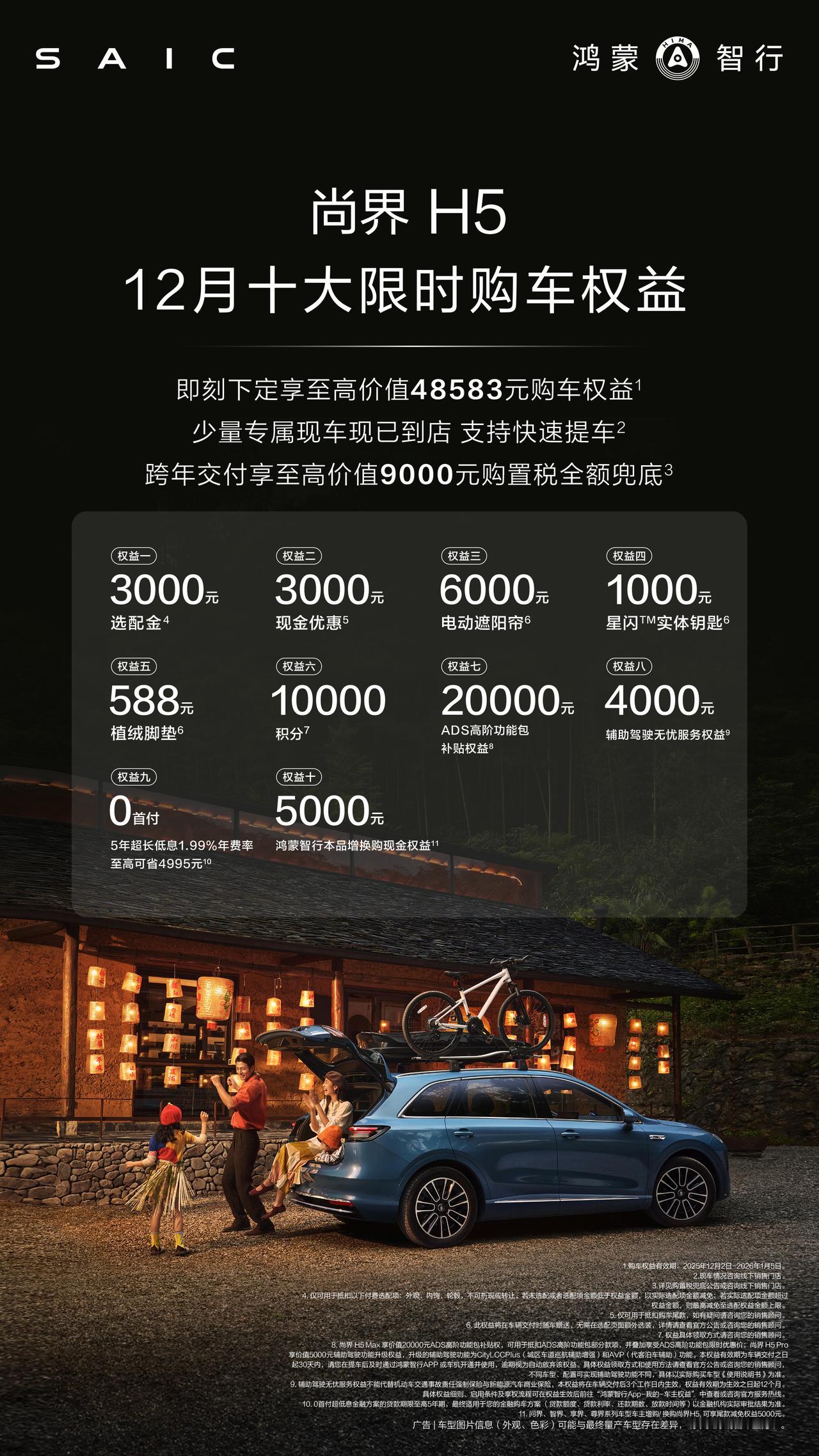 12月9日鸿蒙智行央视年度直播“五界同台”强势破圈,尚界H5不仅在直播间全方位展现了产品硬核实力,更甩出累计交付突破2万台的重磅捷报,一举刷新行业对新势力车型交付效率的认知。这一亮眼成绩的背后,是华为前沿技术、鸿蒙全场景生态与上汽成熟制造体系的深度融合,更是市场与用户对这台“15万级智能超值神车”的高度认可。 年末购车黄金窗口期已至,尚界H5的入手时机堪称绝佳:全国多家门店已到店少量专属现车,“现在下定尚界H5马上出发,马上“發””。叠加12月限时购车权益,既能享受多重补贴福利,又能实现“下定快提、跨年开新车”的畅快体验。 不管是日常通勤代步、全家假日出游,还是即将到来的春节返乡,尚界H5都能兼顾智能交互、行车安全、舒适空间与多元续航需求。与其继续观望错失良机,不如抓住年末窗口果断下定,早一步解锁鸿蒙智行带来的智能出行新生活。