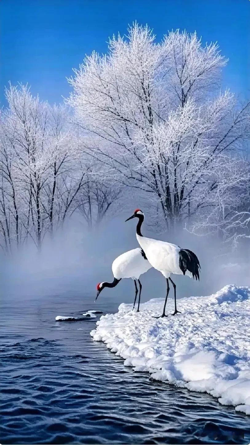 冬日仙鹤翩翩起,雪地冰天美如画。
