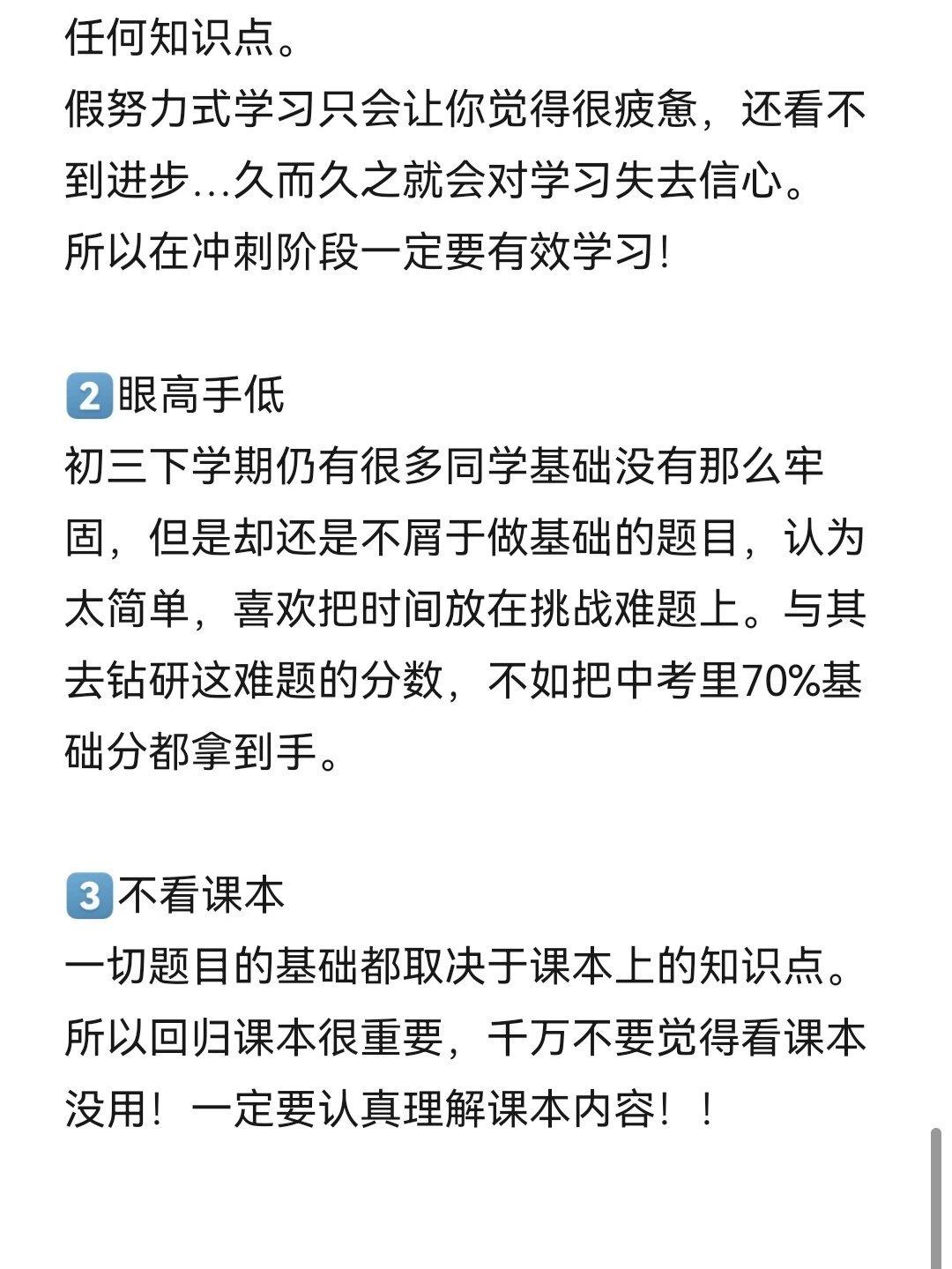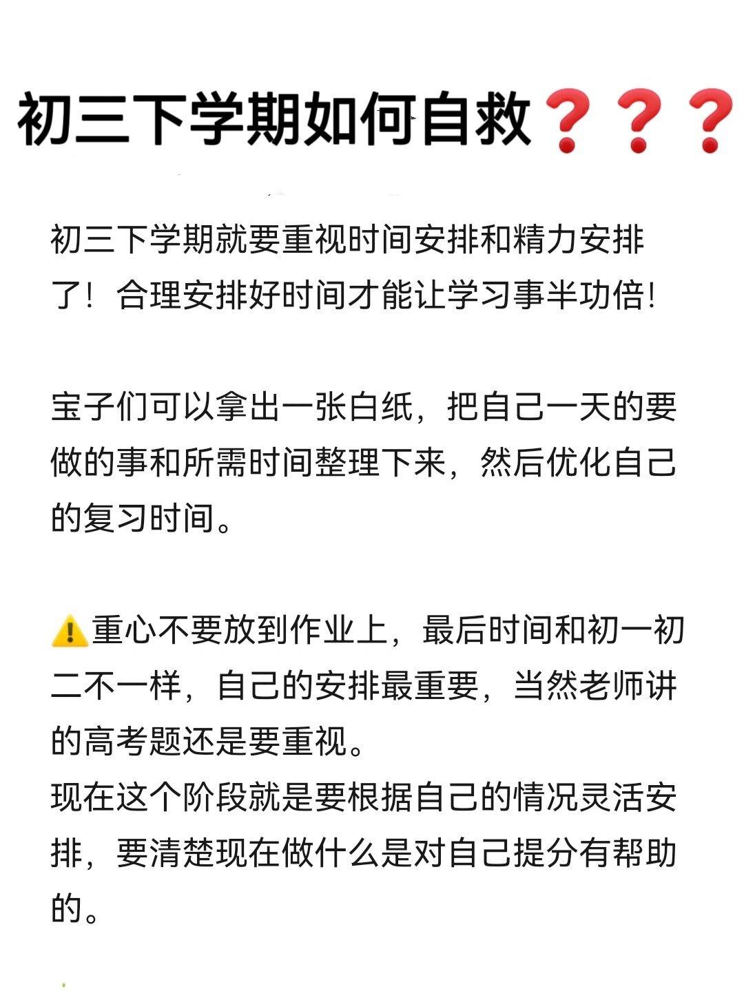 中考生初三下学期该如何自救?这是我见过一个最完美的答案,这是一位当了多年的初三班主任总结出来的经验,并且全都毫无保留的分享出来了。简单来说,初三下学期就要重视时间安排和精力安排,合理安排好时间才能让学习事半功倍!家有初中孩子的,赶紧保存下来,特别是孩子读初三的,一定要让孩子看一看,孩子能按照这些方法执行,中考起码提高20分以上。#寻美三湘##长沙新朋友#