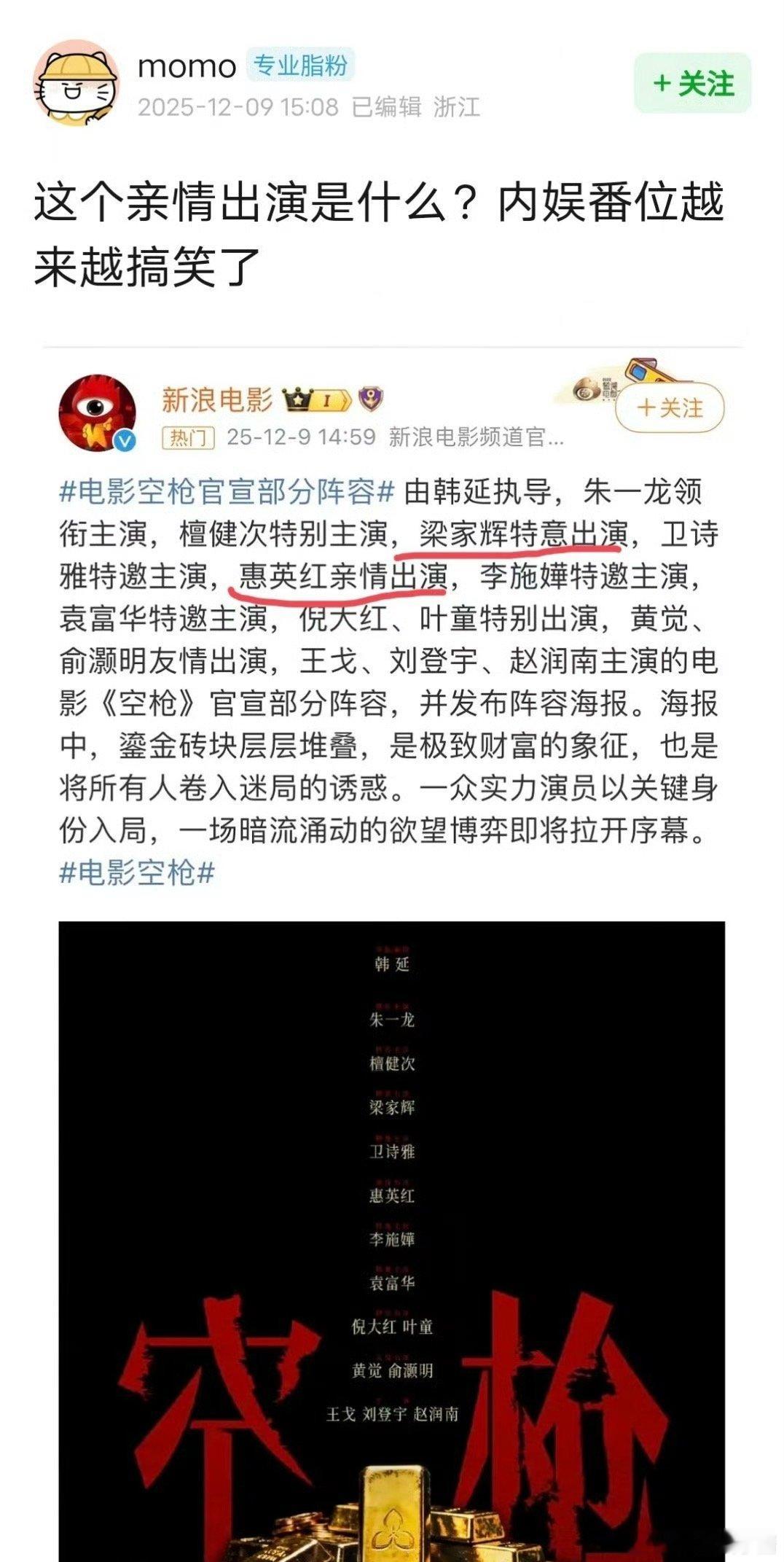 电影空枪官宣部分阵容好离谱官宣梁家辉给朱一龙作配….檀健次被朱一龙压了做特别出演