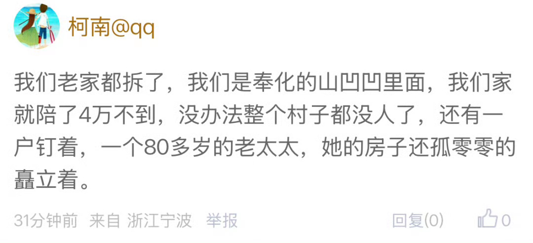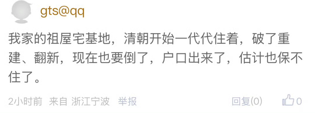 宁波城里有房了乡下老屋有必要重建吗 ?宁波男子发愁!城里有房了,乡下老屋有必要重建吗?网友:农村的老房子千万不能丢!有人支持修缮,老房子在,根就在!可是有网友分享了自己祖屋的遭遇,祖屋从清朝开始一代代居住,如今破败不堪,却因户口问题,即便想重建、翻新也难以实现,只能无奈地看着它走向消亡。还有奉化山凹里的一位网友,整个村子几乎无人居住,他们的老房子拆迁补偿极低,仅仅4万不到,却也无力改变这一现状,只剩一位80多岁的老太太坚守着孤零零的房子。 你们在农村有房吗?来源:东方热线