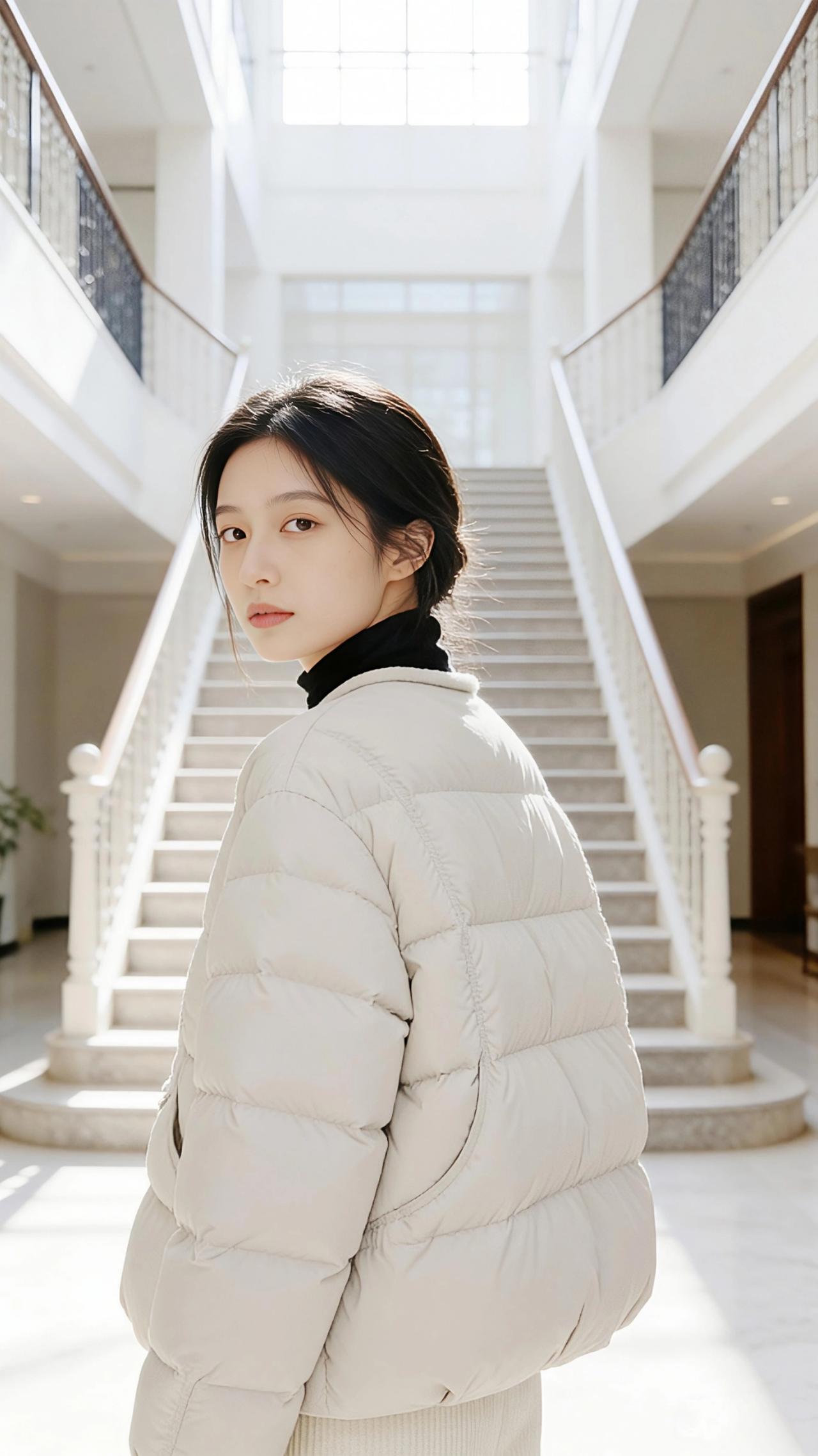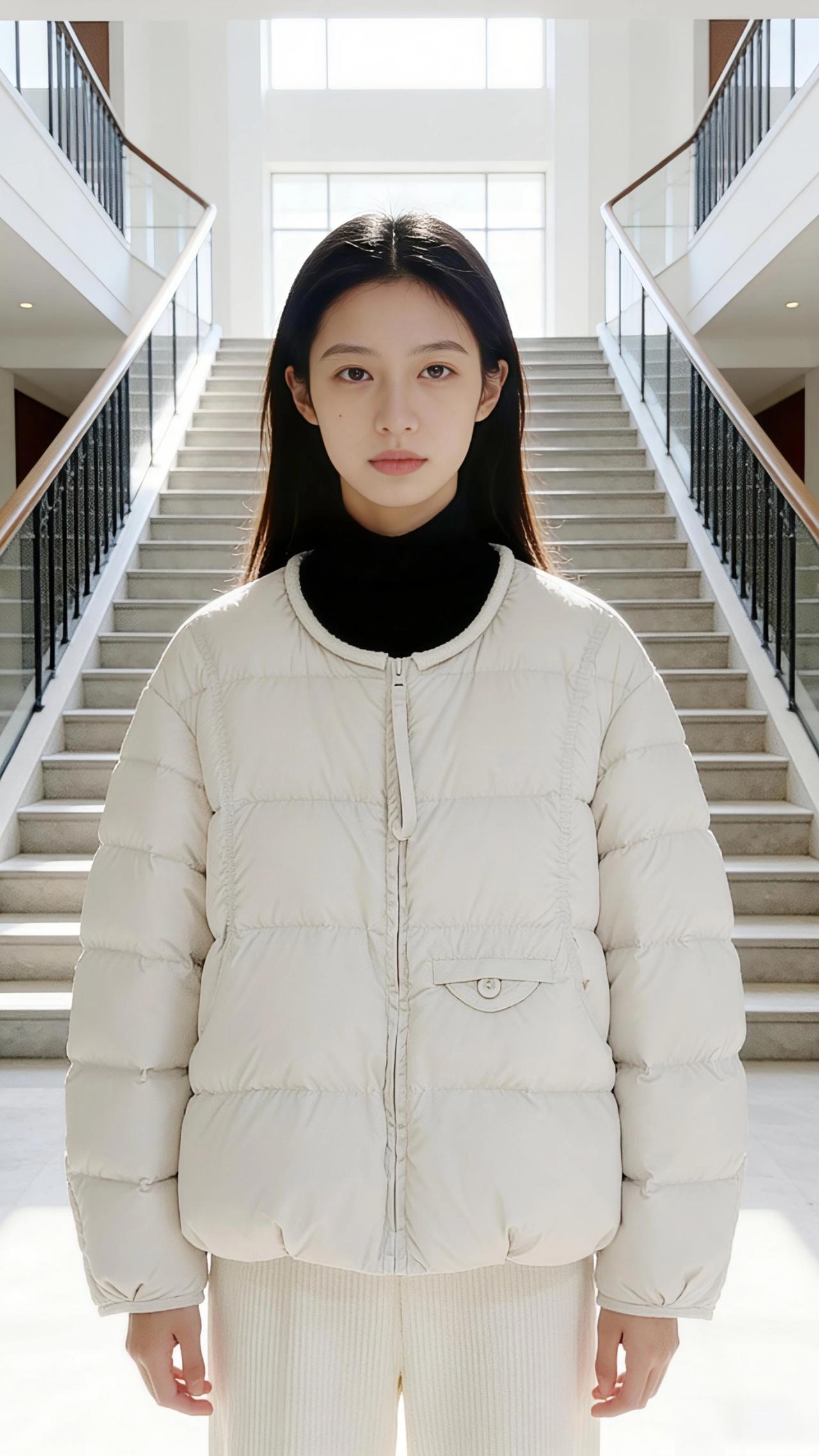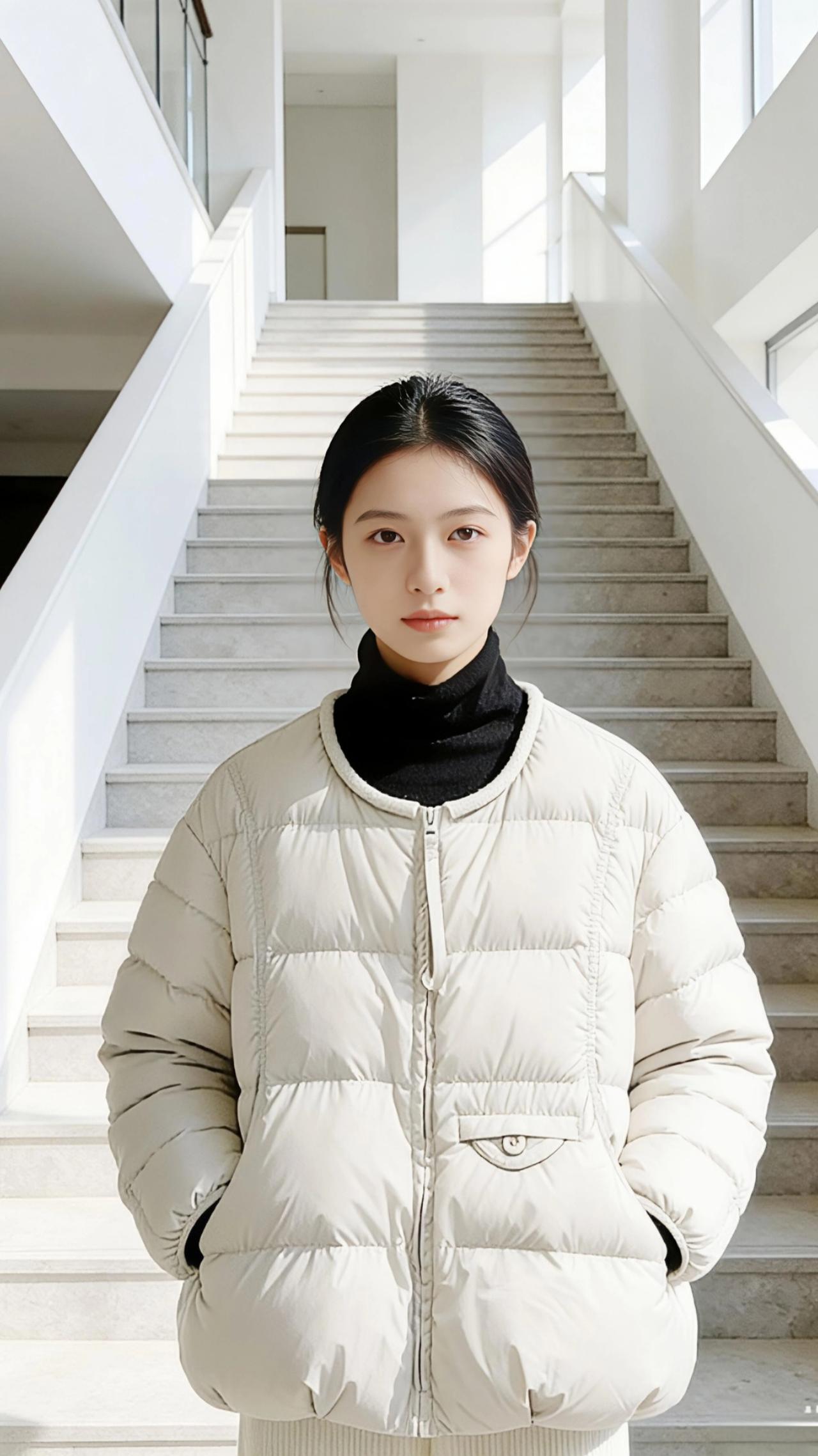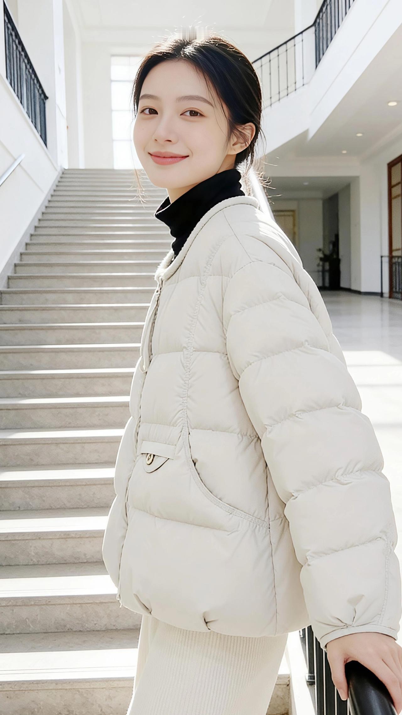 冬日的光,是裹着绒的。 她立在楼梯间,米白的羽绒服像揉皱又铺展的云,软乎乎落满肩头。领口漏出的黑,是这团暖里最利落的一笔,像咖啡上的奶泡尖,轻轻勾住光的轮廓。 楼梯是浅灰的琴键,光从天窗漏下来,在台阶上敲出明暗的音阶。她指尖搭着扶手时,发梢的碎绒也沾了光,连带着那粒口袋纽扣,都成了云里藏着的星。 风该是轻的,否则吹不动她发尾那点软;衣料该是暖的,否则裹不住这整栋楼的静。原来冬天不必沸沸扬扬,只消一身软和,就能把日子过成刚晒好的棉被——蓬松,且带着光的温度。 高级感穿搭小个子穿搭 棉服也能穿出时尚感 棉服