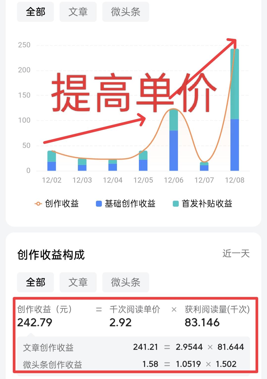 单价达到20元、30元、50元?甚至更高,这是每个自媒体人梦寐以求的事。 应很多粉丝友友邀请,要我好好说一说怎么提高单价的事情。 其实,各位友友不需要称我为老师,大咖等称呼,我也和你们一样只是一个普通的创作者而已。 只不过做了九年而已,谈到单价的问题,分享以下几点观点希望能够帮助一些友友们。 第一,坚持输出,保持账号的活跃度。虽然如今没有了领域之分,但想要高单价,还是建议在同一个领域中深耕。 第二,写出爆文是让账号突破层级的关键。有时候,爆文出现后,会有一系列的连锁效应。 就好比武侠小说中一样,瞬间打开任督二脉,有一种写一篇爆一篇的节奏。 很多人会常常抱怨,我今天的阅读量达到了10万,20万,可收益却连50元都没有,不知问题出在哪里。 实际上,收益高低和咱们的文章有很大关系,如果你的文章平均时长,点赞,留言,转发等互动度高,那么其单价就不会低。 有些文章,在几个小时就达到了爆款,有时候往往单价不尽人意。 这样的爆文实际上无效阅读占比高,广告弹出率变少,收益自然低了。 另外,决定单价高低还和你文章匹配的广告有直接关系,广告商出价不同,故而单价浮动亦很正常。 第三,文章能否成为爆文,标题无疑是重中之重。 优质的标题能瞬间让文章来一波冷启动,也就是短时间里获取一部分基础流量,为爆款做铺垫。 切记,不要踩雷,不要让自己的标题成为标题党,否则你辛辛苦苦写的文章就算白费了。 宁可标题普通一些,标题中千万别用“惊喜”、“顶尖”、“超级”、“最坏”这类顶格式语气用词。 总之,做自媒体是一个长期积累的过程,不能半途而废,加油友友们,祝你们越来越好。