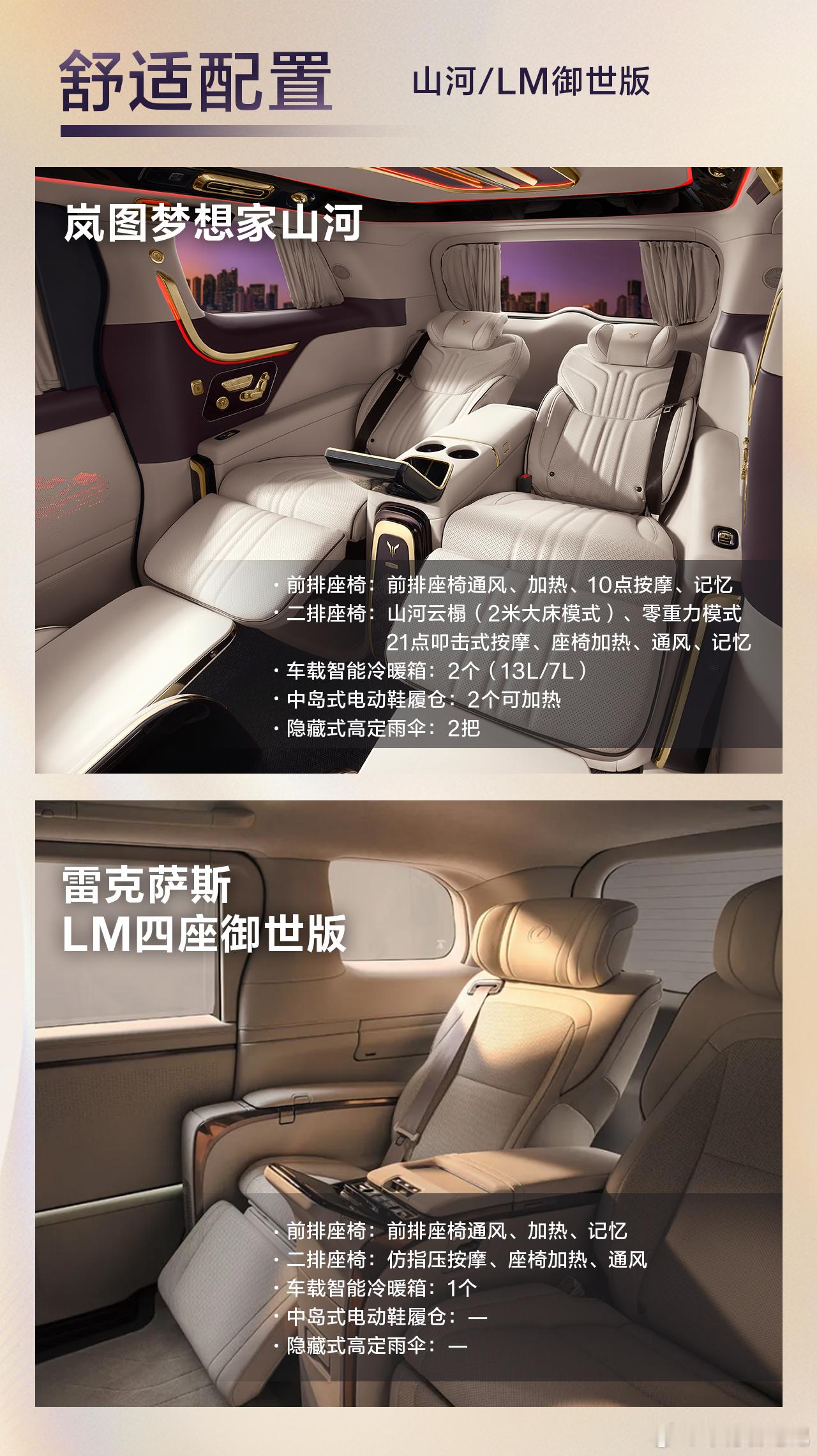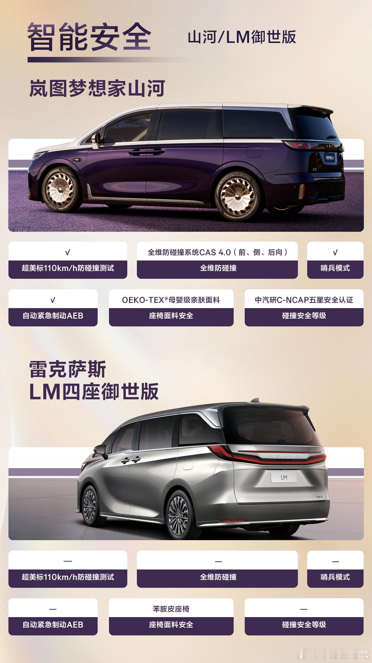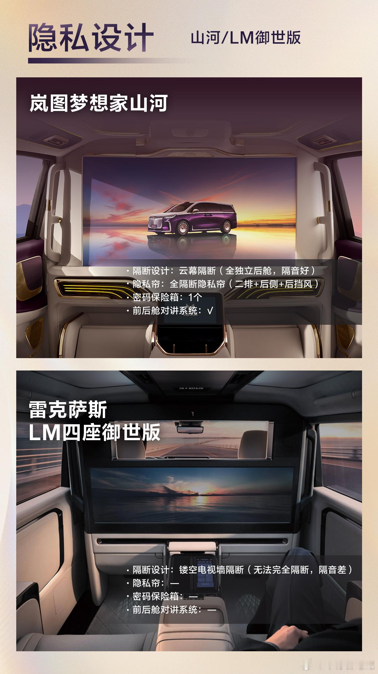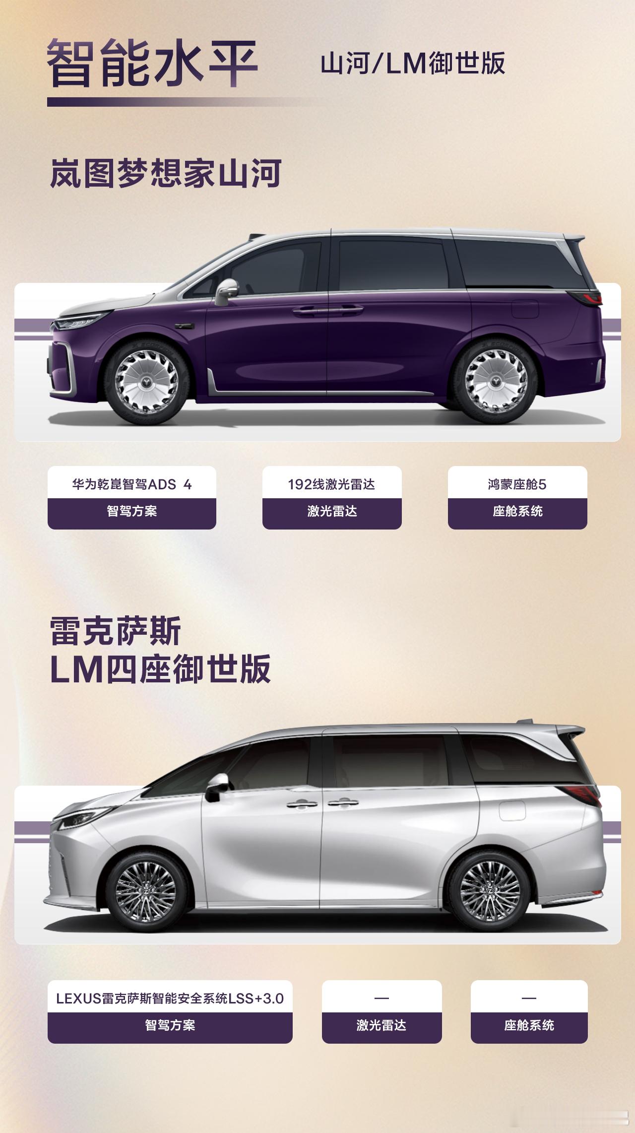 体面之外 山河之内的格调与豪华当一辆车愿意回应“体面”之外的渴望,它将变成什么?答案或许藏在安全的底气里:110km/h超美标防碰撞测试的刚性,全维防碰撞系统如同隐形的盾;母婴级面料座椅,让松弛在落座时降临。也在智能的温度里:192线激光雷达读取每一寸路况,鸿蒙座舱的顺畅交互,让科技从参数走向默契。更在空间的分寸里:作为豪华四座MPV,云幕隔断重塑前后舱为两个世界,山河云榻把车升格为移动的行宫。岚图梦想家山河,不仅仅是更好的MPV,是把出行这件事,还原成享受。岚图梦想家山河雷克萨斯LM豪华四座MPV国产豪华崛起