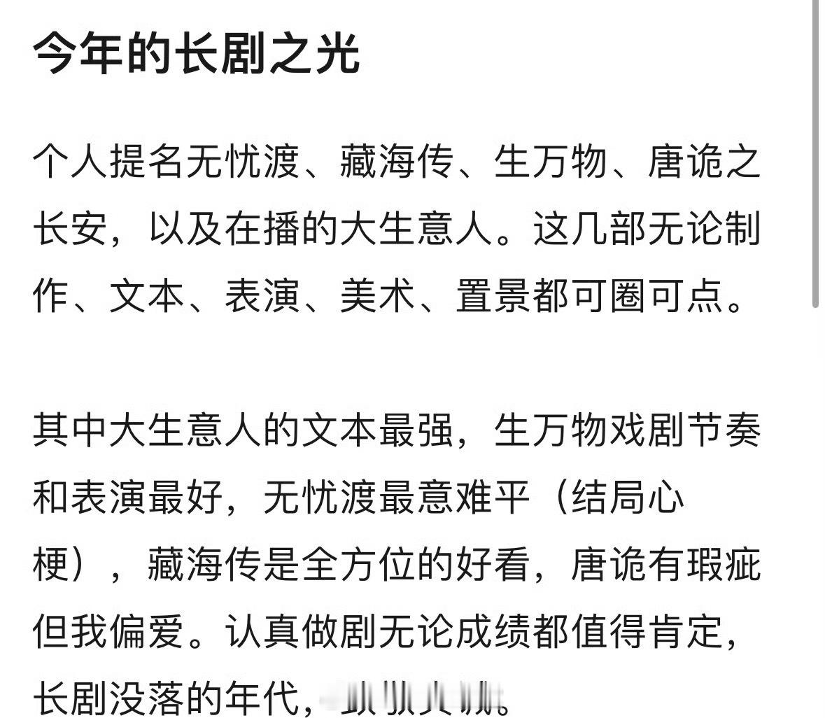 网友提名今年的长剧之光:《无忧渡》、《藏海传》、《生万物》、《唐诡之长安》、《大生意人》,同意吗?
