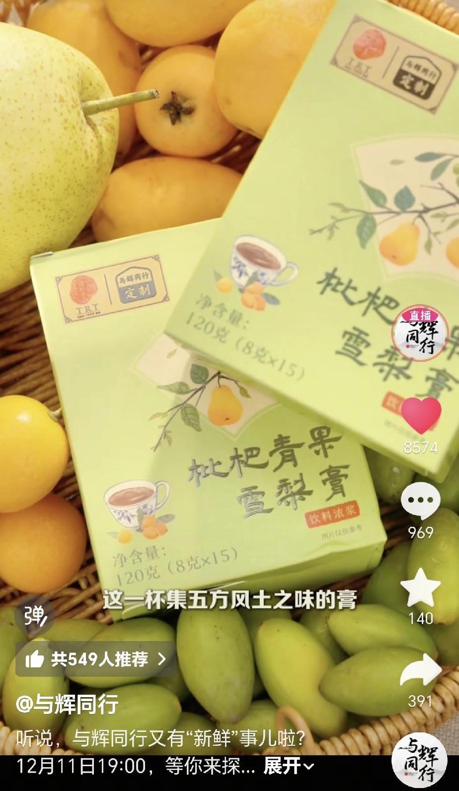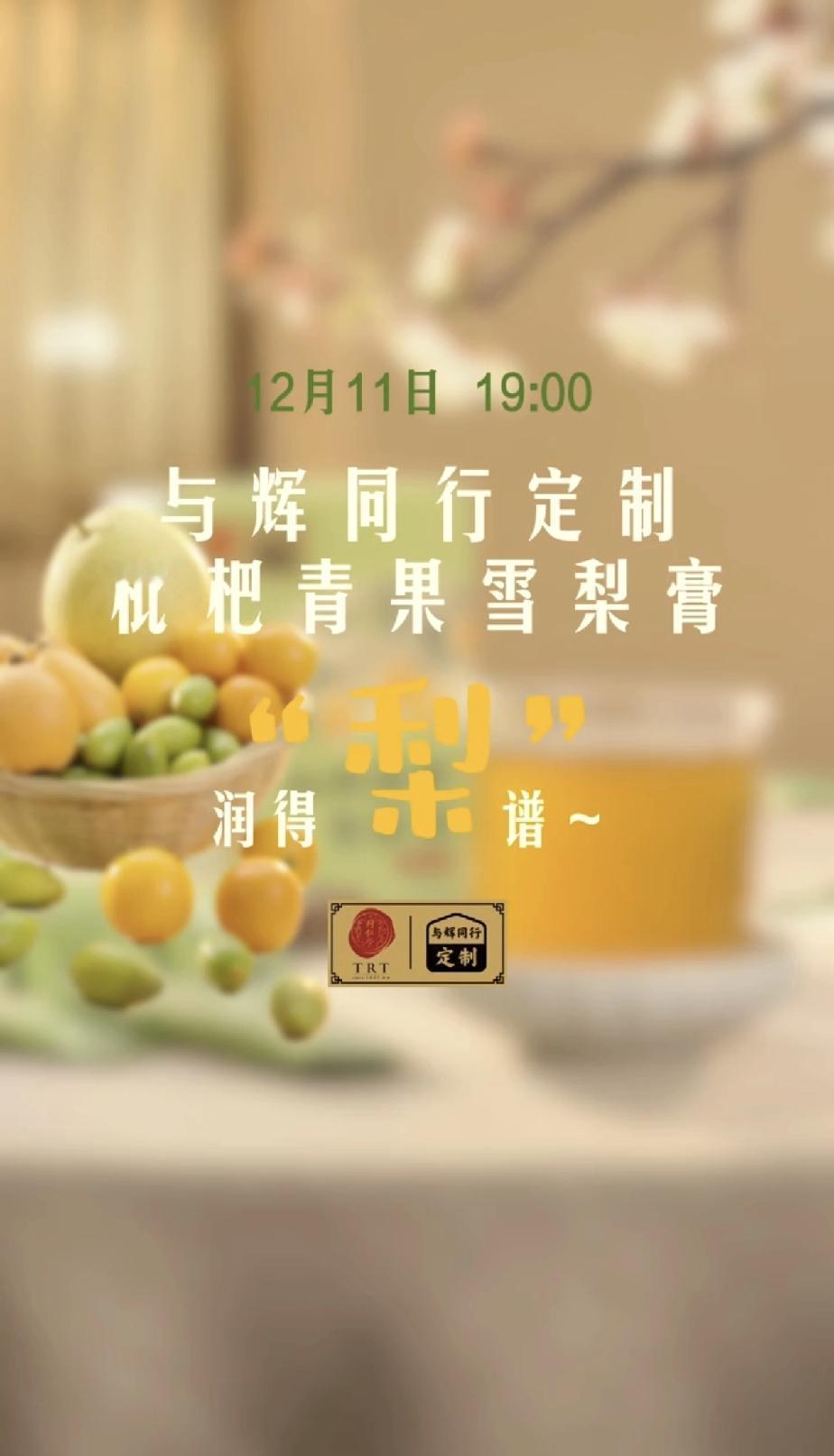 与辉同行又有一款将会卖爆的定制产品来了,它就是今天刚官宣12月11日开始上架销售的“枇杷青果雪梨膏”… 12月9日上午,与辉同行小编发布了一条有汉森出镜,内容很有创意的新品上市官宣视频。 在这条视频一开头汉森就搞的悬念十足的视频里,给大家揭秘官宣了一款即将在2天后,也就是11号要上架新定制产品“枇杷青果雪梨膏”。 这款雪梨膏之前就听宇辉提过几次,而且还跟大家解释了为何原本应该秋天就上架的雪梨膏,为何搞到现在都冬天了才上架?主要是因为在等这款“枇杷青果雪梨膏”的一款搭配水果“阳朔金桔”,因为这款水果要10月下旬才能成熟,所以只能等阳朔金桔成熟采摘后才能生产这款“枇杷青果雪梨膏”。 估计不少喝过雪梨膏的朋友都还是第一次听说“雪梨膏”里竟然还要放金桔的?因为传统的雪梨膏一般都是由雪梨、红枣、枸杞、百合干、冰糖和川贝粉这些原料配比制作而成,很少使用除雪梨外的其它新鲜水果。 但董宇辉安排团队小伙伴定制的这款雪梨膏却不光加入了阳朔金桔,然后又还放了闽侯青果、蒙自枇杷这两款新鲜水果,再加上赵县雪梨,那这款定制雪梨膏里可就使用了四款新鲜水果,要知道这四款水果可都是有“国家地理标志认证产品保护”的名优水果,市场价格可都是不便宜的,可见宇辉他们定制的这款雪梨膏绝对是货真价实成本不低的靓货。 所以这样一款精心挑选制作的雪梨膏绝对会卖爆,喜欢喝雪梨膏的朋友后天11号晚19点可别错过! 董宇辉