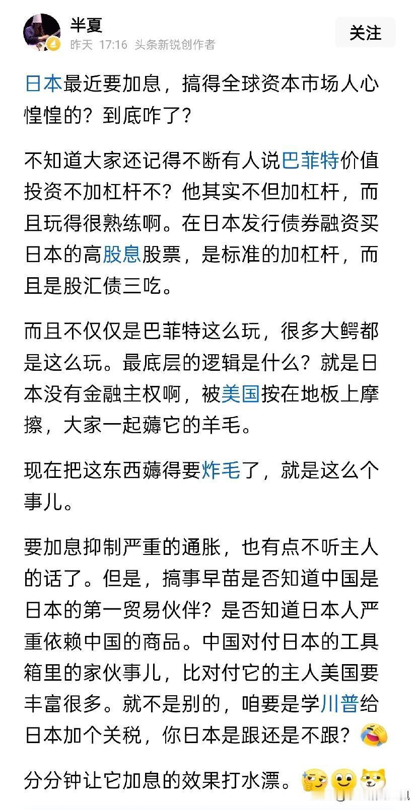 键政侠最爱的就是不懂装懂,冒充专家,话题还往往是国际政治经济的宏大叙事。动不动就是一些看似很高大上的名词,动不动就是金融主权啊。 他描述的场景,在全球金融市场上有一个明确的定义,叫做日元套息交易。日元套息交易长期以来在全球金融体系中扮演重要角色,投资者借入低成本日元后,一般将其兑换成高收益货币,配置到该币种计价的股债或结构性产品中,并不会在日本去购买金融产品(逻辑是日本的利息低,无论日本的债券,还是日本的所谓高股息股票,利率都很低)。套期交易一定是错币种的,不然借日币买日本的高股息股票,日本老百姓就可以有个赚钱的永动机了,还轮得到巴菲特来吗? 还有什么中国给日本加关税,让日本加息效果分分钟泡汤,真的让人笑掉大牙!日本加息是为了抑制通胀,当中国提高关税,日本的出口商品势必受到影响,当一部分商品的出口转换成内销,需要国内市场消化的话,国内的需求不增加,供给却大幅增加的情况下,商品价格将大幅下降,这不是帮着日本央行抑制了通胀吗?! 这位作者大部分内容质量都不堪入目,怪不得买了江苏银行之后,需要每天做T去维持盈利,实在让人笑掉大牙[笑哭][笑哭][泪奔][泪奔]