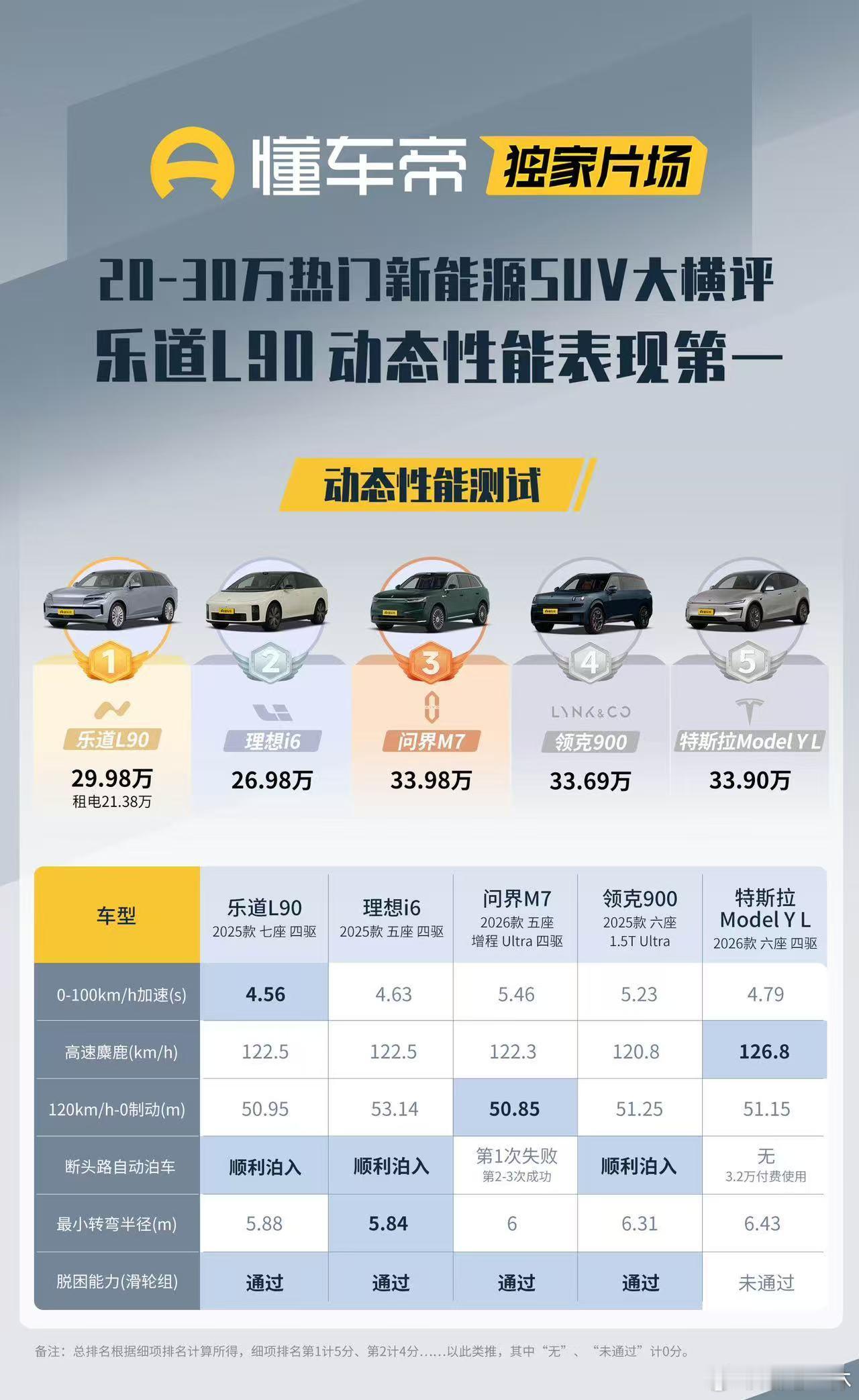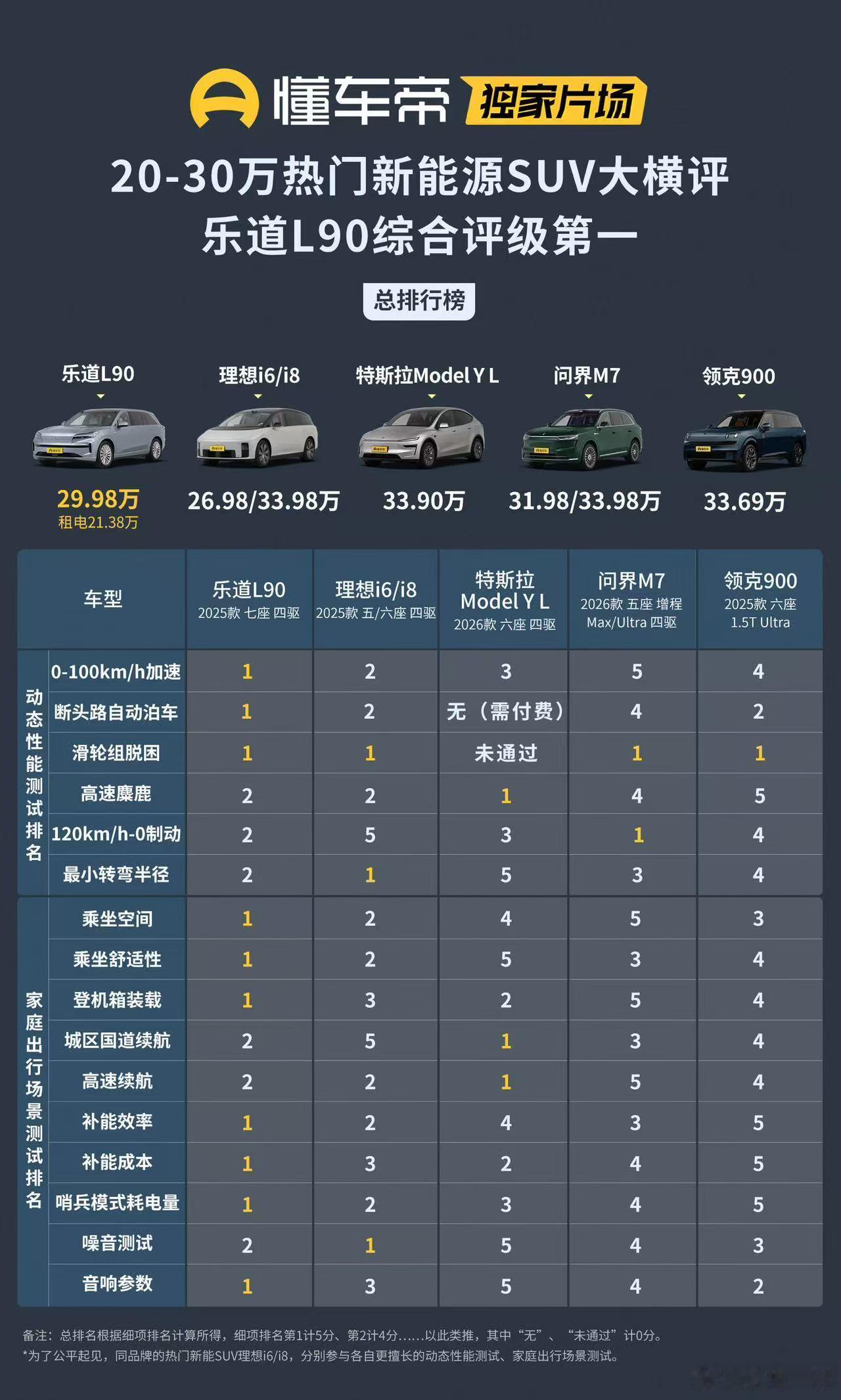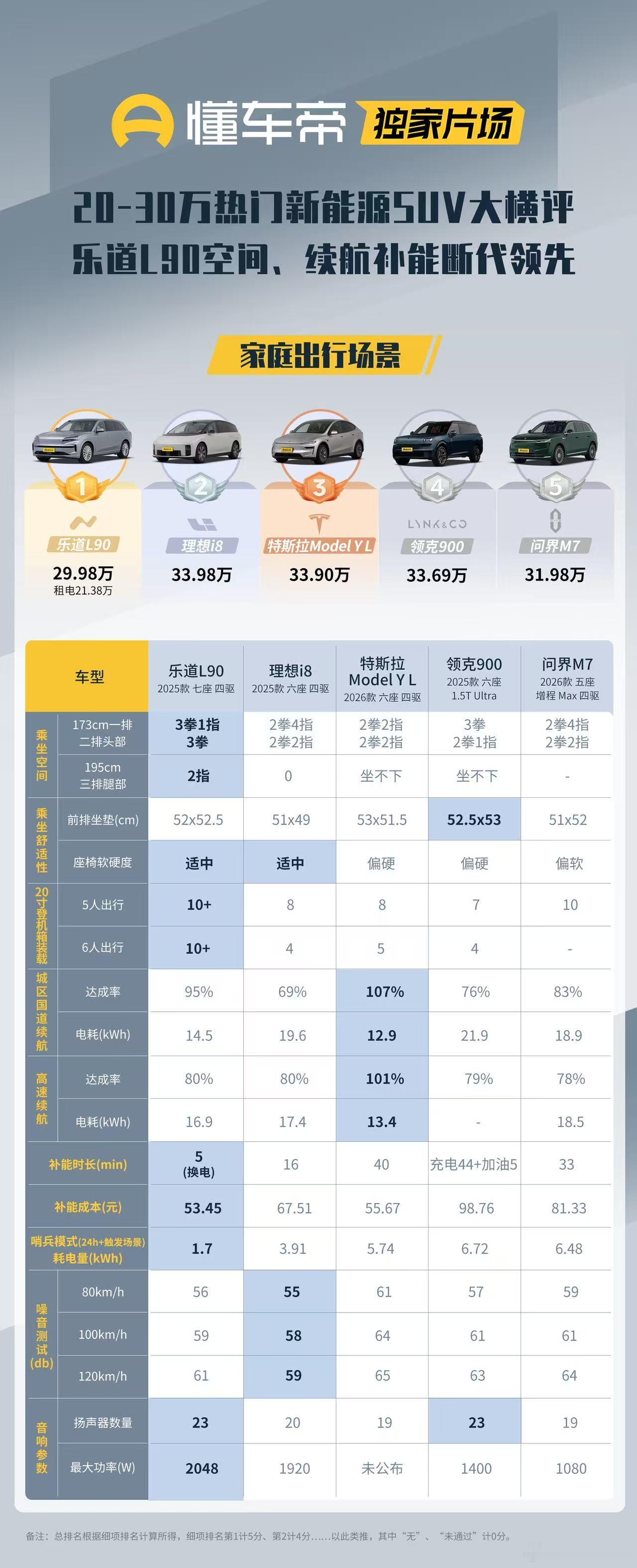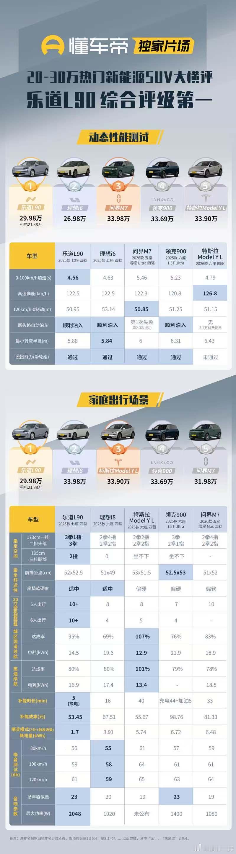 懂车帝“零充值”横评再出结果!乐道L90七座版凭“5+2”灵活布局强势夺冠,继六座版后实现两连冠!4.56秒零百加速超五座SUV,三排空间、储物全第一,补能快还省电,蔚来十年技术打底果然能打!纯电车型霸榜横评,新势力“八二开”时代已来乐道l90