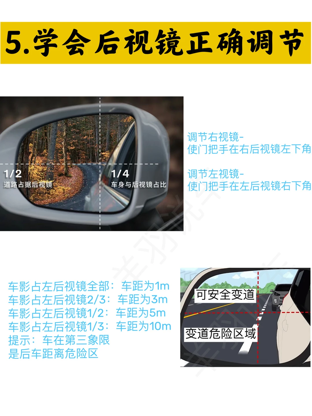 5⃣️例如后视镜,其实是可以调节到视野区域更大的。