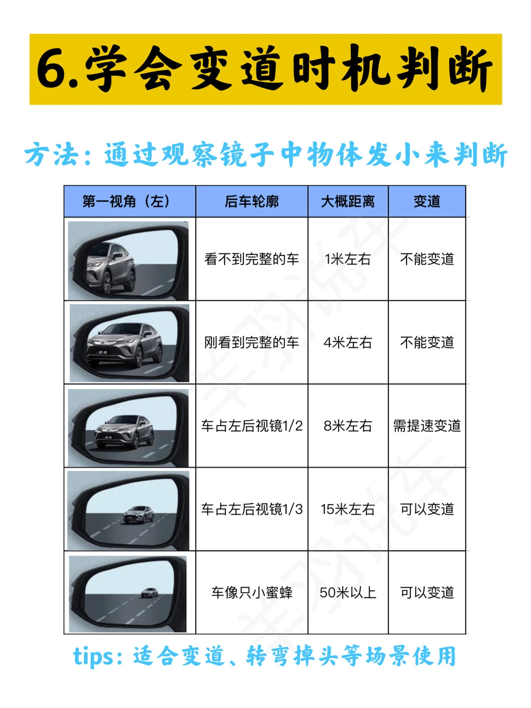 6⃣️例如变道的时候,是可以通过后视镜中车的大小以及变化来判断后车的速度和距离的。