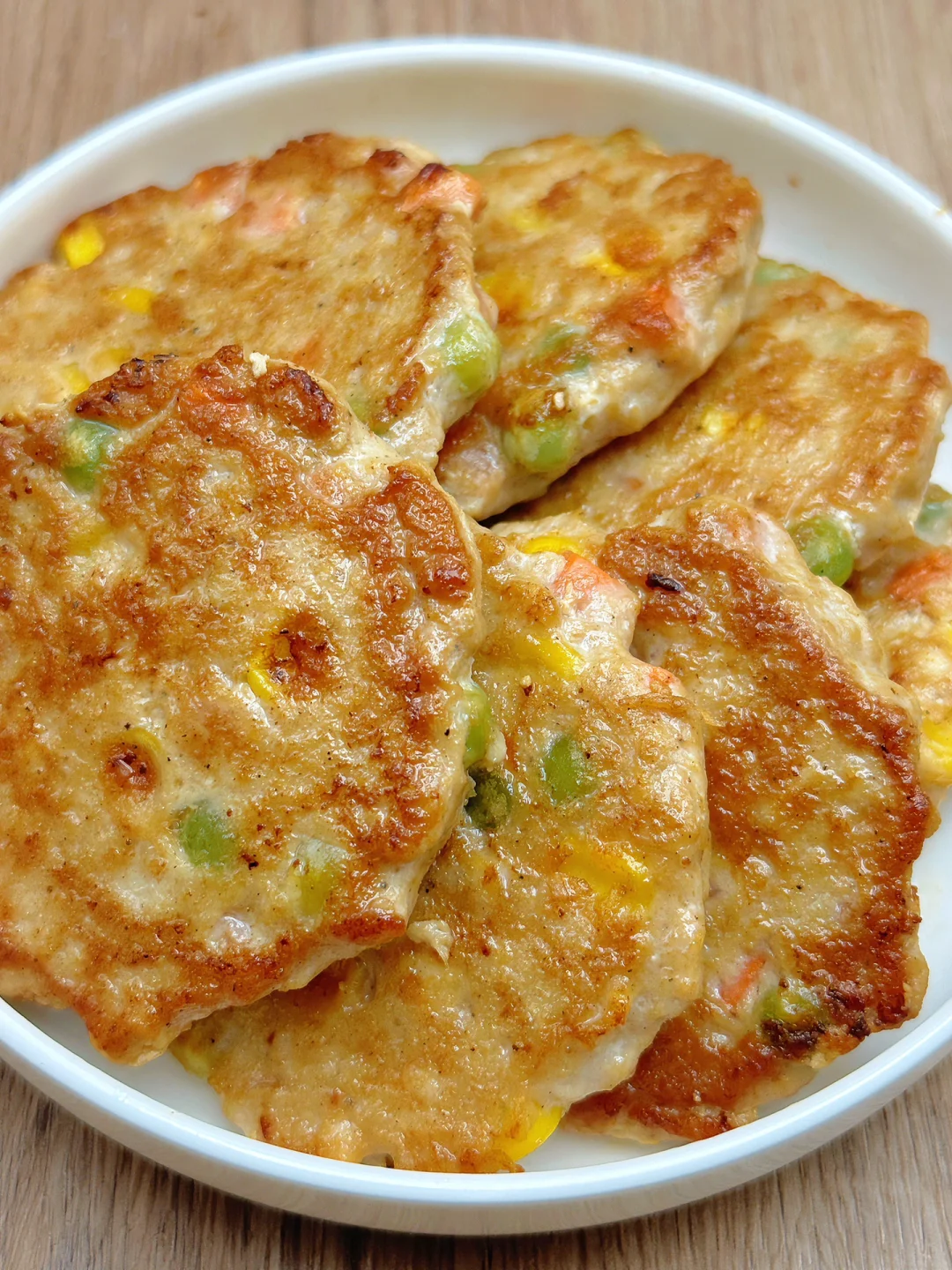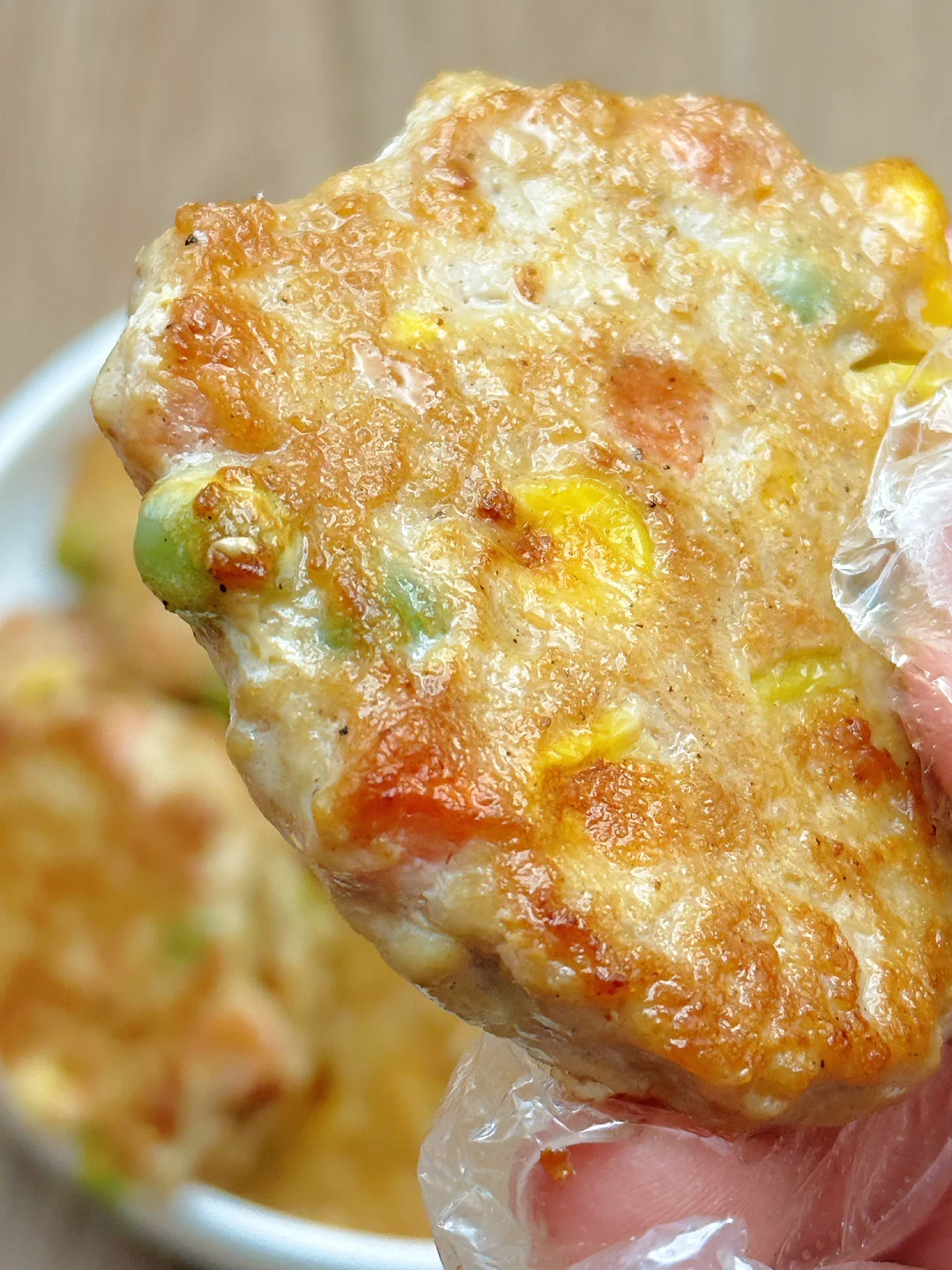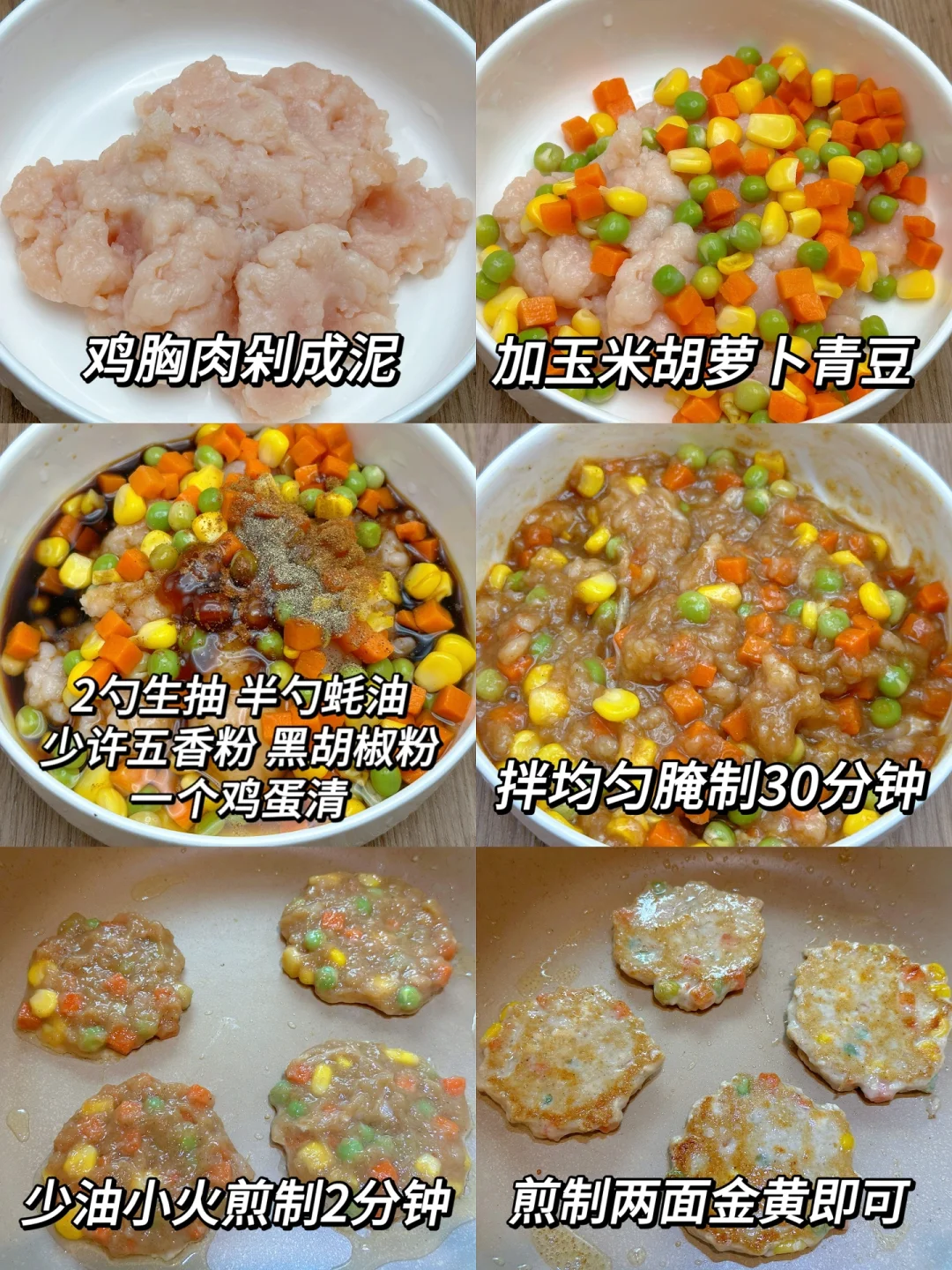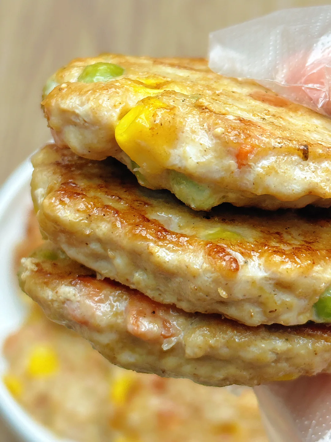🥗食材:鸡胸肉1块、玉米粒、青豆、胡萝卜(做了10个饼)