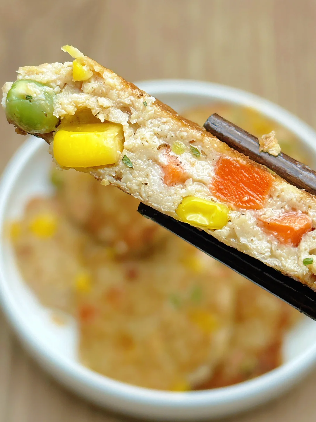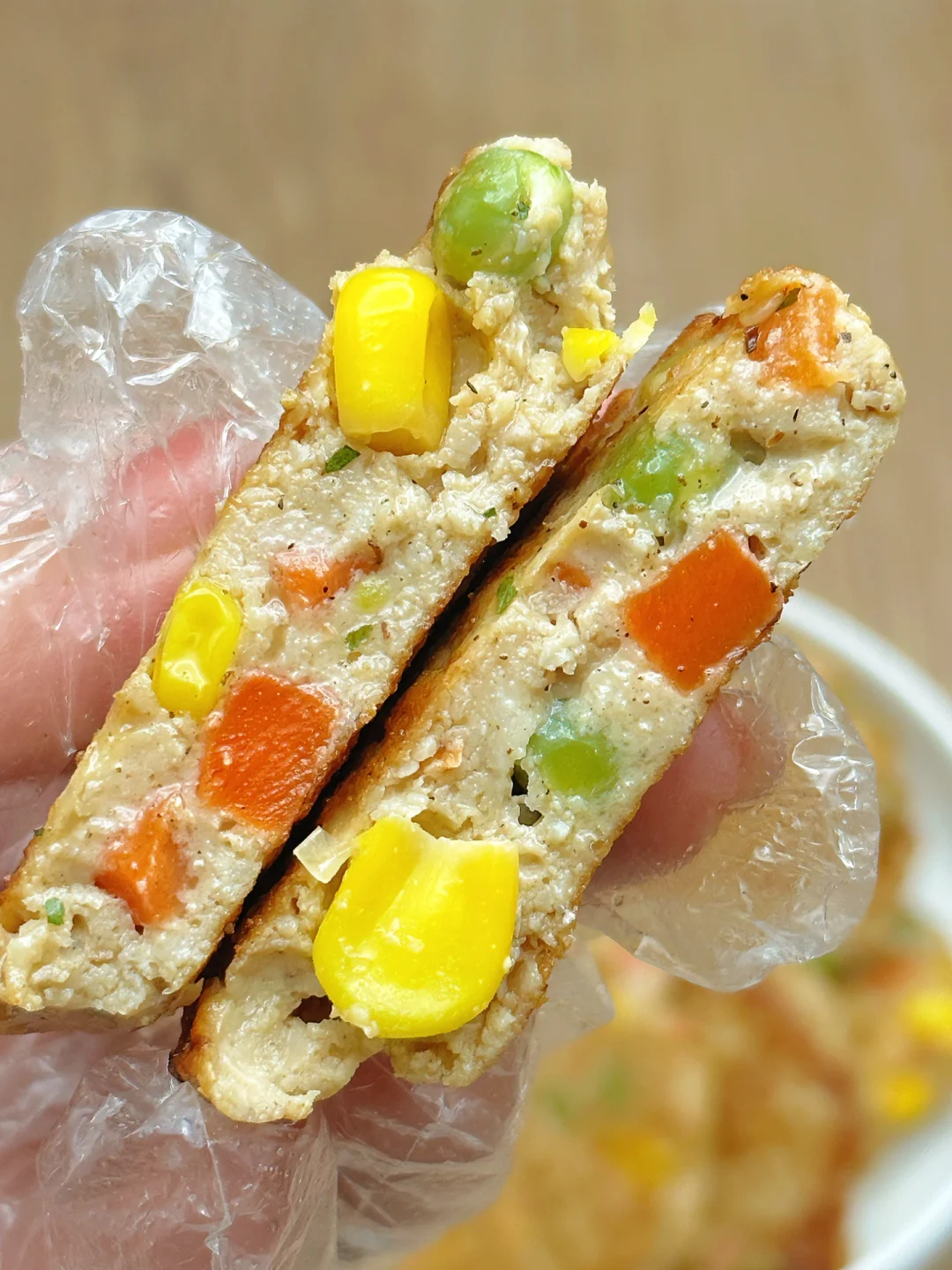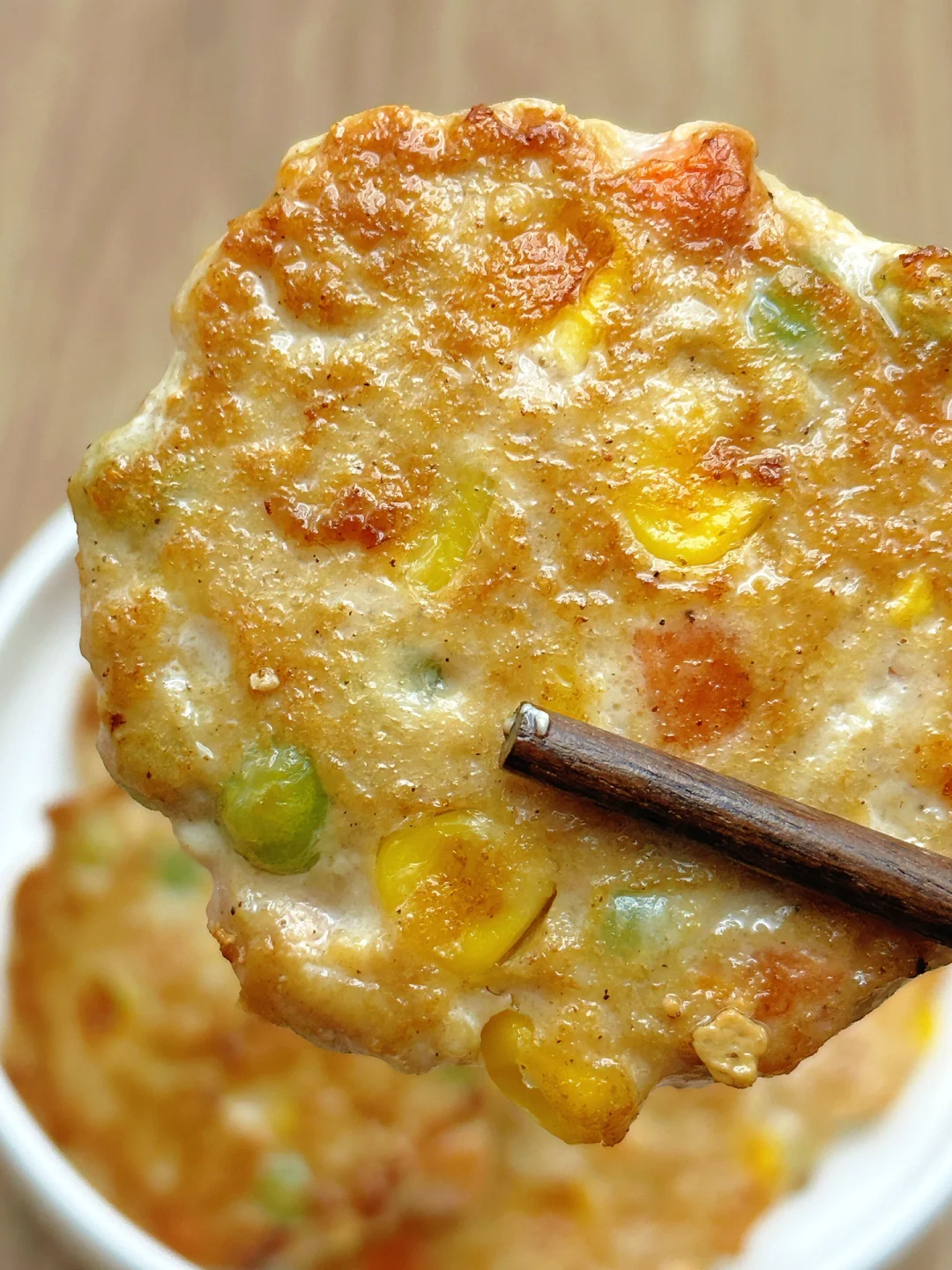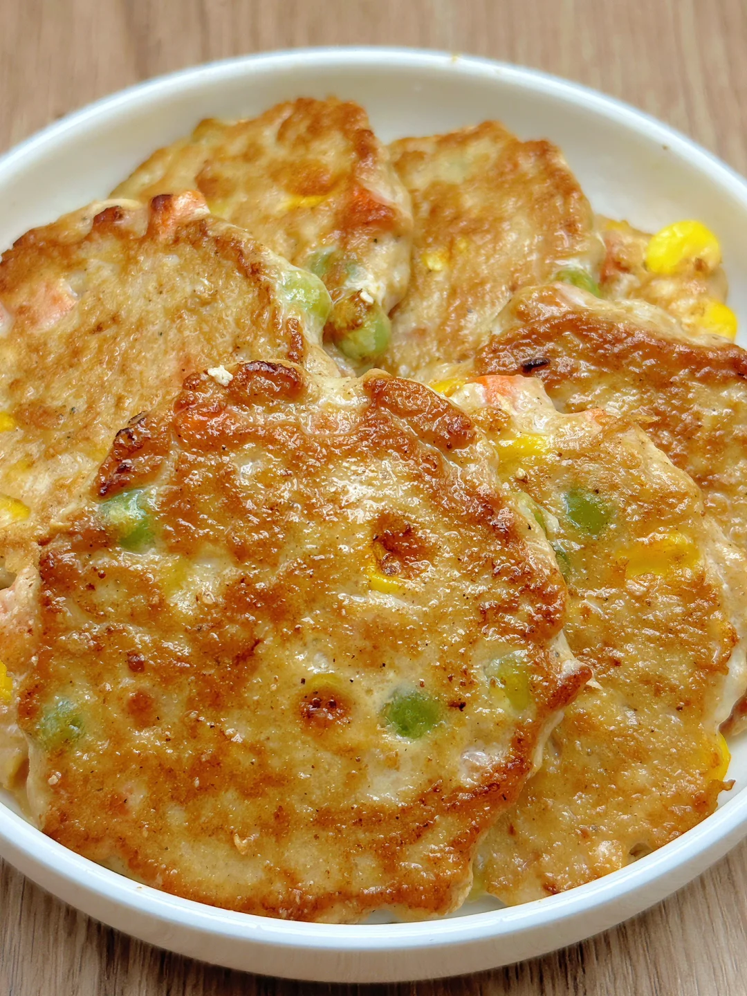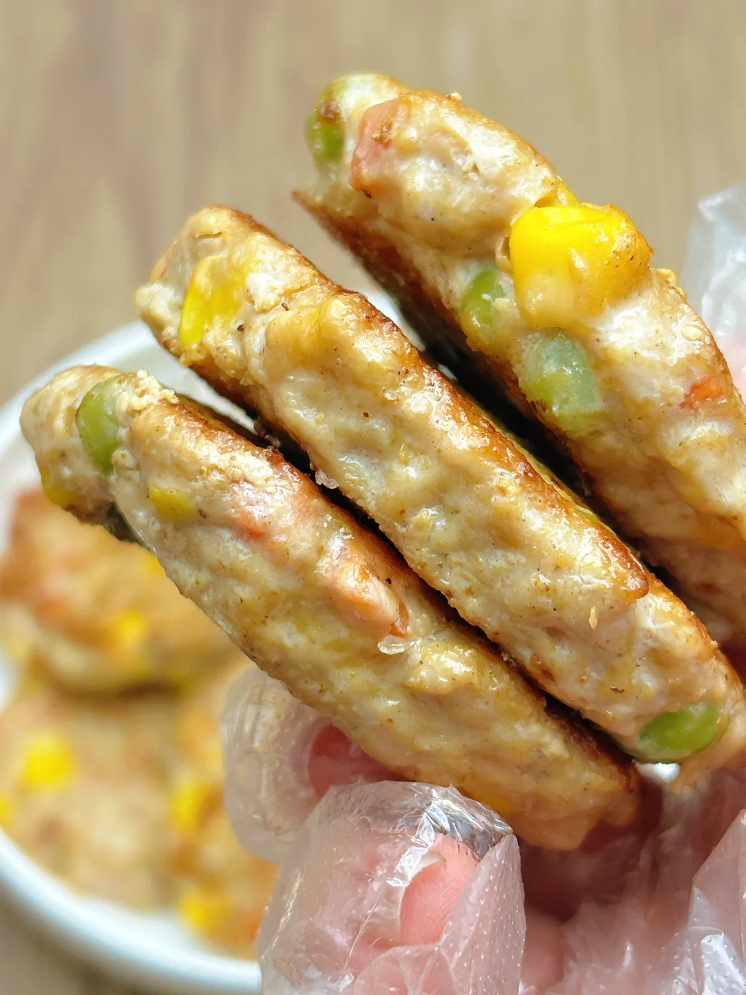 🥗食材:鸡胸肉1块、玉米粒、青豆、胡萝卜(做了10个饼)