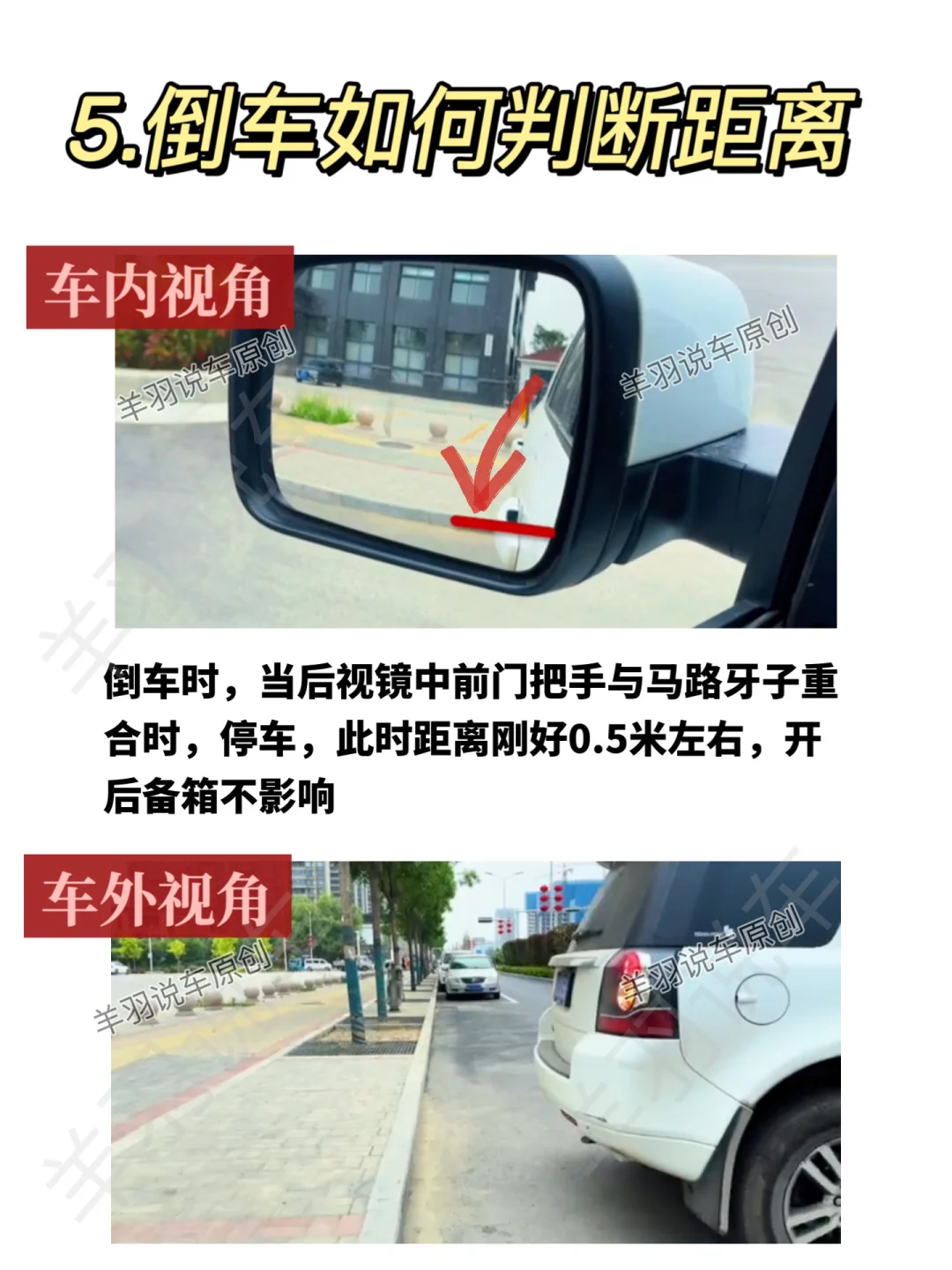 5⃣️往后倒车时,观察后视镜中前门把手,当门把手与马路牙子重合时,此时距离刚好0.5米,开后备箱不影响!